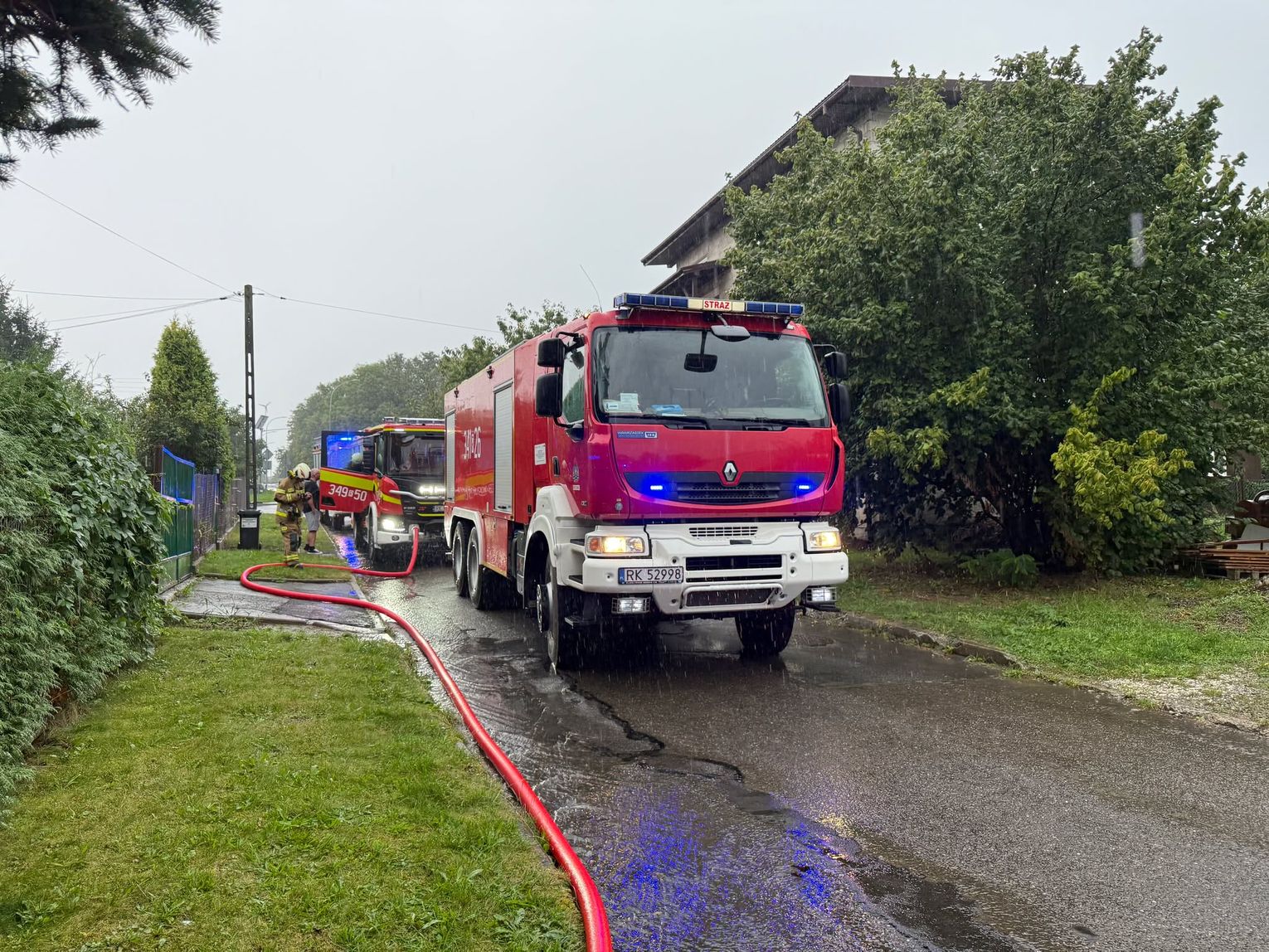 - JRG Krosno (GCBARt Scania, GCBA Renault, GBAPrRr MAN, GBARt Scania) - drugie zgłoszenie mówiło o pożarze dwóch budynków pod adresami ul. Guzikówka i bocznej ul. Małej.