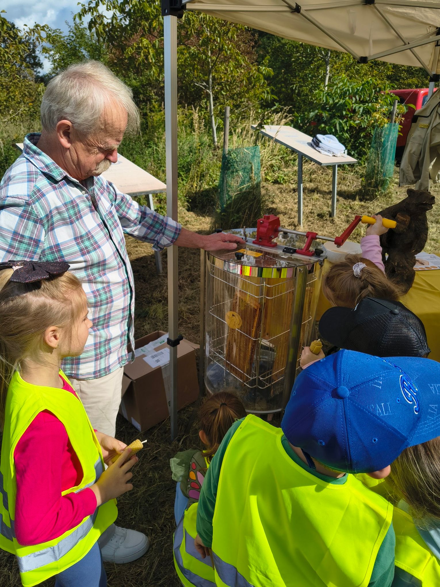 W dzisiejszym (18 września) miodobraniu uczestniczyły dzieci z grupy "Motylki" z Przedszkola Miejskiego nr 5 w Krośnie oraz uczniowie klasy IIa ze Szkoły Podstawowej nr 4 w Krośnie.
