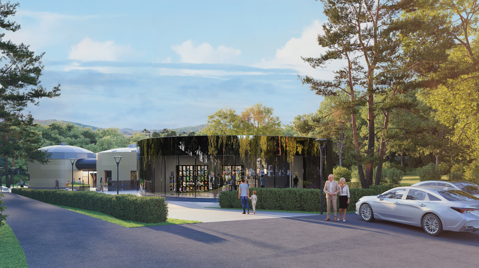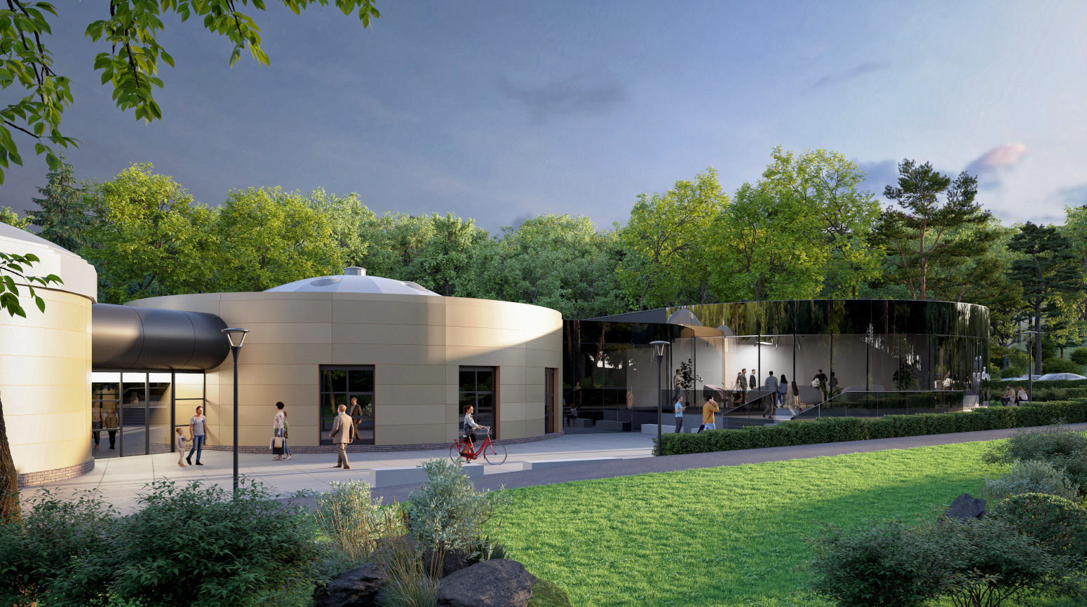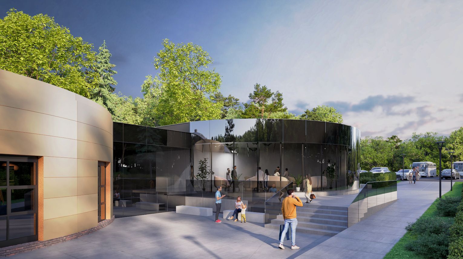 Przebudowany i rozbudowany zostanie budynek pawilonu muzealnego. W nowej, przeszklonej części urządzona będzie kasa biletowa, sklepik z pamiątkami, pomieszczenia ochrony i monitoringu obiektów, hall pełniący rolę poczekalni oraz pokój do pielęgnacji i wyciszenia. Na poziomie przyziemia zaprojektowano przestronne zaplecze sanitarne dla zwiedzających, pomieszczenie porządkowe oraz pomieszczenia techniczne i magazyny.