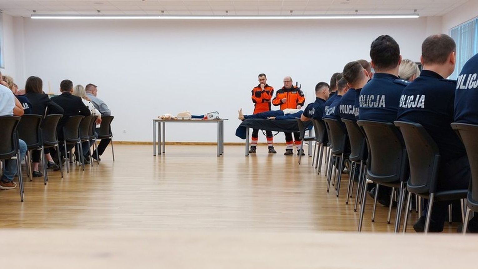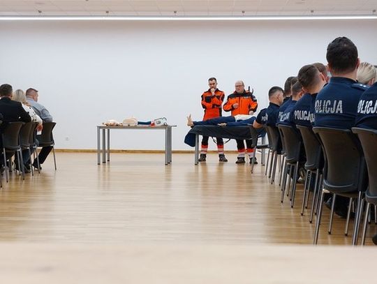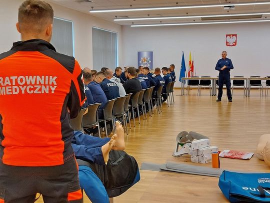 W drugiej części szkolenia policjanci skupili się na udzielaniu pierwszej pomocy. Pod okiem doświadczonych ratowników medycznych przećwiczyli m.in. prowadzenie resuscytacji krążeniowo–oddechowej oraz techniki zabezpieczania osób poszkodowanych do czasu przyjazdu służb ratunkowych.