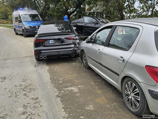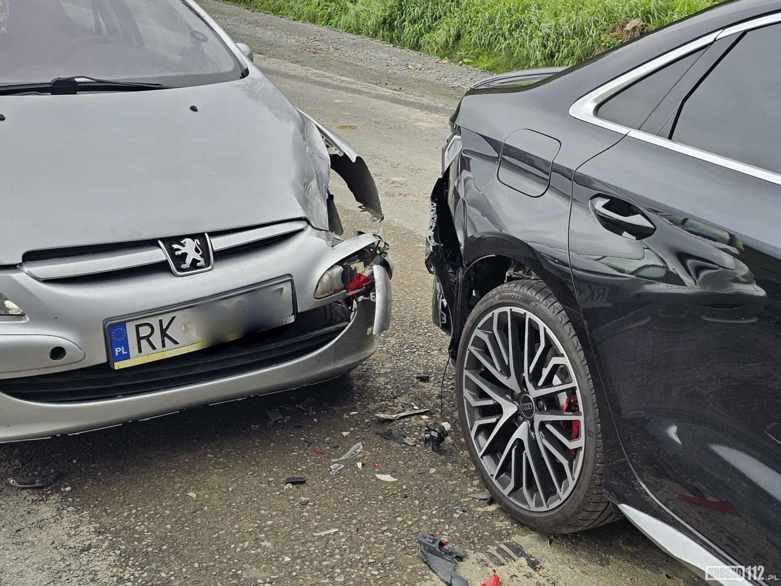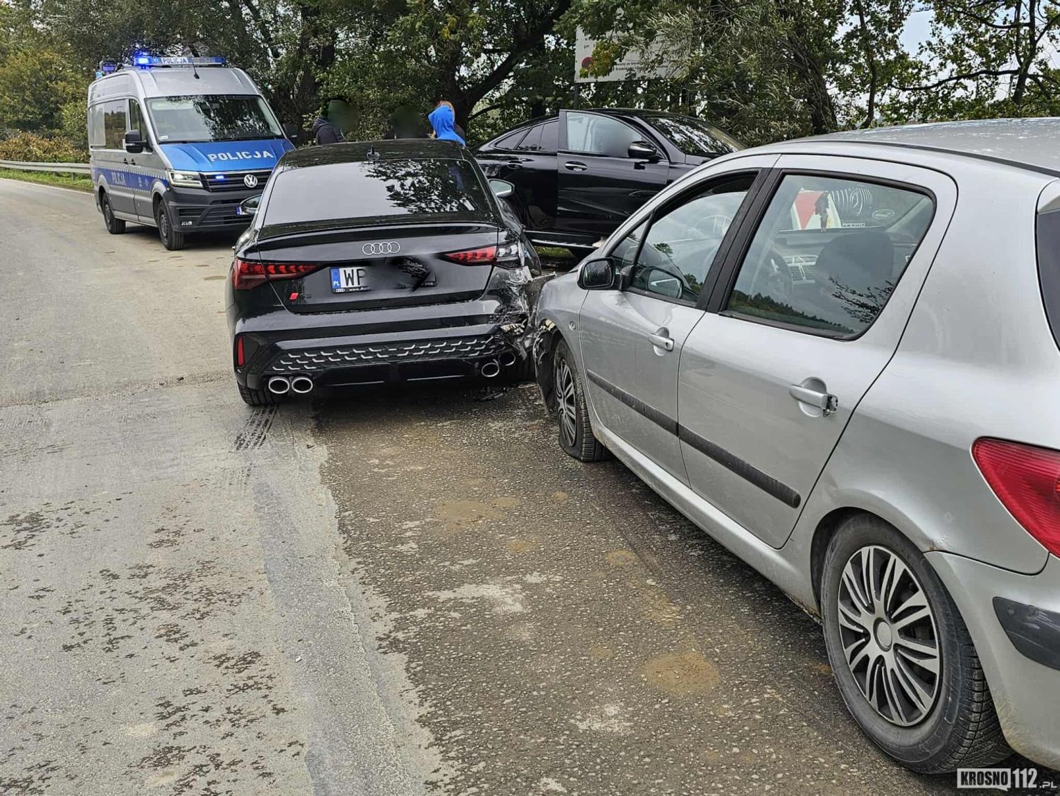 Kierujący Peugeotem najechał na tył Audi, którego kierowca wykonywał manewr hamowania. Kierowca Peugeota nie zachował bezpiecznej odległości od poprzedzającego pojazdu.