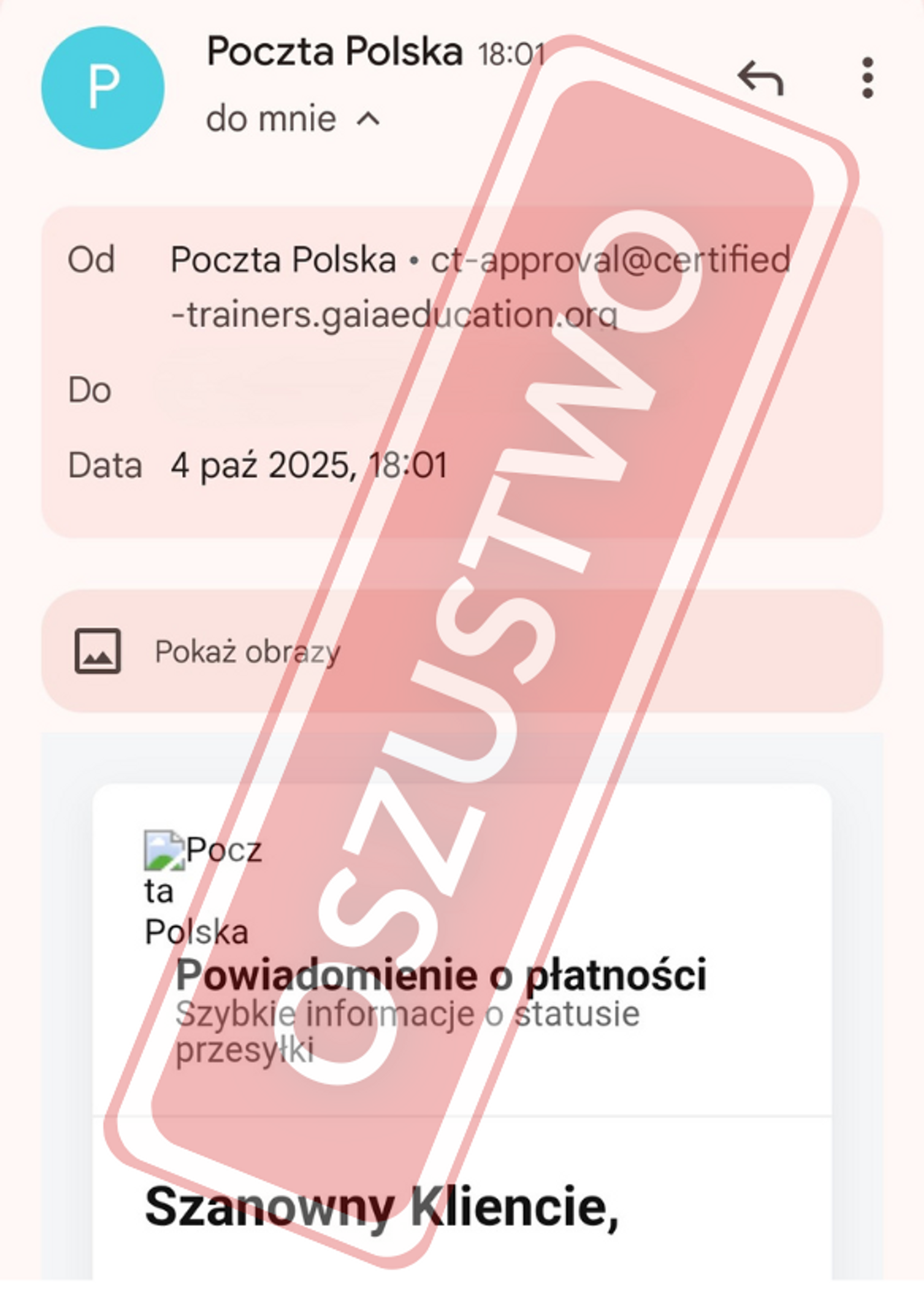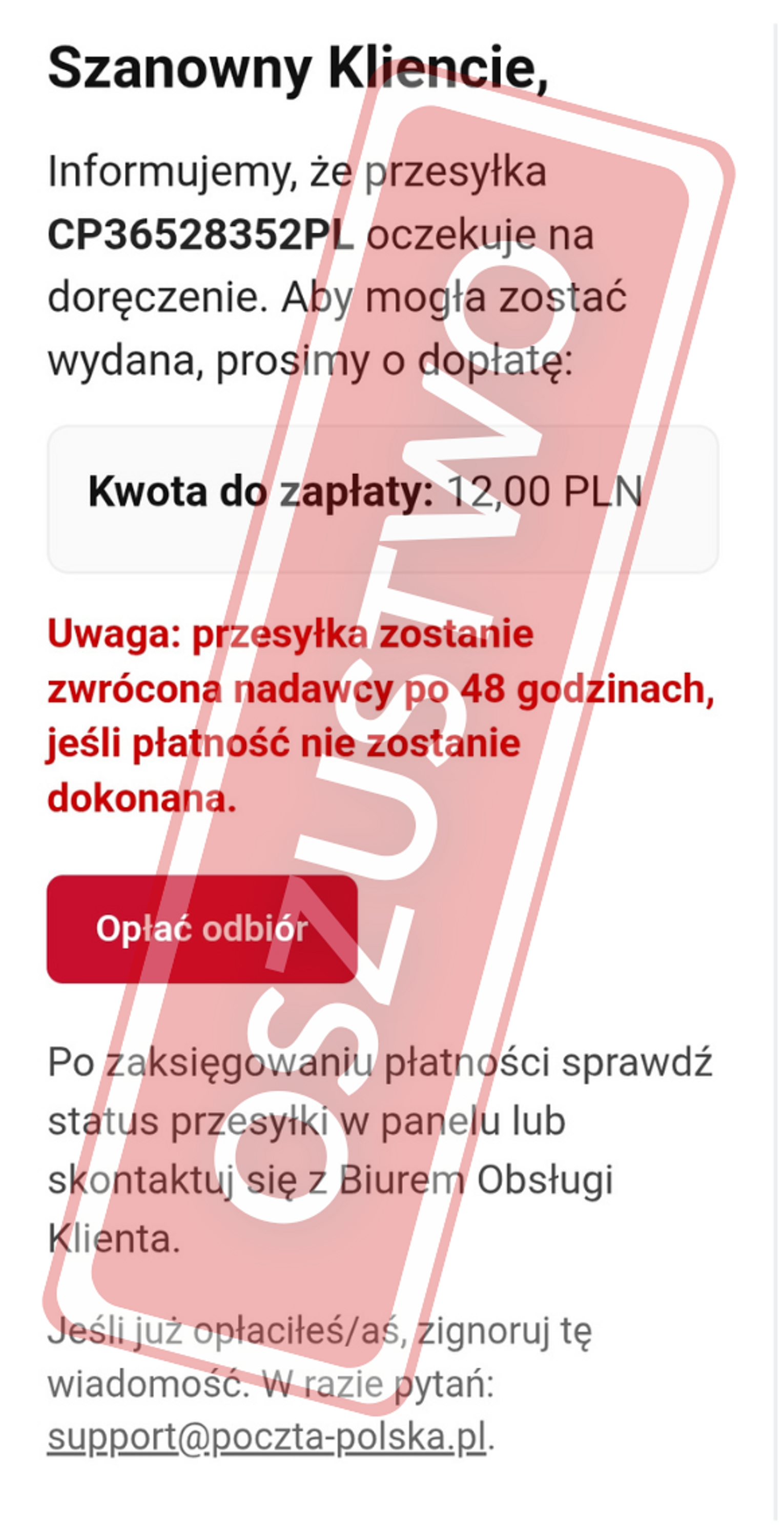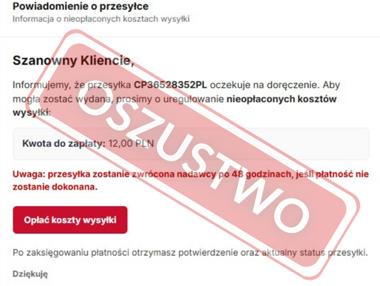 E-mail ma tytuł „Twoja paczka oczekuje”, a jego treść informuje o rzekomej konieczności uregulowania należności celem dostarczenia przesyłki. Kliknięcie w link może skutkować infekcją komputera, wyciekiem danych lub przejęciem konta bankowego.