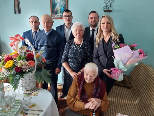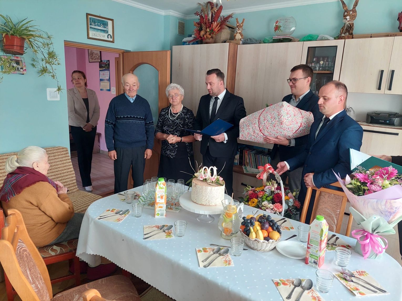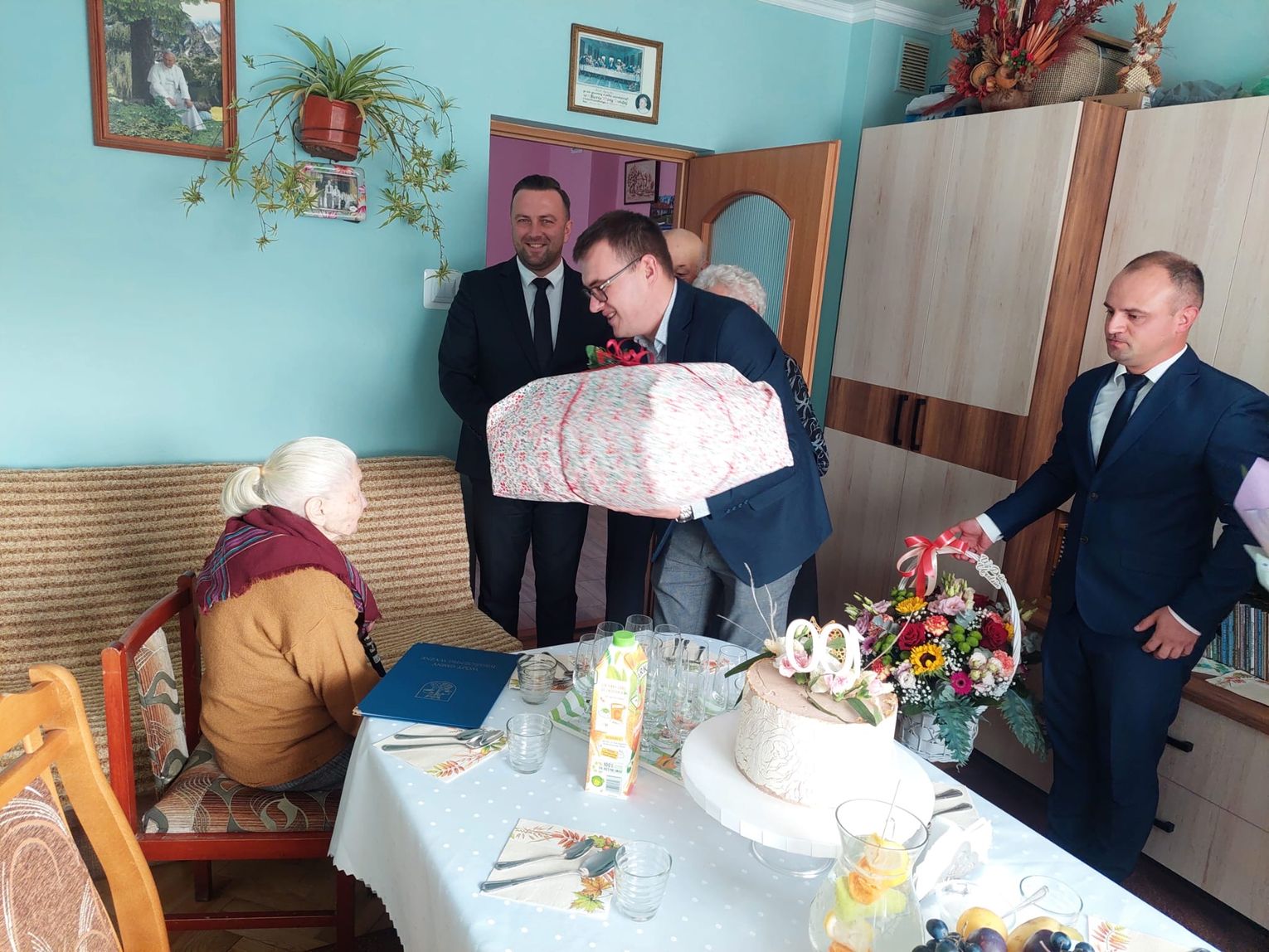 W imieniu władz gminy jubilatce pogratulował wójt Mateusz Liput, w towarzystwie Łukasza Lorensa – zastępcy wójta oraz Kacpra Sabika – zastępcy kierownika Urzędu Stanu Cywilnego, a także pani Daria Balon z Kasy Rolniczego Ubezpieczenia Społecznego.