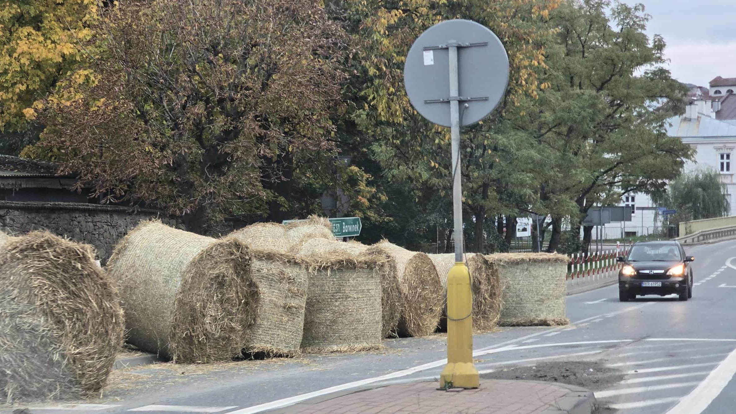 Na jezdnię i pobliski chodnik na skrzyżowaniu z naczepy ciężarówki wypadło ponad 10 balotów siana.