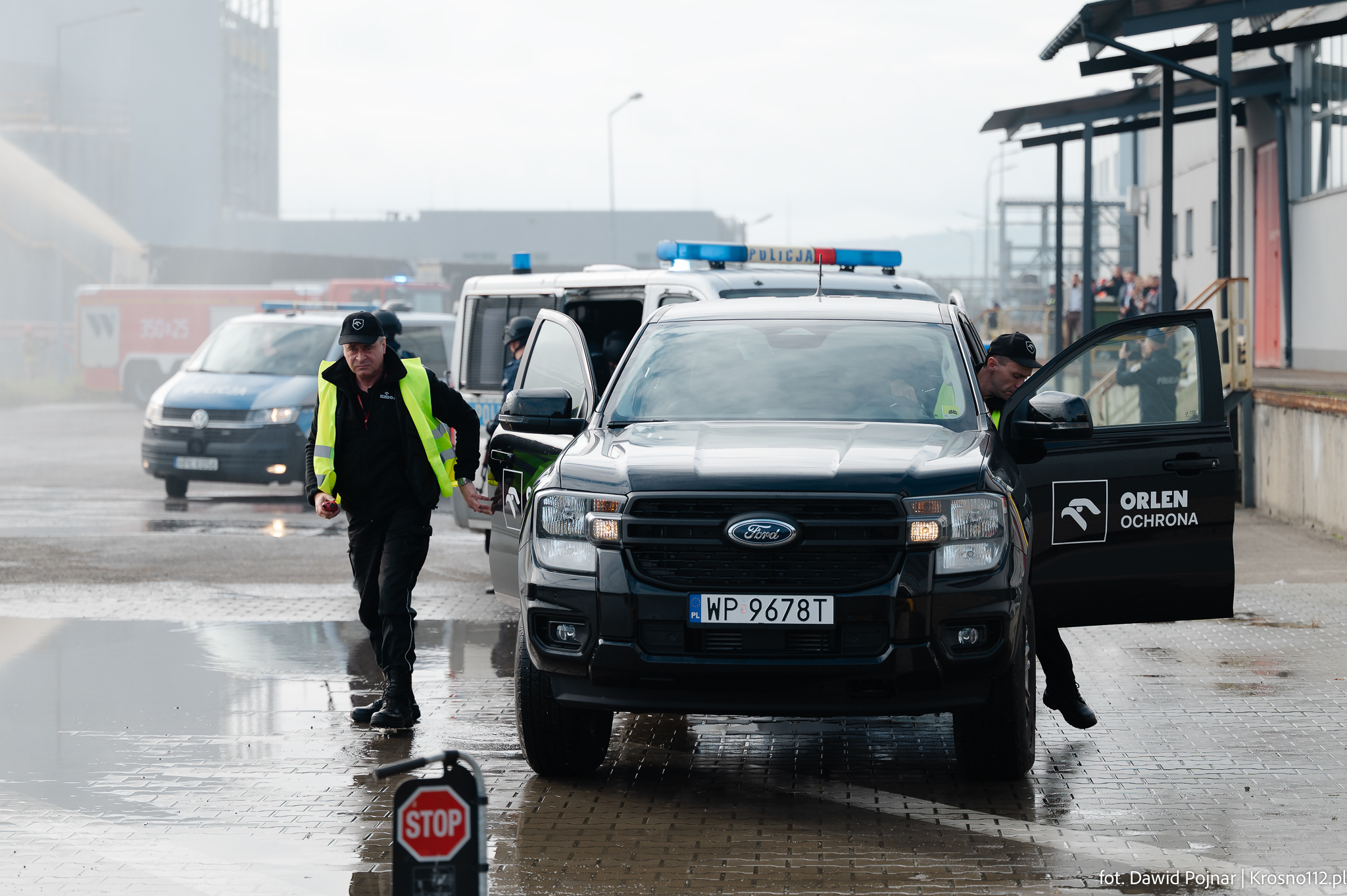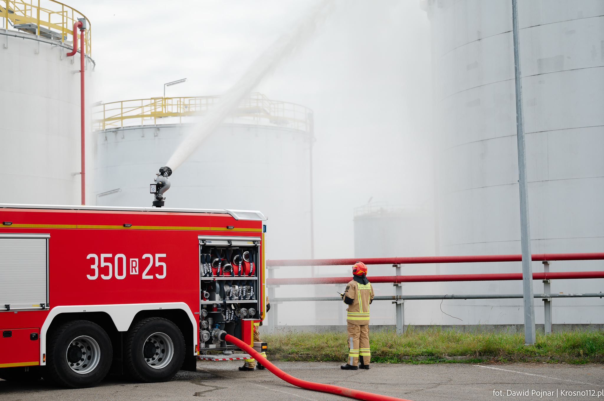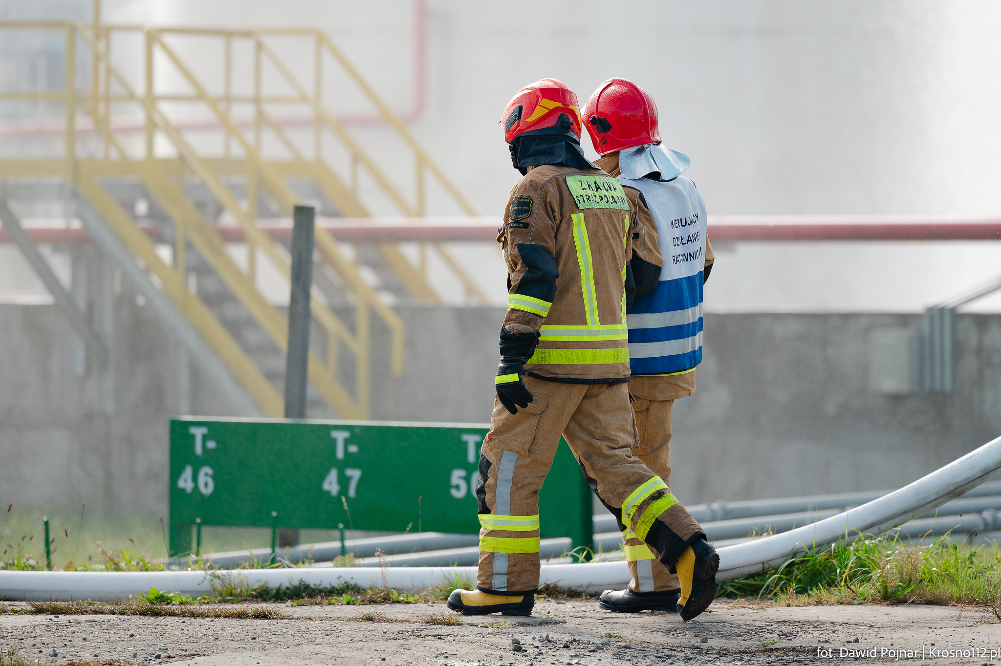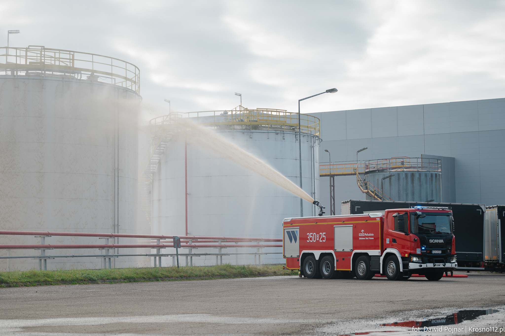 Kolejnym etapem było uruchomienie drona z atrapą ładunku wybuchowego, którym pozorant sterował w kierunku zbiornika przeznaczonego do magazynowania łatwopalnych rozpuszczalników. Po „uderzeniu” drona w zbiornik wywołano kontrolowaną symulację pożaru i eksplozji, co pozwoliło przetestować skuteczność procedur bezpieczeństwa i współpracy między służbami zakładowymi a zewnętrznymi.