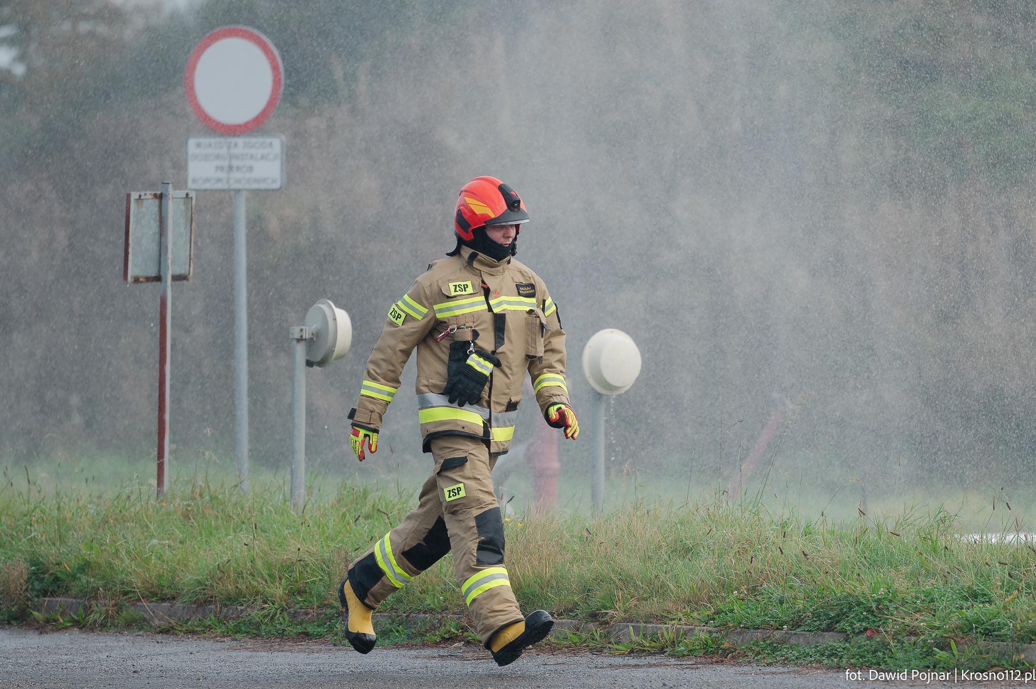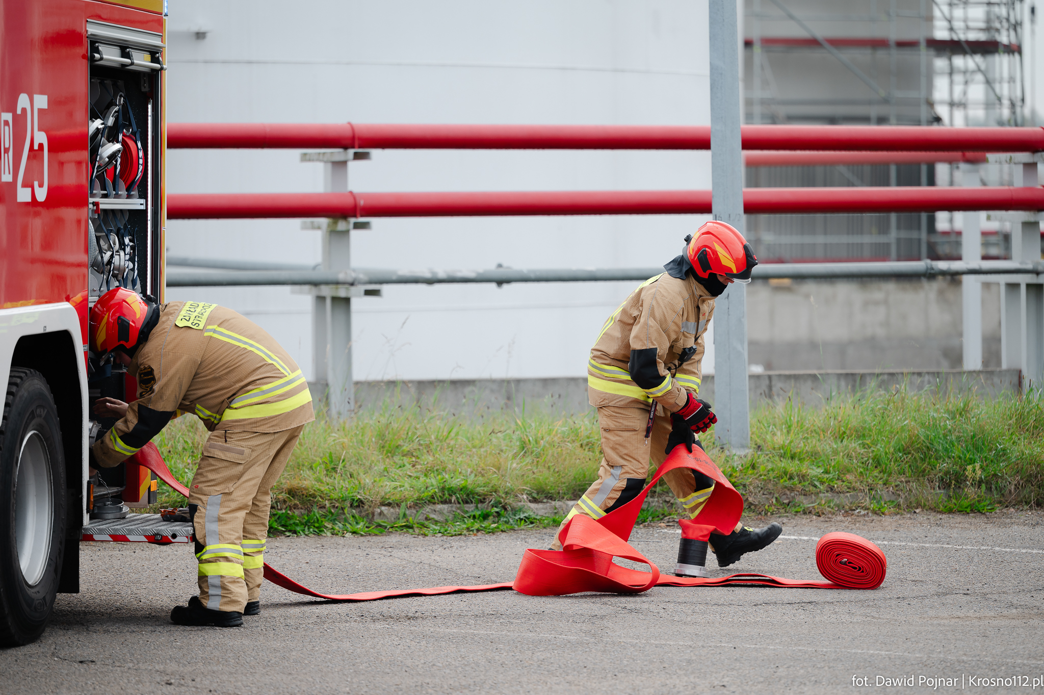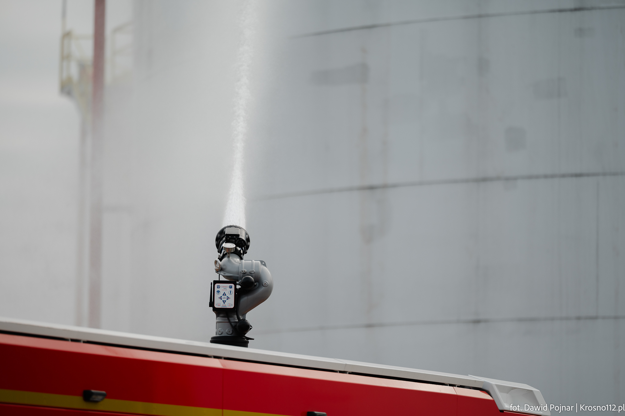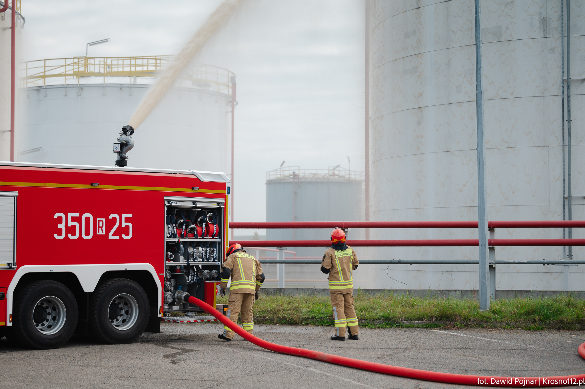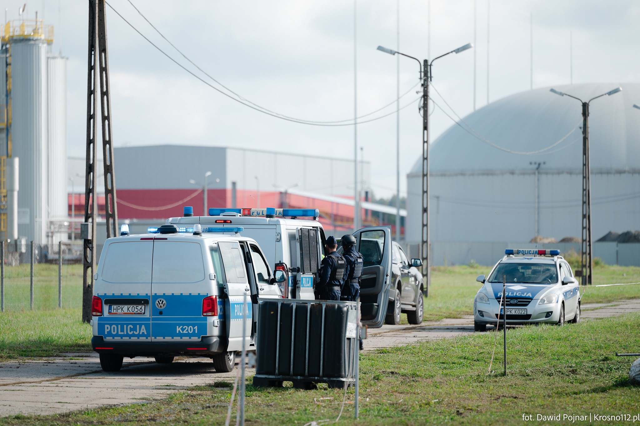 Kolejnym etapem było uruchomienie drona z atrapą ładunku wybuchowego, którym pozorant sterował w kierunku zbiornika przeznaczonego do magazynowania łatwopalnych rozpuszczalników. Po „uderzeniu” drona w zbiornik wywołano kontrolowaną symulację pożaru i eksplozji, co pozwoliło przetestować skuteczność procedur bezpieczeństwa i współpracy między służbami zakładowymi a zewnętrznymi.