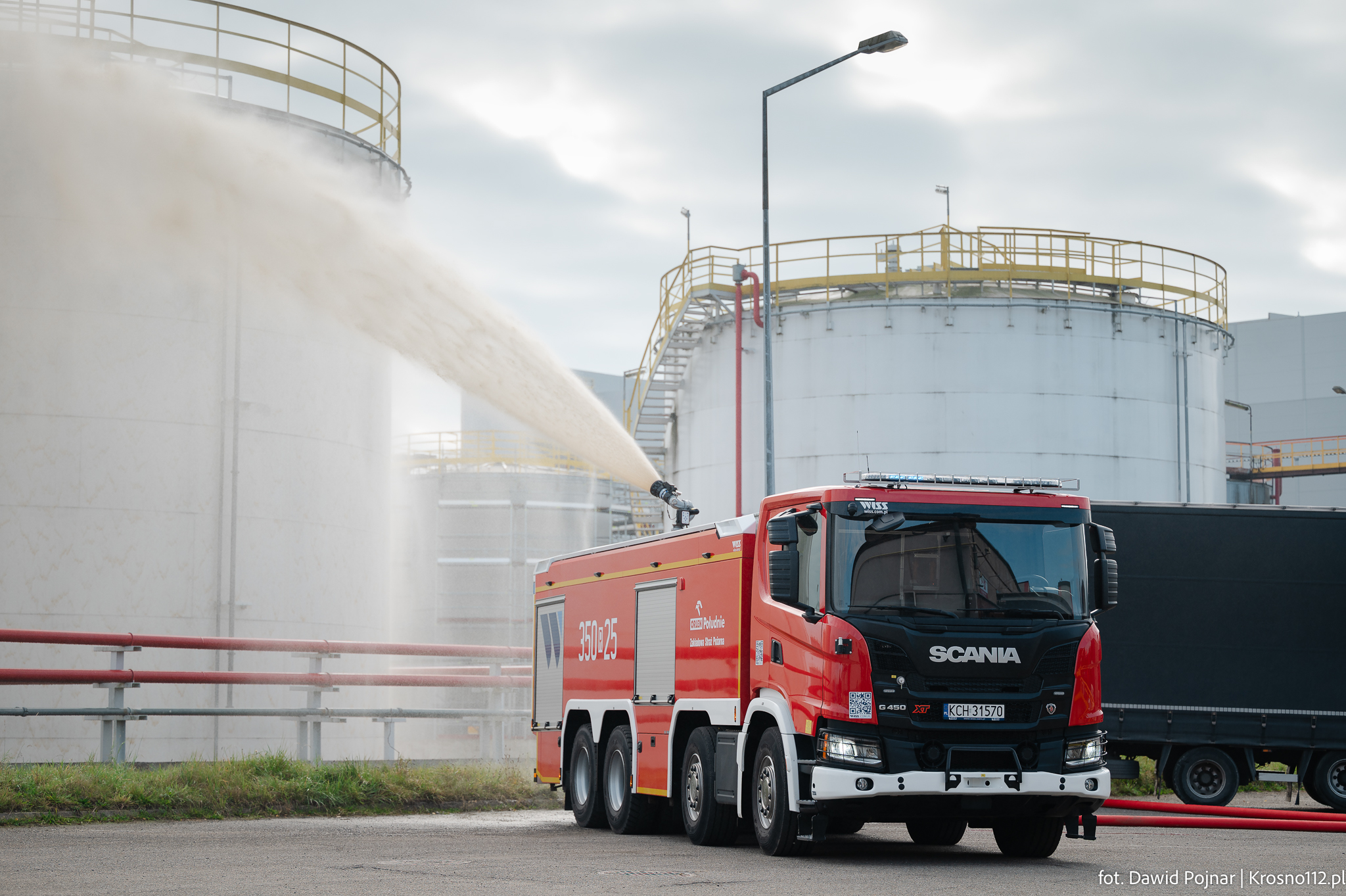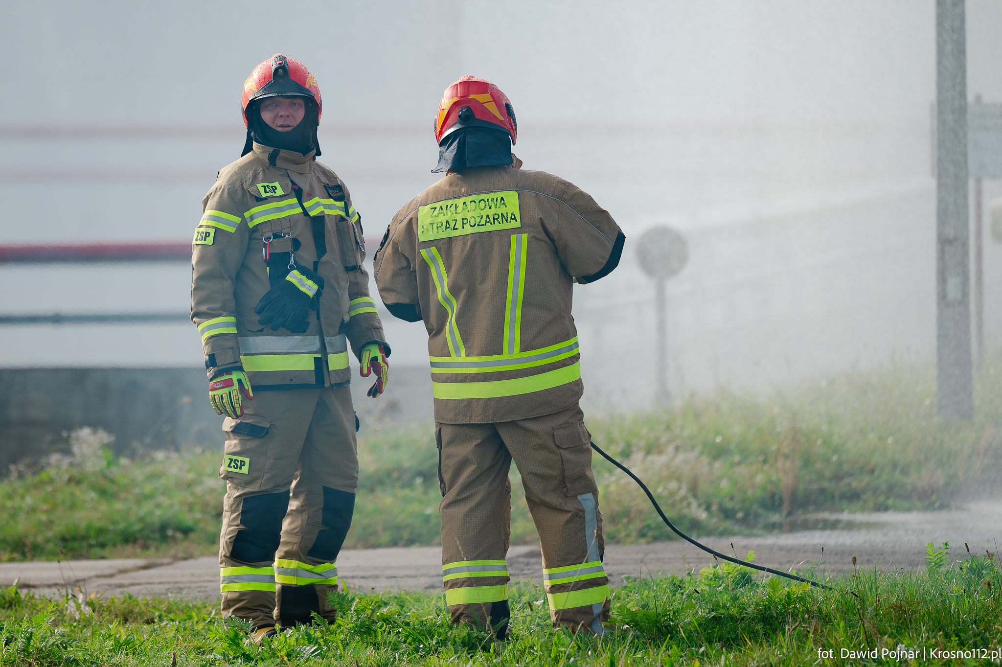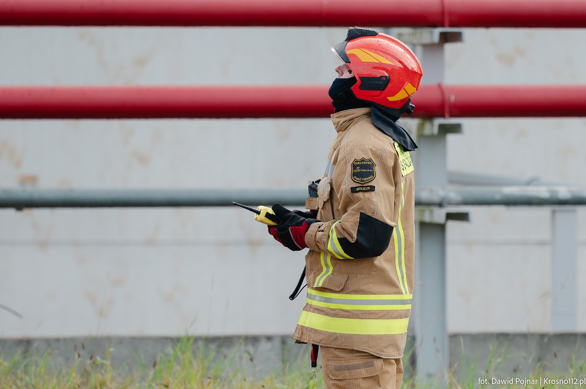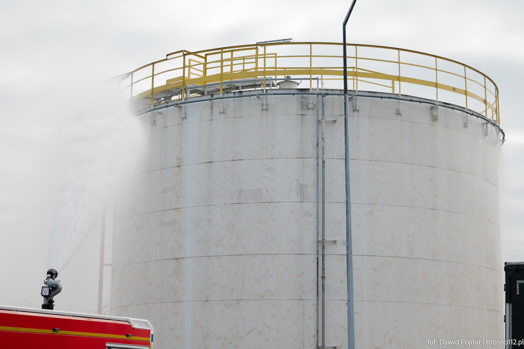 Kolejnym etapem było uruchomienie drona z atrapą ładunku wybuchowego, którym pozorant sterował w kierunku zbiornika przeznaczonego do magazynowania łatwopalnych rozpuszczalników. Po „uderzeniu” drona w zbiornik wywołano kontrolowaną symulację pożaru i eksplozji, co pozwoliło przetestować skuteczność procedur bezpieczeństwa i współpracy między służbami zakładowymi a zewnętrznymi.