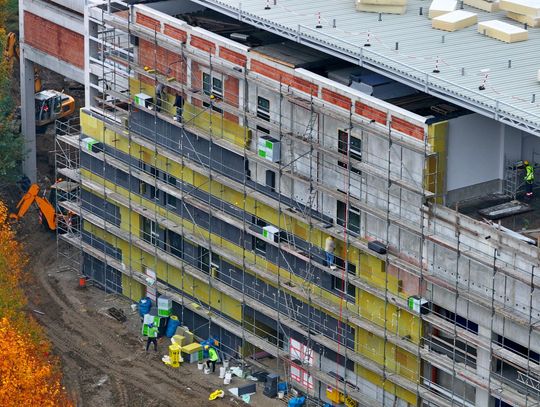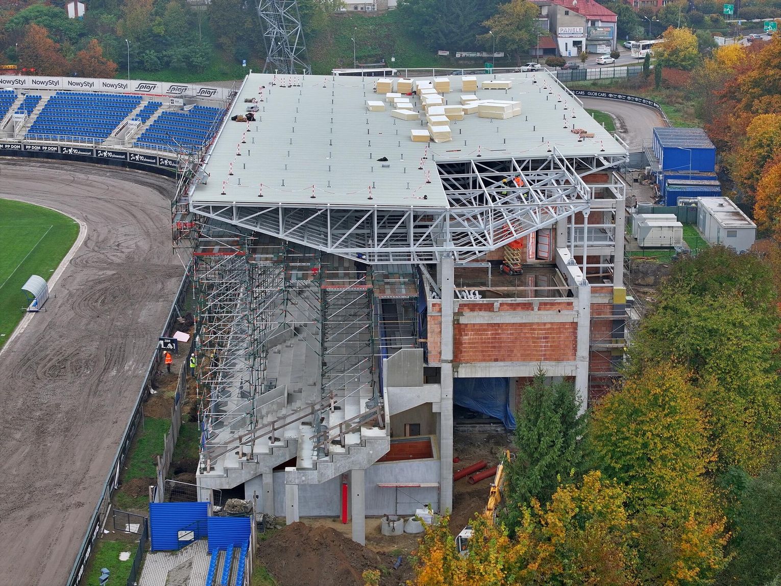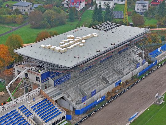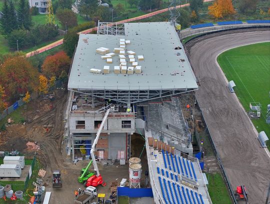 W ostatnich tygodniach na nowobudowanej trybunie krytej w Krośnie zamontowano niemal całe poszycie dachowe z blachy trapezowej. Wkrótce wykonawca przystąpi do montażu ozdobnych, płytowych elementów wykończeniowych, które nadadzą konstrukcji ostateczny wygląd. W części administracyjnej zamontowano już okna i rozpoczęto ocieplanie budynku, natomiast wokół trybuny trwają prace ziemne. W najbliższych tygodniach planowane jest zakończenie budowy dachu oraz rozpoczęcie montażu krzesełek i budowy dróg dojazdowych, co stopniowo zbliża inwestycję do finału.