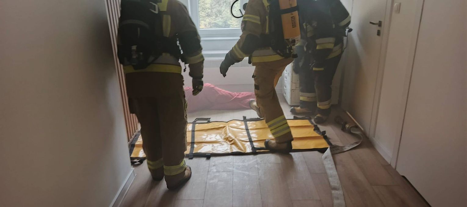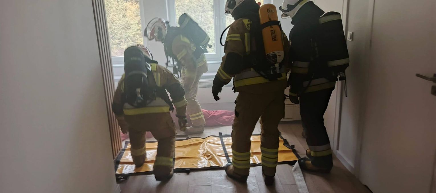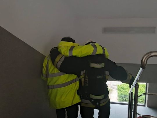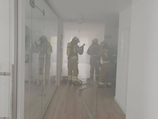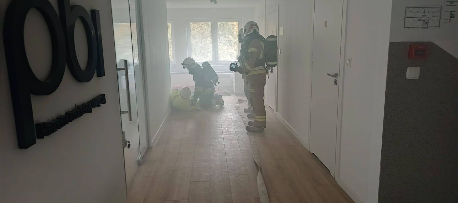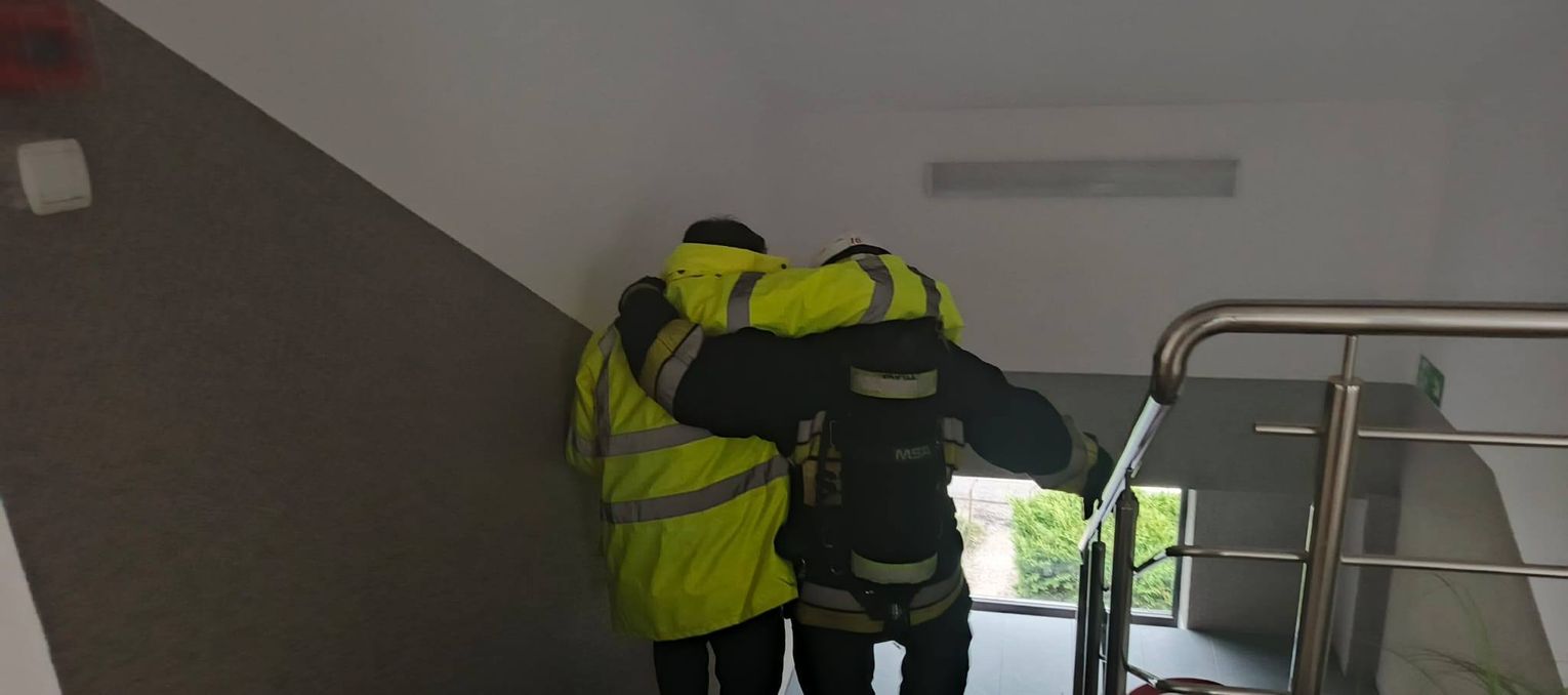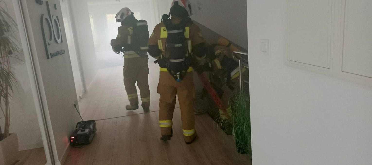 - Próbnej ewakuacji budynku biurowego, w którym doszło do pożaru – wewnątrz znajdowały się dwie osoby wymagające szybkiej ewakuacji,