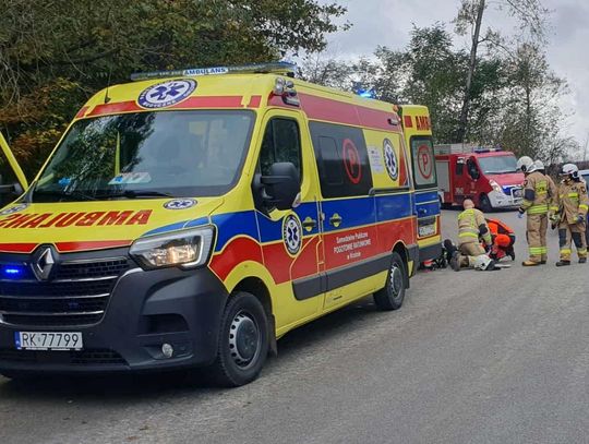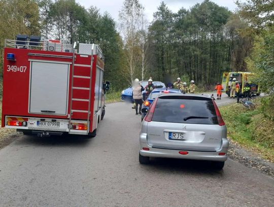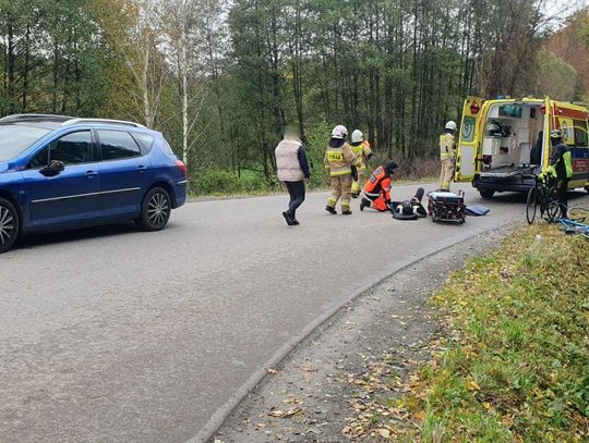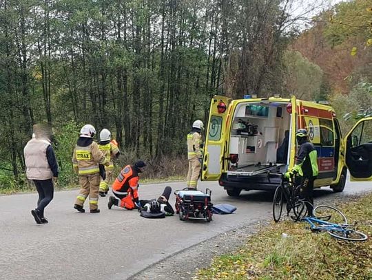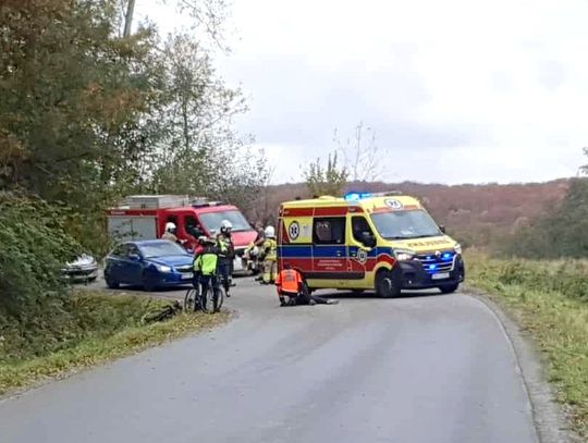Rowerzysta został przewieziony do szpitala. Wstępnie ustalono, że kierujący rowerem na łuku drogi zjechał na przeciwny pas i zderzył się z samochodem.
