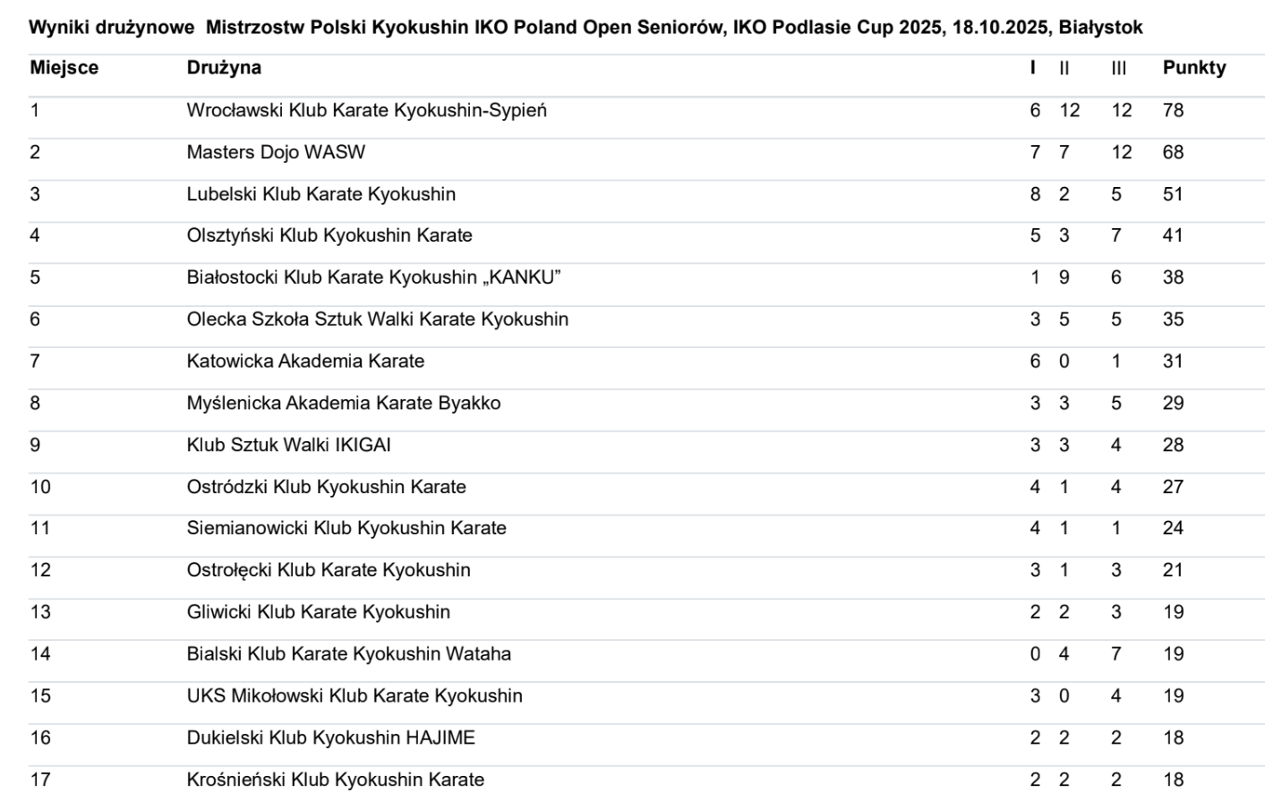 Podczas Mistrzostw Polski Kyokushin IKO Poland Dukielski KK Hajime oraz Krośnieński KK Karate uplasowały się ex aequo w klasyfikacji drużynowej z tą samą ilością pucharów i punktów i tym samym to najlepsze drużyny z województwa podkarpackiego.