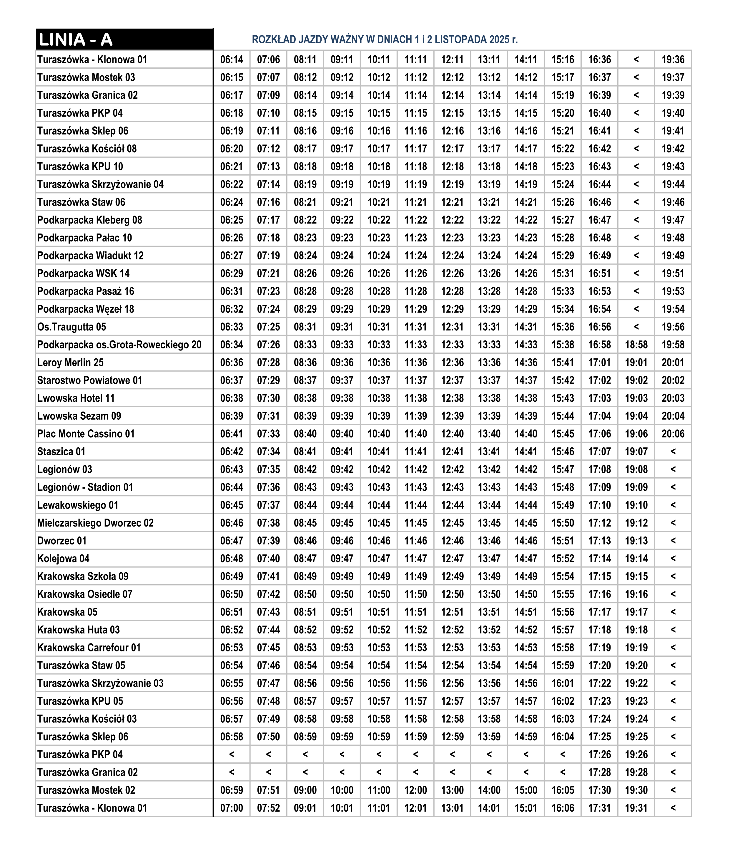 Autobusy na linii „A” będą kursować zgodnie z sobotnim rozkładem jazdy.