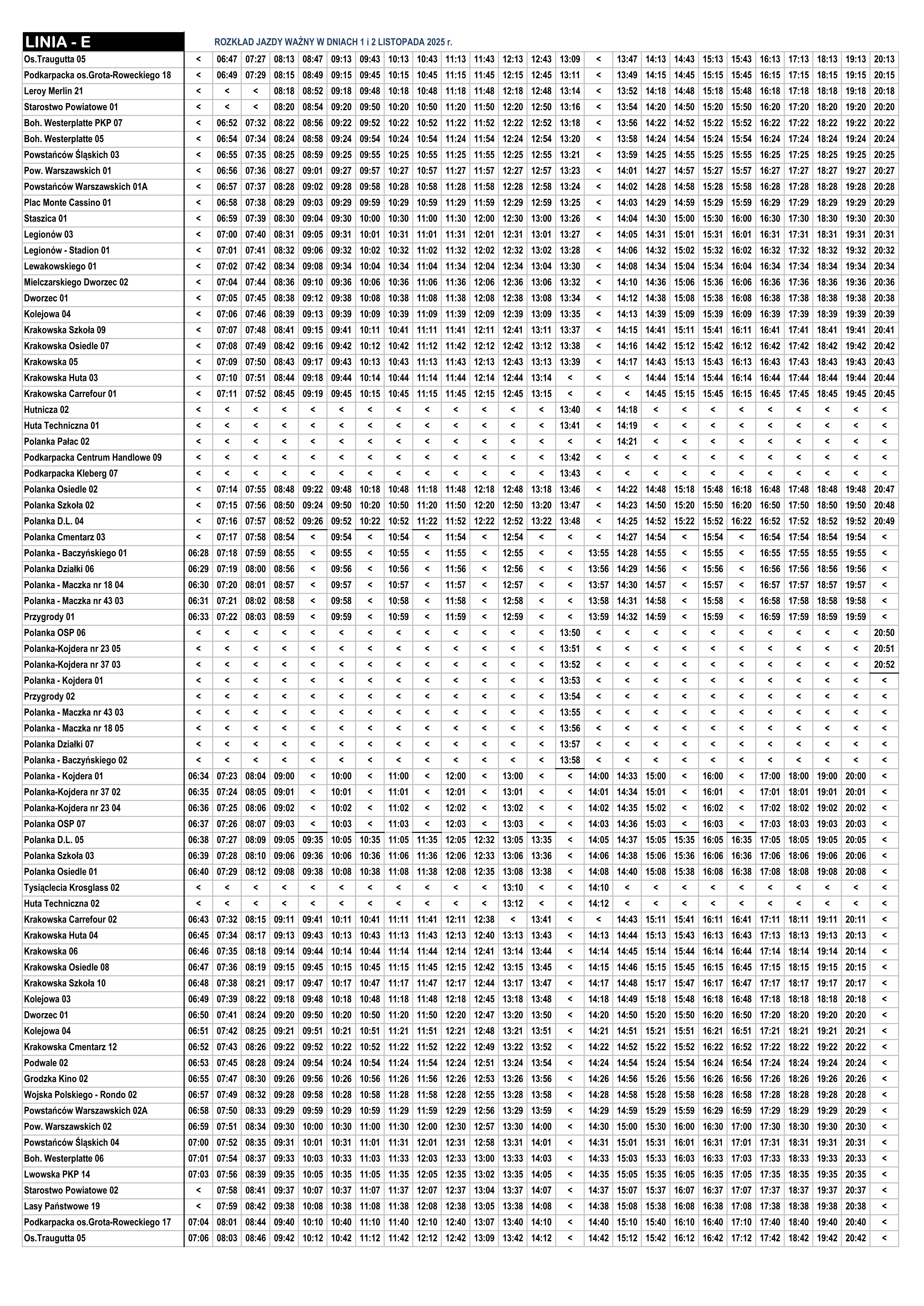 Linia „E” będzie kursowała na swojej regularnej trasie (os. Traugutta – Boh. Westerplatte – pl. Monte Cassino – Dworzec Autobusowy – Krakowska – Os. Polanka) według specjalnego rozkładu jazdy obowiązującego w dniach 1 i 2 listopada.