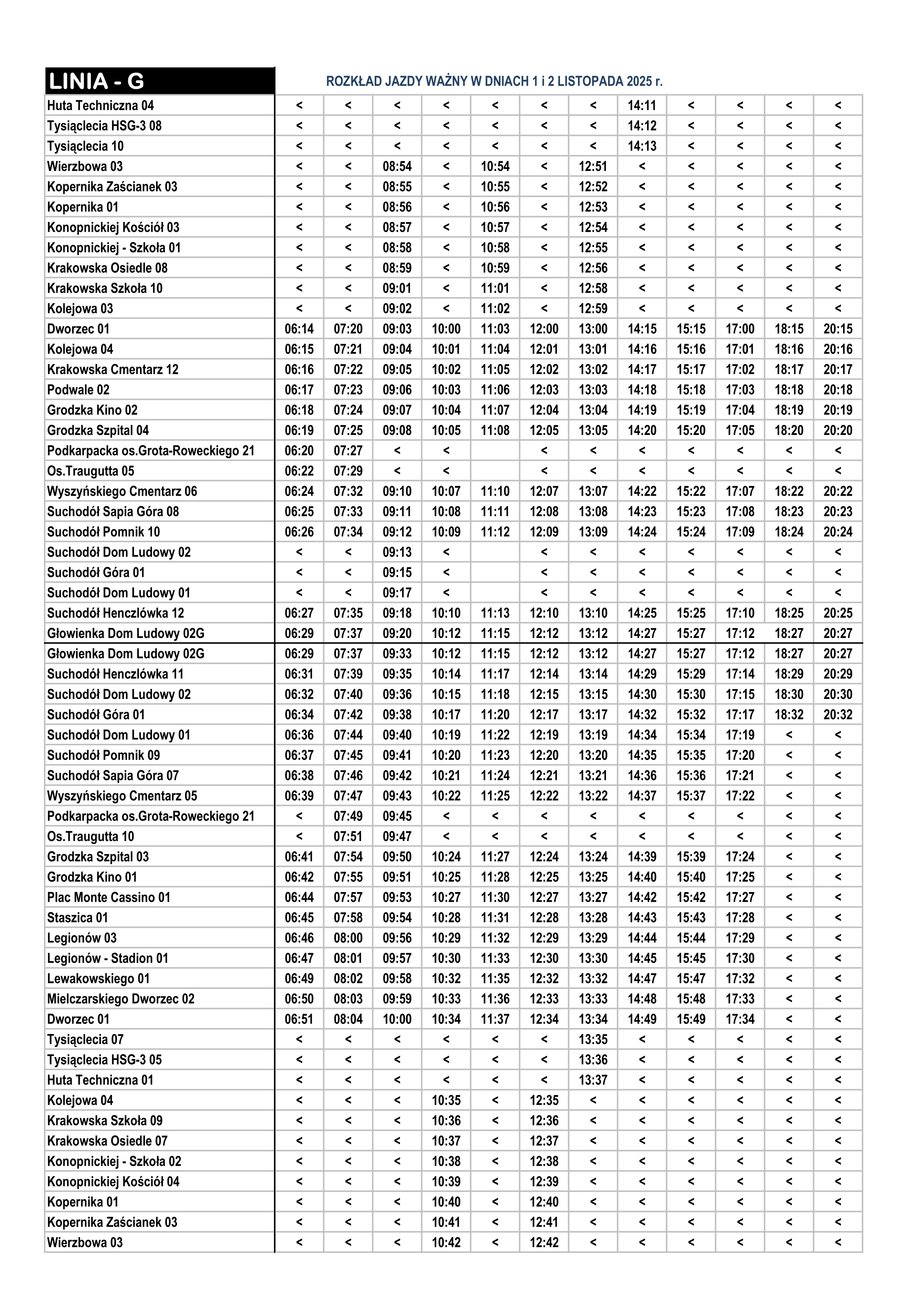 Na linii „G” autobusy będą jeździć zgodnie z sobotnim rozkładem jazdy. Dodatkowo wykonane będą kursy z przystanku Traugutta o godz. 06:22 i 07:29 w kierunku ul. Wyszyńskiego oraz kursy powrotne z przystanku Wyszyńskiego Cmentarz o godz. 07:47 i 09:43.