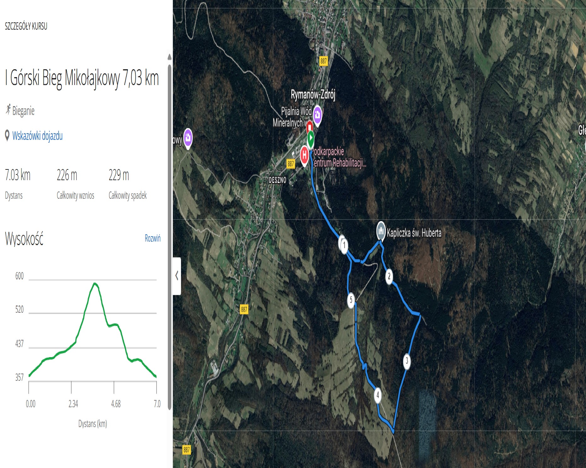 Trasa biegu ma 7 kilometrów i przewyższenie 230 metrów. Uczestnicy przebiegną obok leśniczówki, kapliczki Św. Huberta, nowej wieży dla nietoperzy do końca składu na drewno. Tam trzeba będzie skręcić w prawo w kierunku czerwonego szlaku, którym później mijając pozostałości wsi Wołtuszowa, zbiegną z powrotem do Rymanowa-Zdroju.