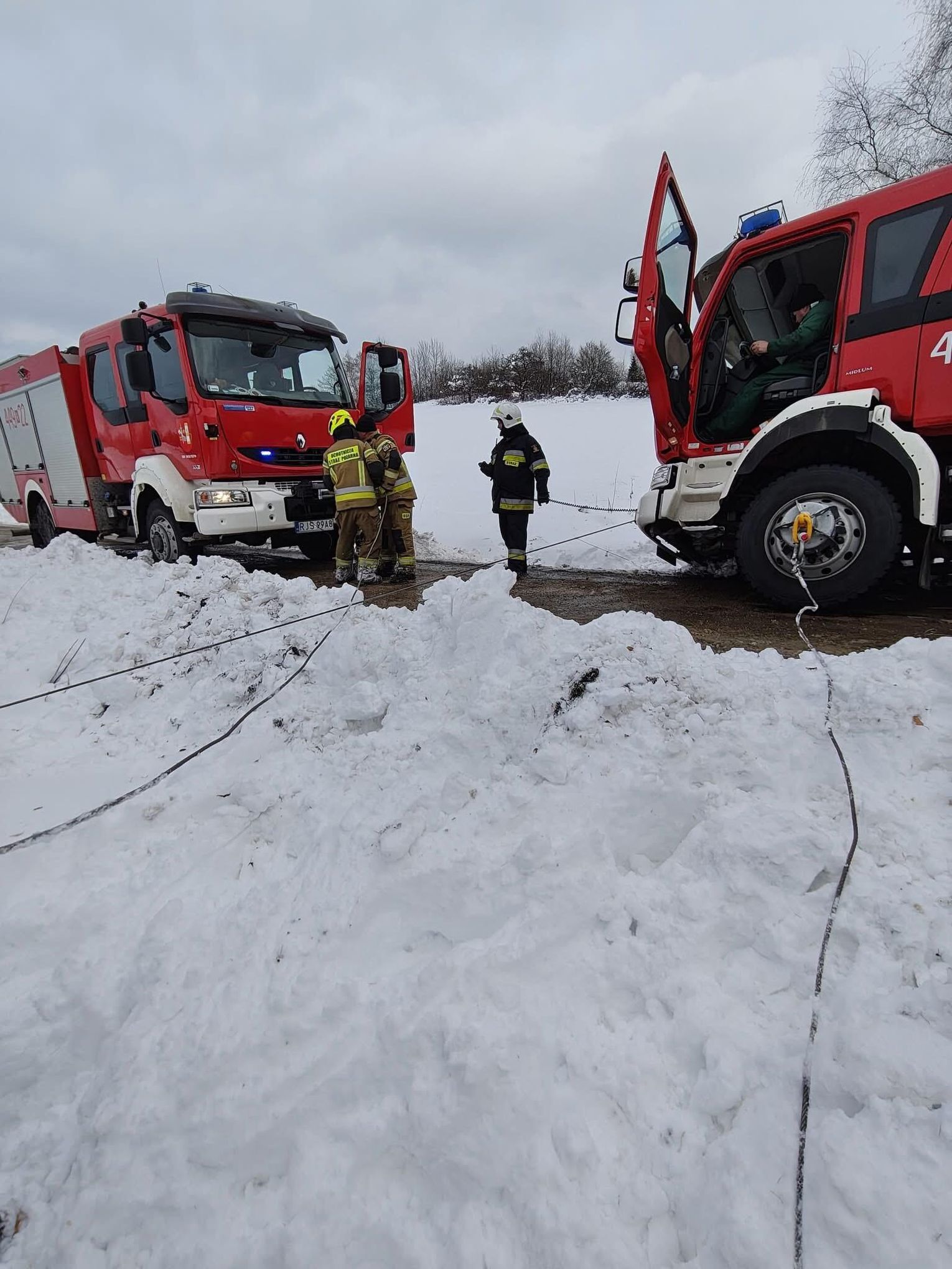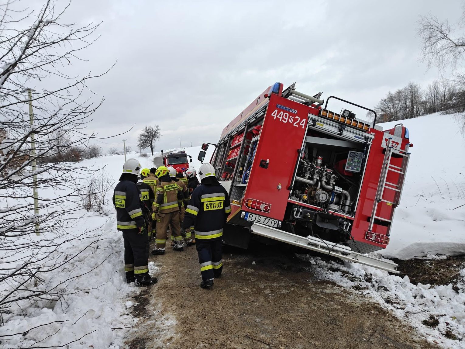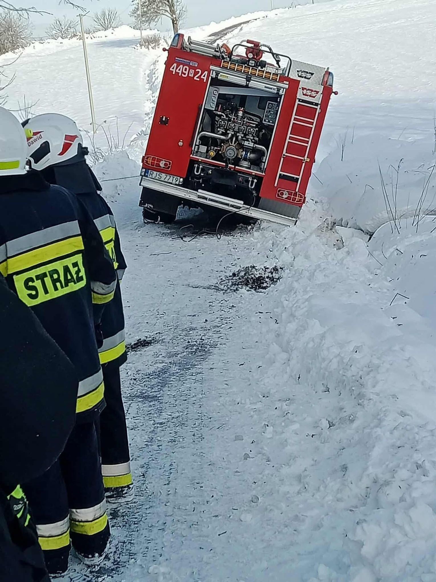 Na miejsce natychmiast skierowano druhów z OSP KSRG Pusta Wola, OSP KSRG Skołyszyn oraz lekki zastęp z OSP KSRG Harklowa. Pomimo podjętych prób, lokalne jednostki nie były w stanie wyciągnąć zakleszczonego wozu. Z uwagi na skalę utrudnień, do działań zadysponowano ciężki samochód ratownictwa drogowego z JRG PSP Krosno (341[R]49 MegaCity Volvo), który wchodzi w skład Specjalistycznej Grupy Ratownictwa Technicznego. Na miejsce dotarł również dowódca JRG PSP Jasło zastępem nr 91.