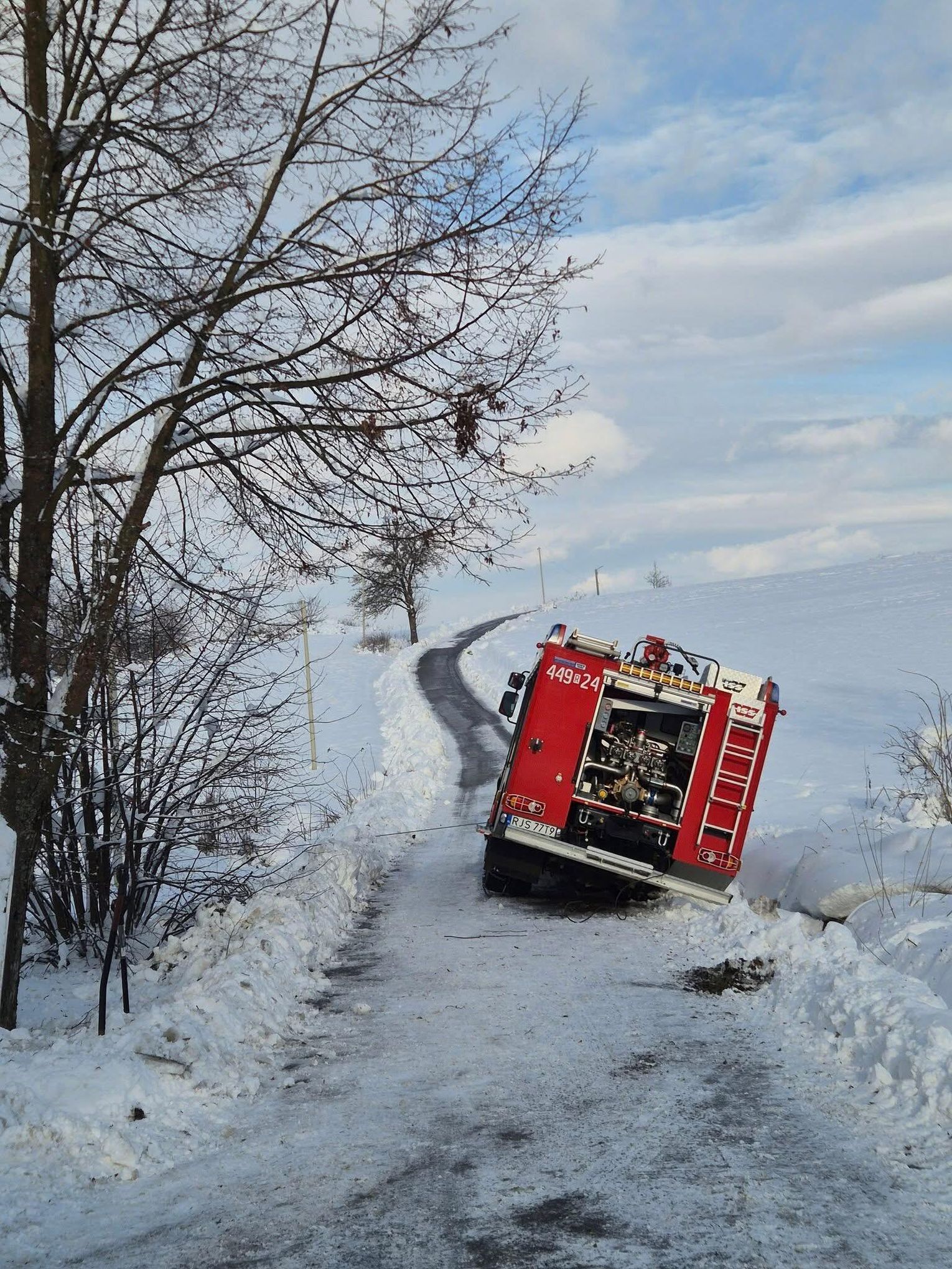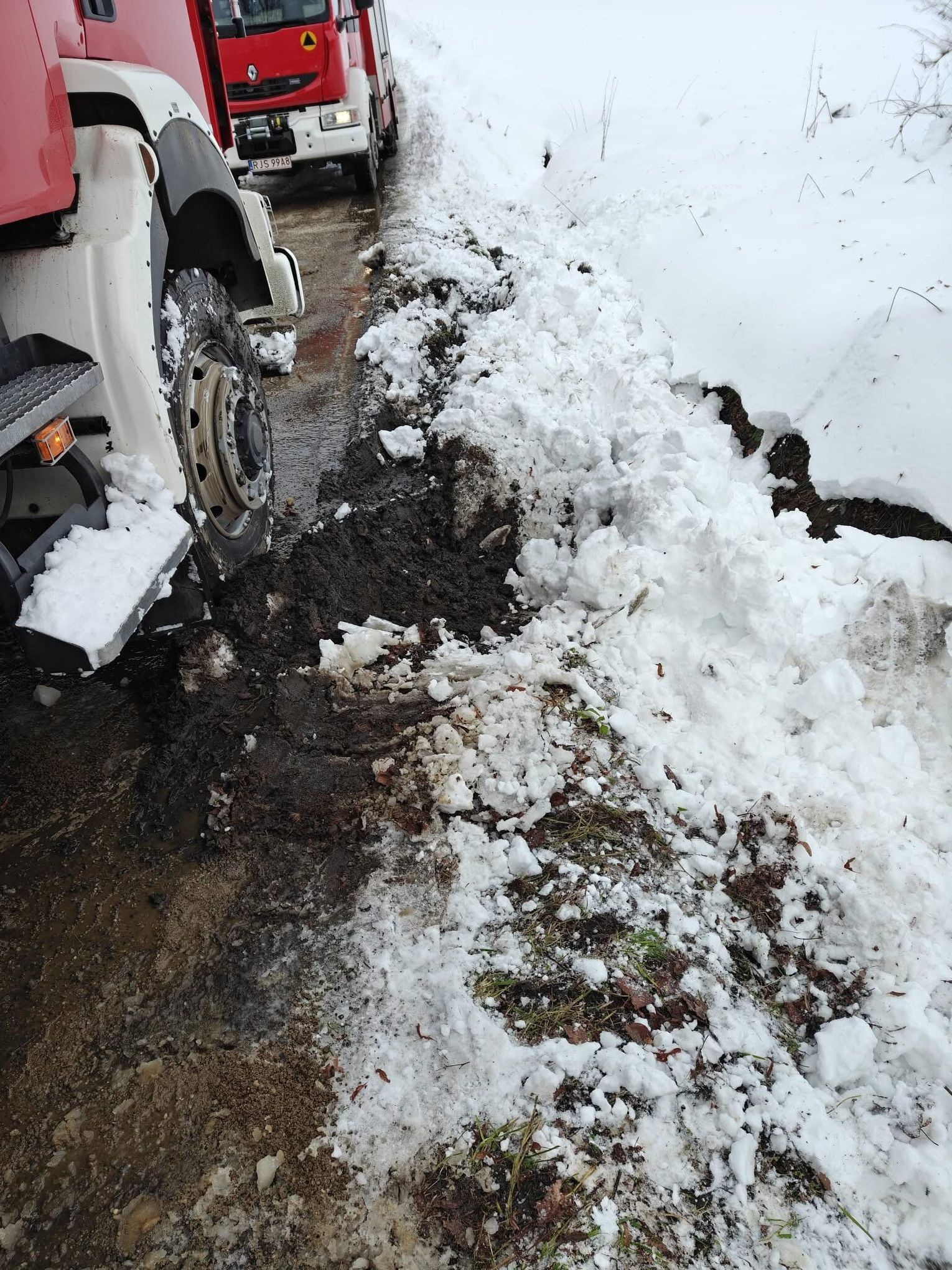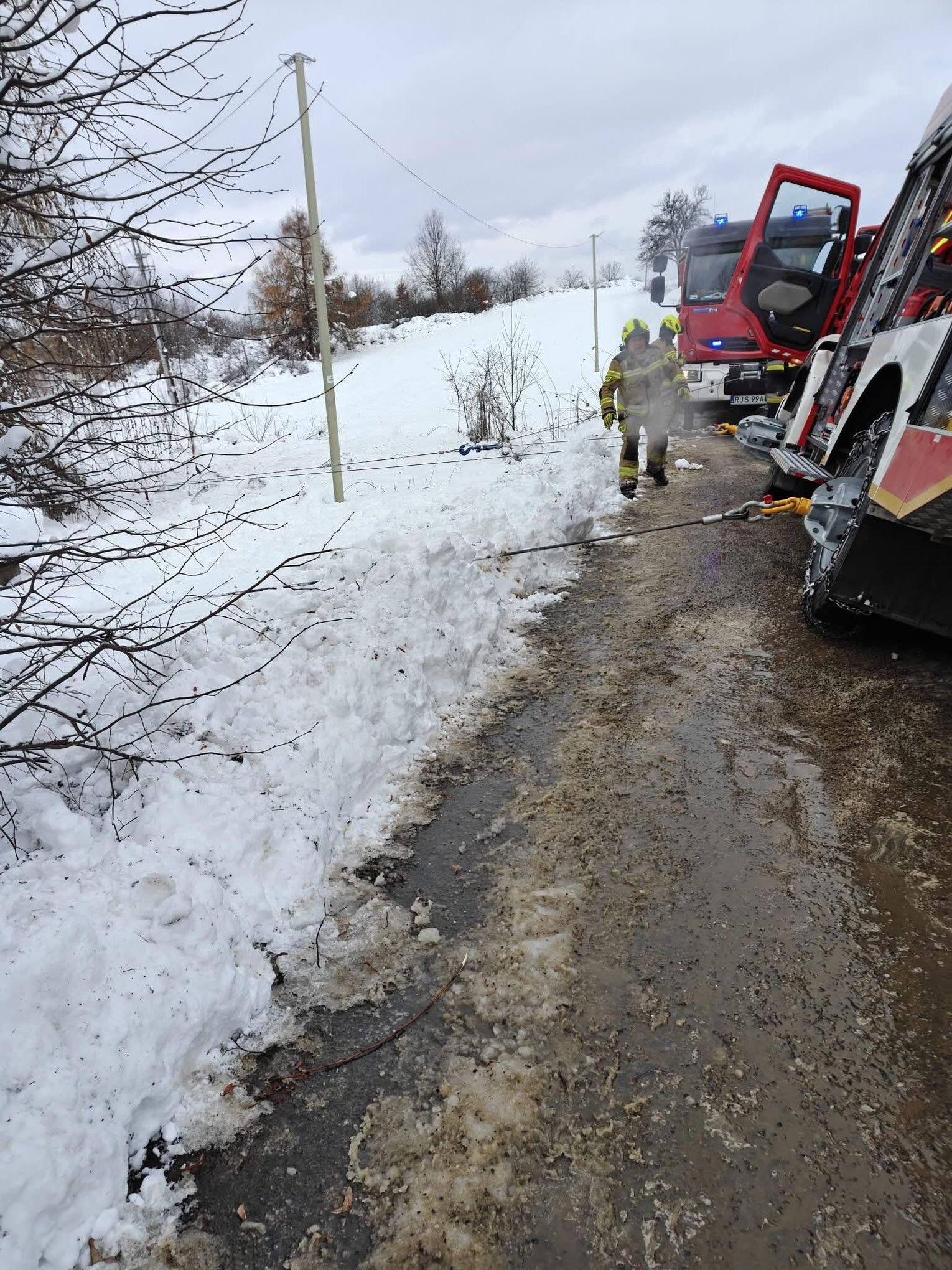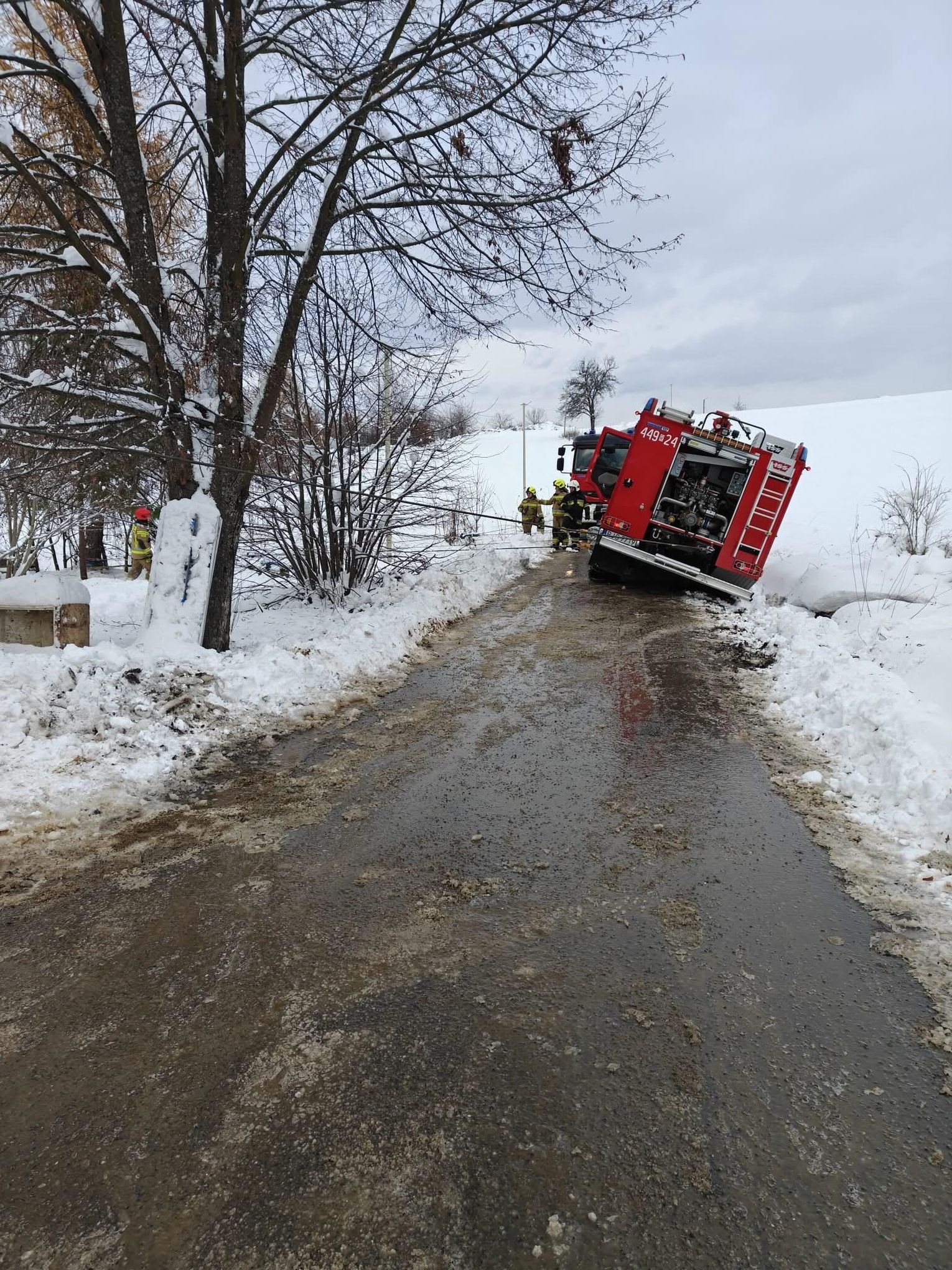 Na miejsce natychmiast skierowano druhów z OSP KSRG Pusta Wola, OSP KSRG Skołyszyn oraz lekki zastęp z OSP KSRG Harklowa. Pomimo podjętych prób, lokalne jednostki nie były w stanie wyciągnąć zakleszczonego wozu. Z uwagi na skalę utrudnień, do działań zadysponowano ciężki samochód ratownictwa drogowego z JRG PSP Krosno (341[R]49 MegaCity Volvo), który wchodzi w skład Specjalistycznej Grupy Ratownictwa Technicznego. Na miejsce dotarł również dowódca JRG PSP Jasło zastępem nr 91.