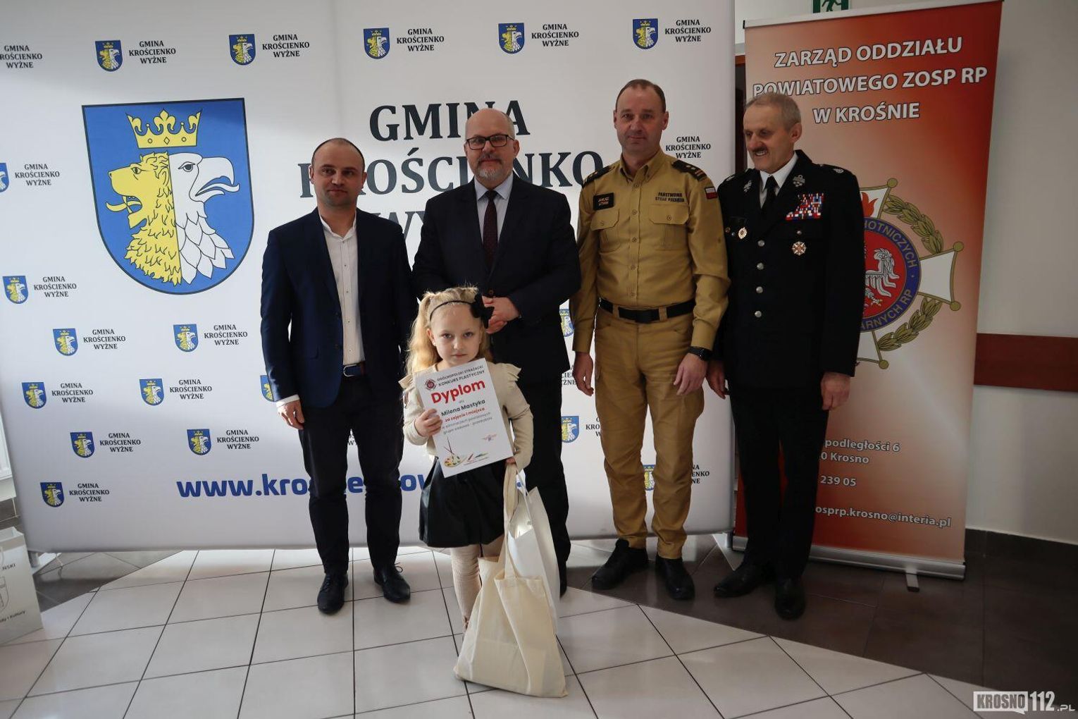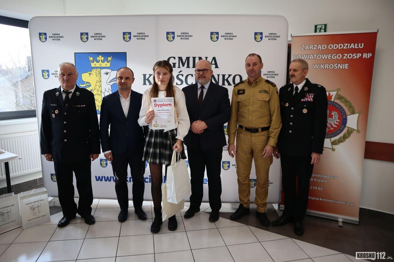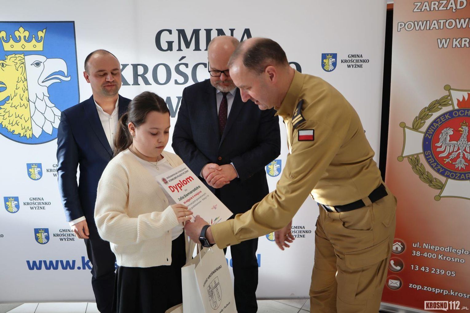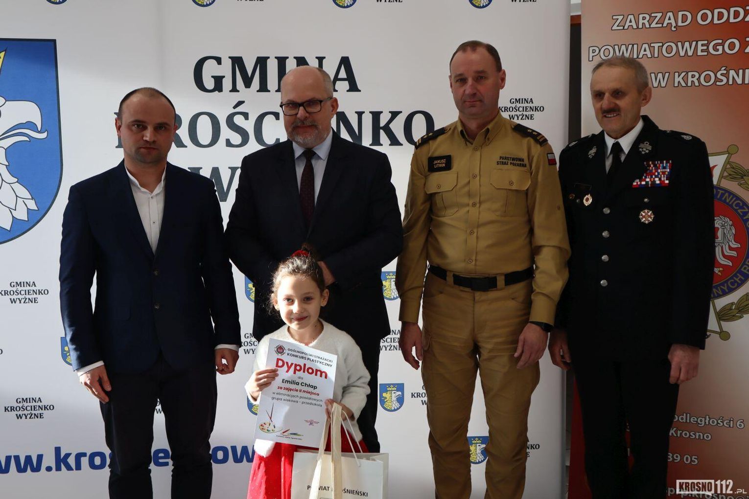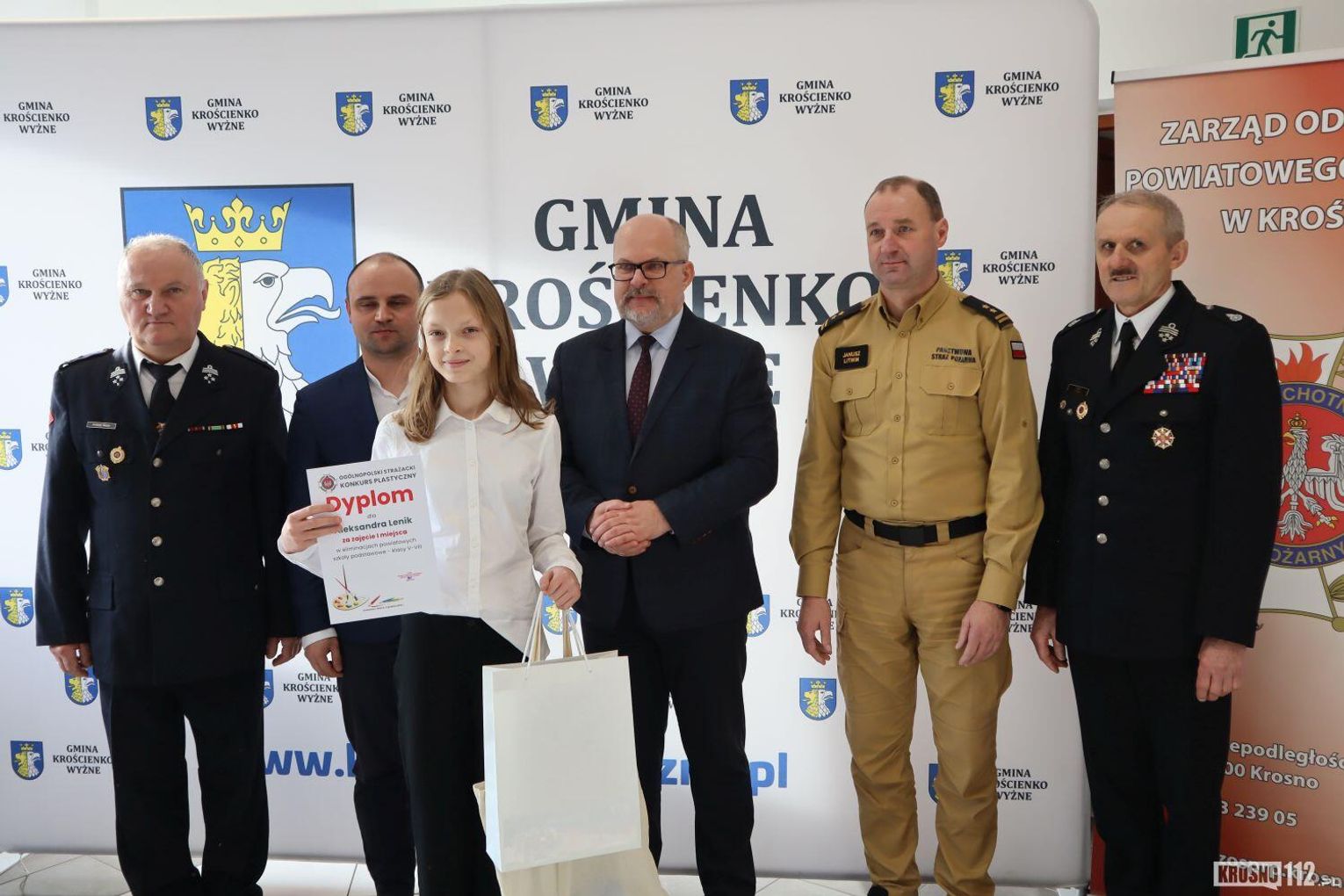 Autorzy prac finału powiatowego otrzymali nagrody ufundowane przez Starostwo Powiatowe w Krośnie oraz Urząd Gminy Krościenko Wyżne. Nagrody i dyplomy laureatom konkursu wręczyli: Andrzej Guzik - Wicestarosta Powiatu Krośnieńskiego, Łukasz Lorens - Zastępca Wójta Gminy Krościenko Wyżne, bryg. Janusz Litwin - Zastępca Komendanta Miejskiego PSP w Krośnie, dh Józef Tucki - Prezes Zarządu Oddziału Powiatowego ZOSP RP w Krośnie, dh Krzysztof Podkul - Sekretarz Zarządu Oddziału Powiatowego ZOSP RP w Krośnie, dh Andrzej Glazar - Prezes OSP KSRG Krościenko Wyżne.