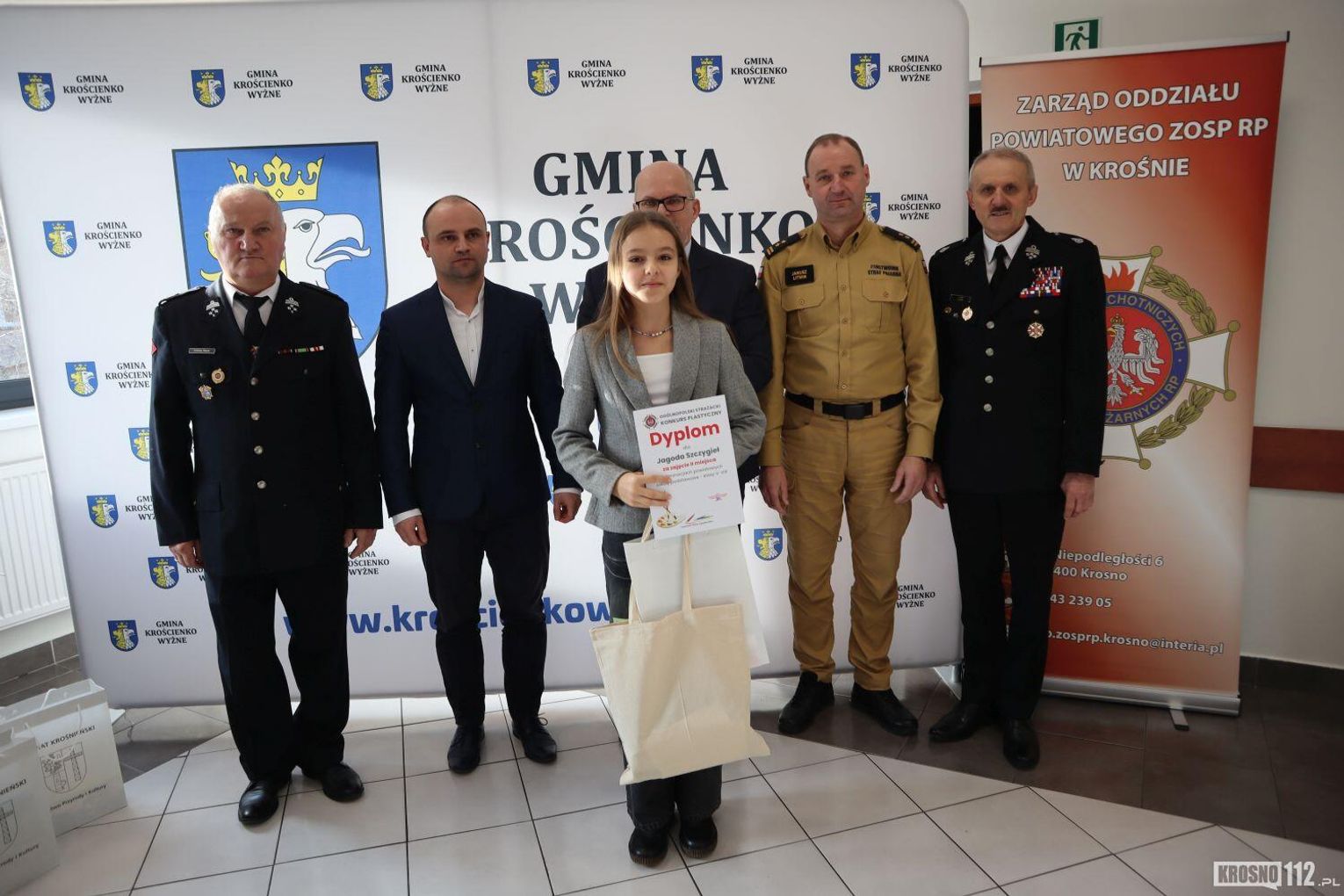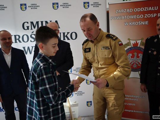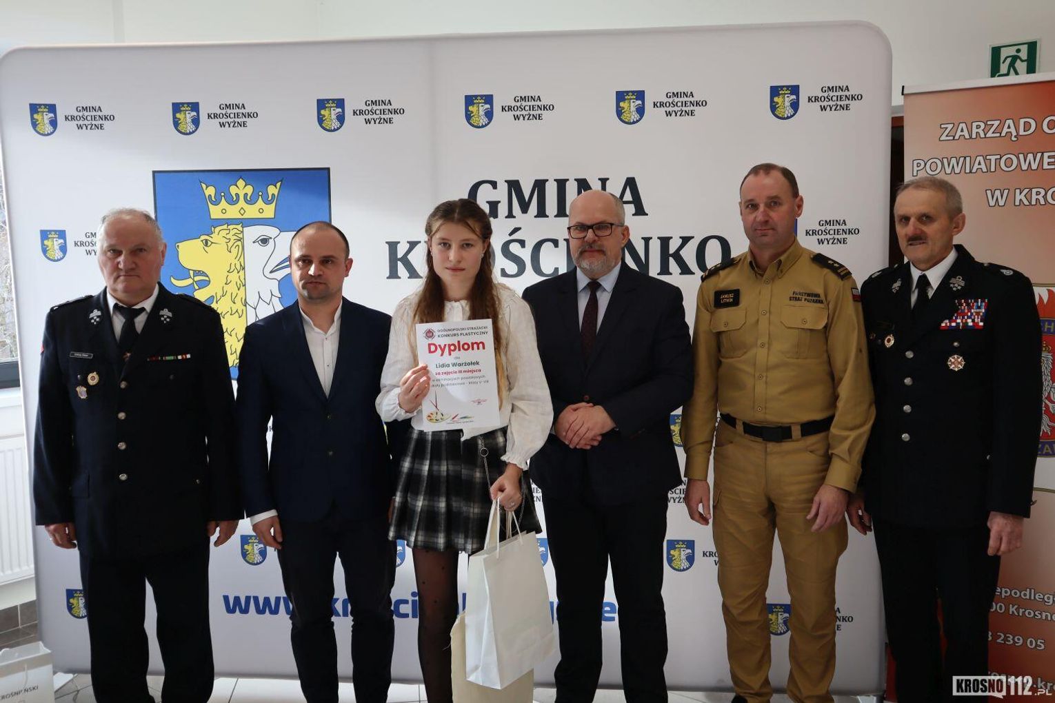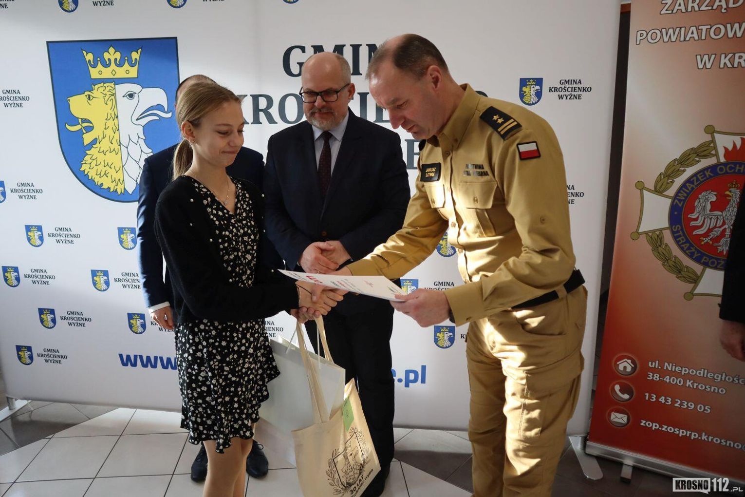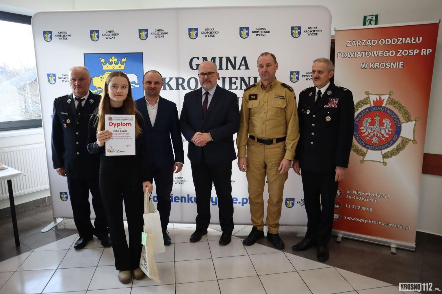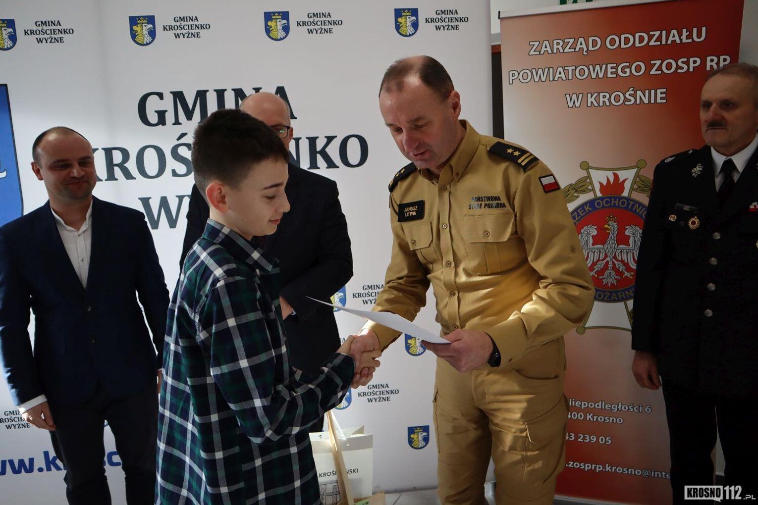 Autorzy prac finału powiatowego otrzymali nagrody ufundowane przez Starostwo Powiatowe w Krośnie oraz Urząd Gminy Krościenko Wyżne. Nagrody i dyplomy laureatom konkursu wręczyli: Andrzej Guzik - Wicestarosta Powiatu Krośnieńskiego, Łukasz Lorens - Zastępca Wójta Gminy Krościenko Wyżne, bryg. Janusz Litwin - Zastępca Komendanta Miejskiego PSP w Krośnie, dh Józef Tucki - Prezes Zarządu Oddziału Powiatowego ZOSP RP w Krośnie, dh Krzysztof Podkul - Sekretarz Zarządu Oddziału Powiatowego ZOSP RP w Krośnie, dh Andrzej Glazar - Prezes OSP KSRG Krościenko Wyżne.