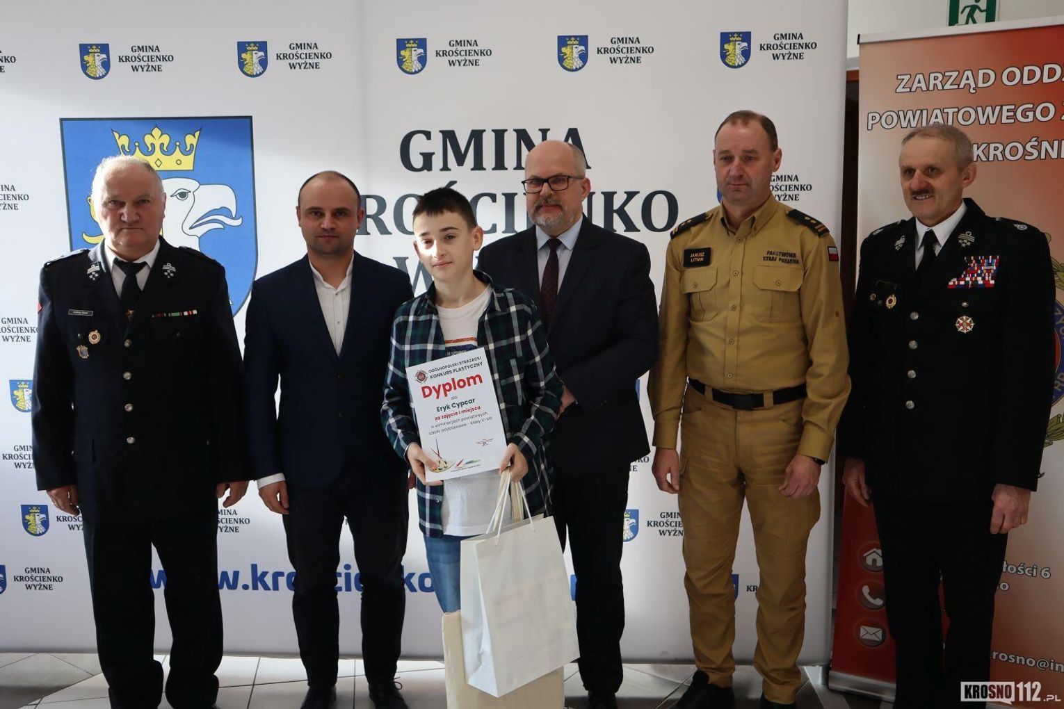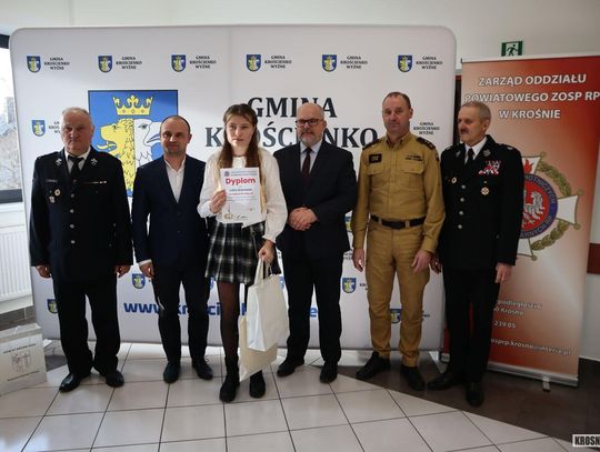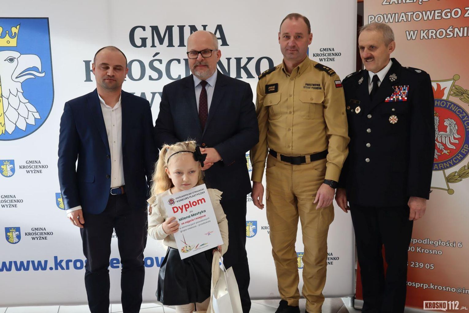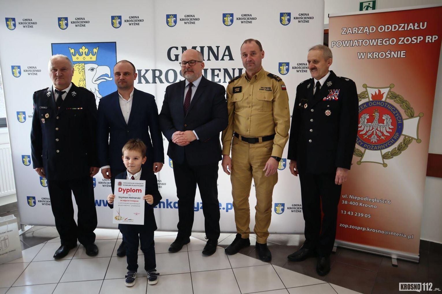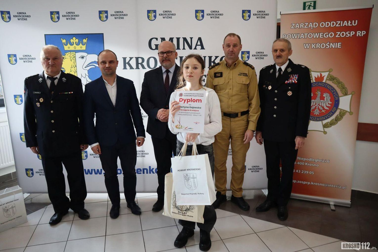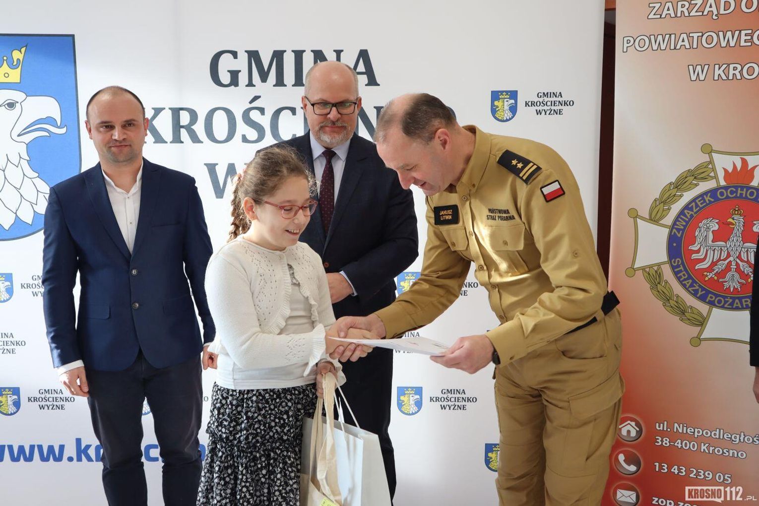Autorzy prac finału powiatowego otrzymali nagrody ufundowane przez Starostwo Powiatowe w Krośnie oraz Urząd Gminy Krościenko Wyżne. Nagrody i dyplomy laureatom konkursu wręczyli: Andrzej Guzik - Wicestarosta Powiatu Krośnieńskiego, Łukasz Lorens - Zastępca Wójta Gminy Krościenko Wyżne, bryg. Janusz Litwin - Zastępca Komendanta Miejskiego PSP w Krośnie, dh Józef Tucki - Prezes Zarządu Oddziału Powiatowego ZOSP RP w Krośnie, dh Krzysztof Podkul - Sekretarz Zarządu Oddziału Powiatowego ZOSP RP w Krośnie, dh Andrzej Glazar - Prezes OSP KSRG Krościenko Wyżne.