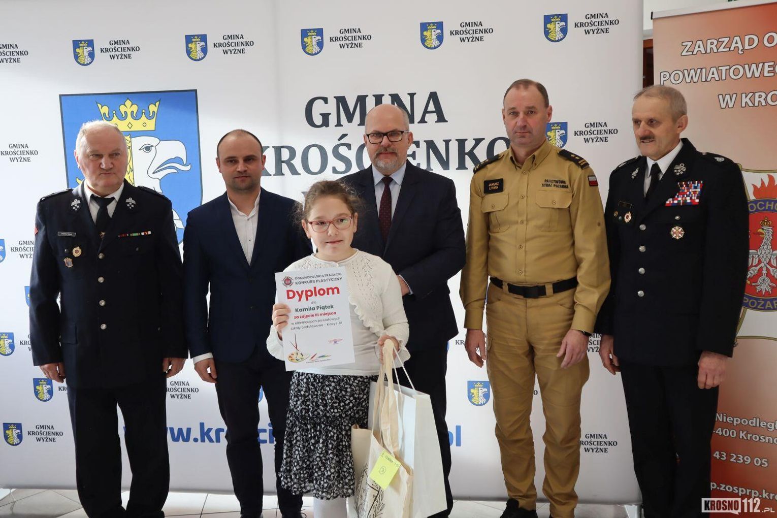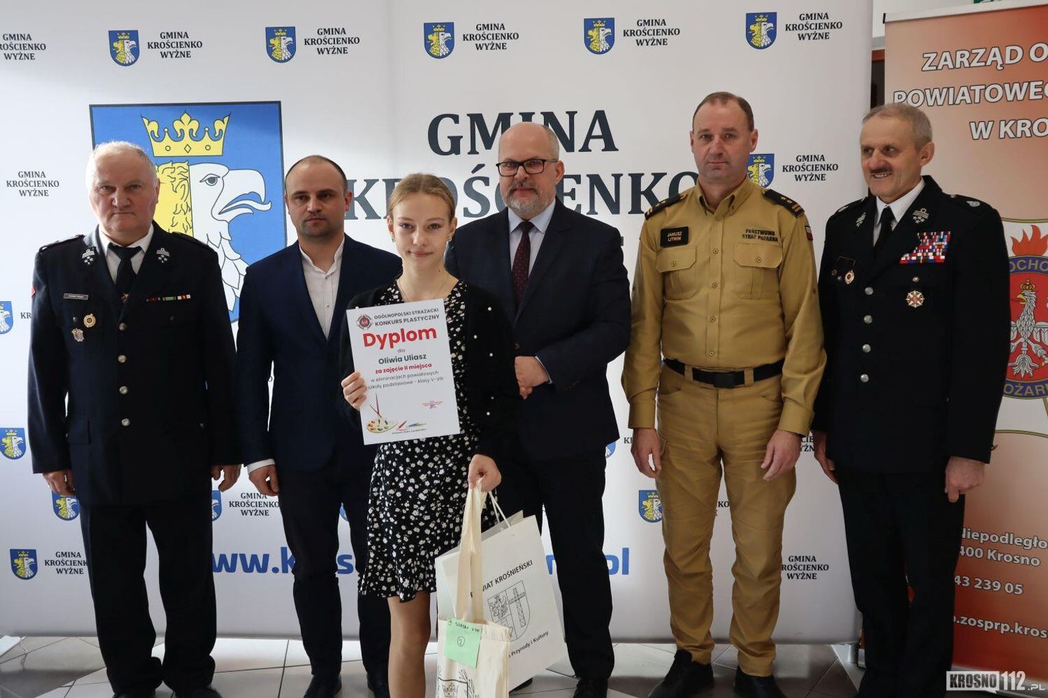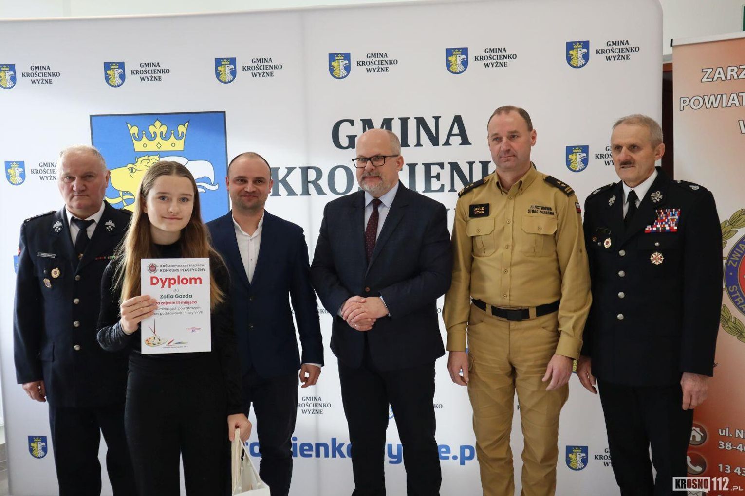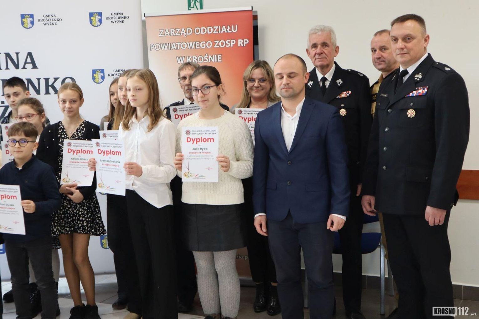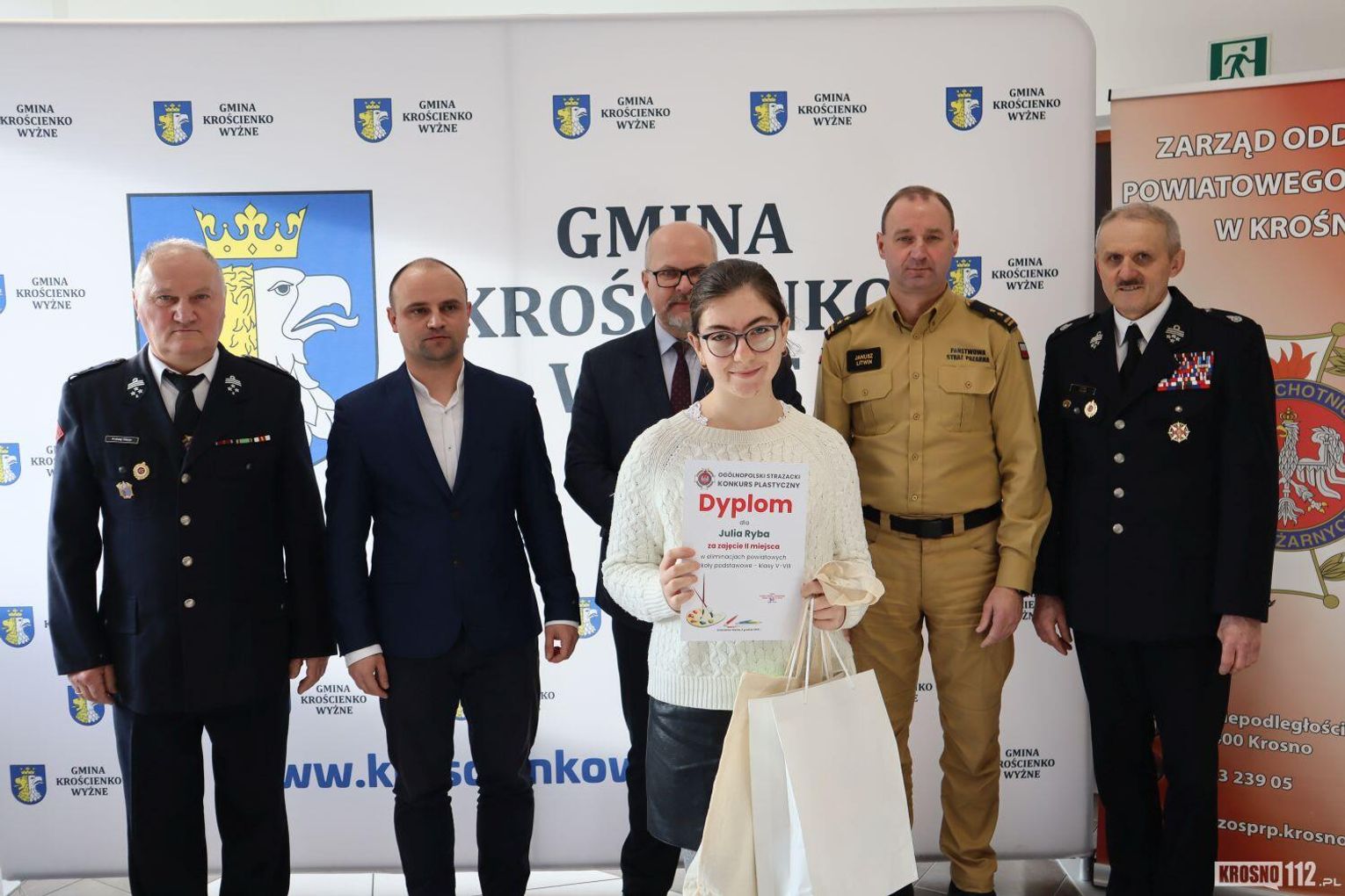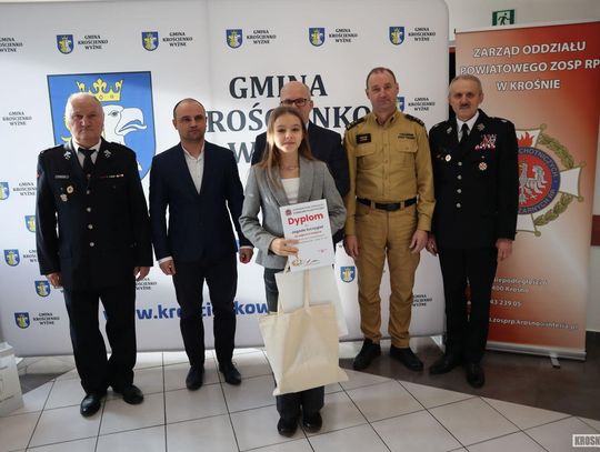 Autorzy prac finału powiatowego otrzymali nagrody ufundowane przez Starostwo Powiatowe w Krośnie oraz Urząd Gminy Krościenko Wyżne. Nagrody i dyplomy laureatom konkursu wręczyli: Andrzej Guzik - Wicestarosta Powiatu Krośnieńskiego, Łukasz Lorens - Zastępca Wójta Gminy Krościenko Wyżne, bryg. Janusz Litwin - Zastępca Komendanta Miejskiego PSP w Krośnie, dh Józef Tucki - Prezes Zarządu Oddziału Powiatowego ZOSP RP w Krośnie, dh Krzysztof Podkul - Sekretarz Zarządu Oddziału Powiatowego ZOSP RP w Krośnie, dh Andrzej Glazar - Prezes OSP KSRG Krościenko Wyżne.