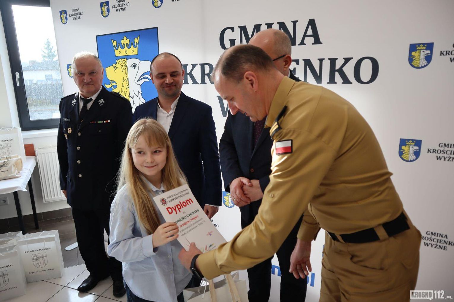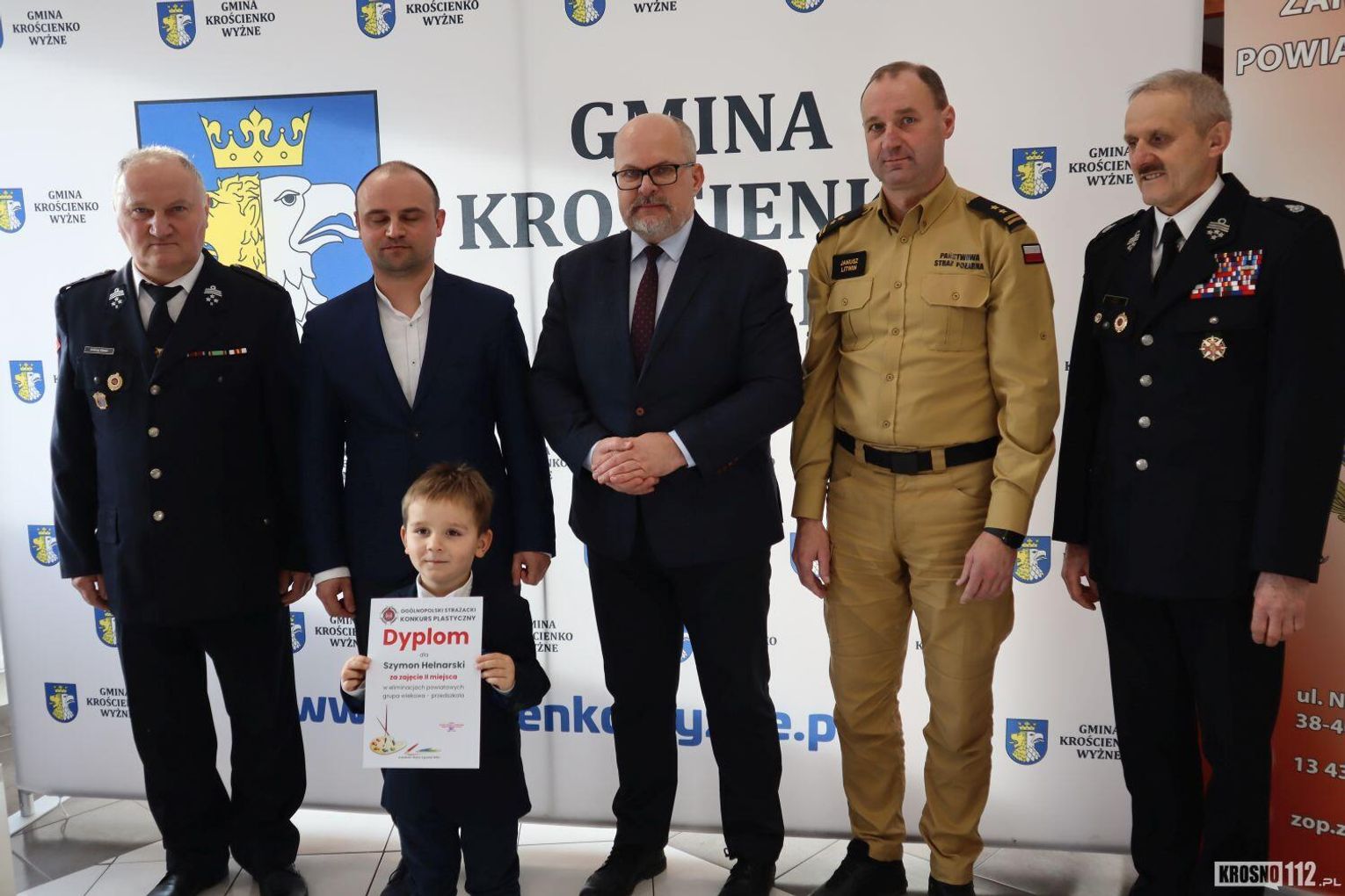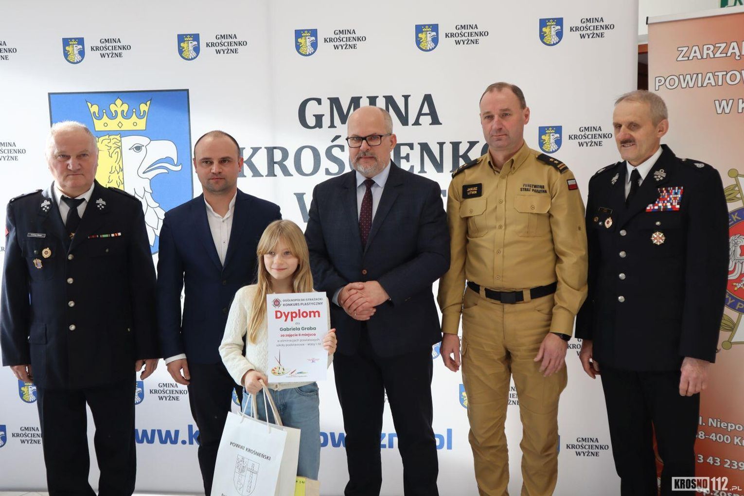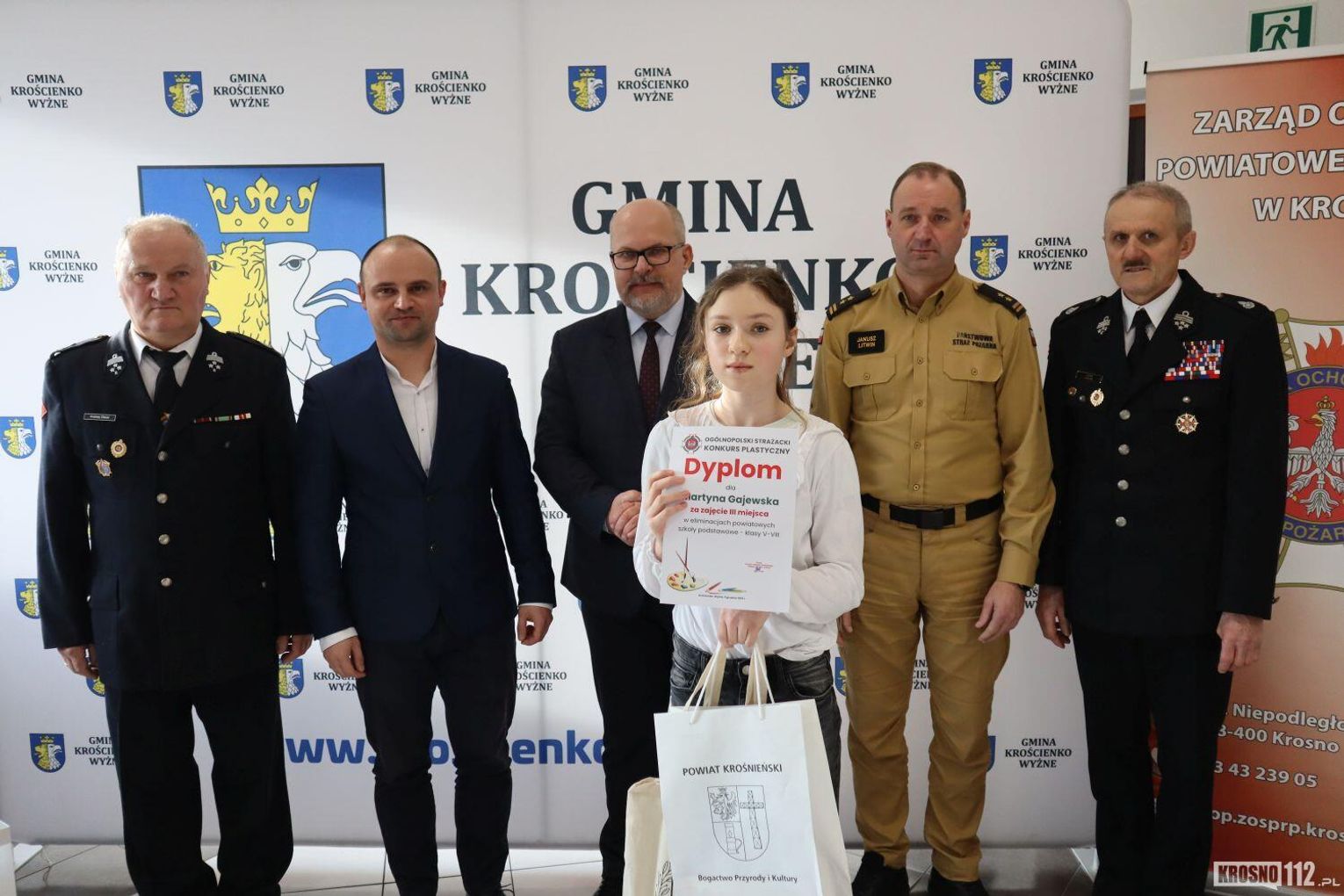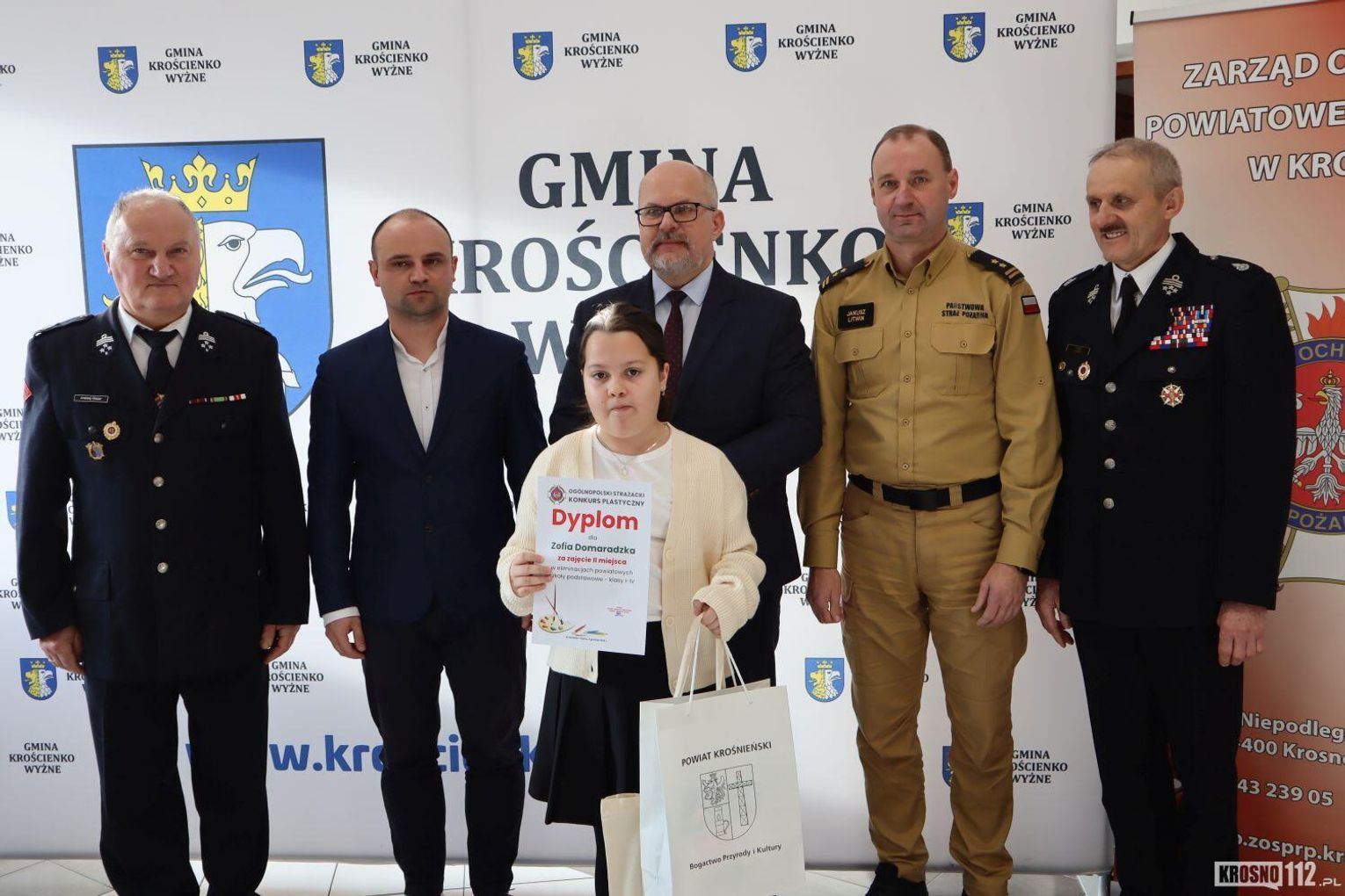 Autorzy prac finału powiatowego otrzymali nagrody ufundowane przez Starostwo Powiatowe w Krośnie oraz Urząd Gminy Krościenko Wyżne. Nagrody i dyplomy laureatom konkursu wręczyli: Andrzej Guzik - Wicestarosta Powiatu Krośnieńskiego, Łukasz Lorens - Zastępca Wójta Gminy Krościenko Wyżne, bryg. Janusz Litwin - Zastępca Komendanta Miejskiego PSP w Krośnie, dh Józef Tucki - Prezes Zarządu Oddziału Powiatowego ZOSP RP w Krośnie, dh Krzysztof Podkul - Sekretarz Zarządu Oddziału Powiatowego ZOSP RP w Krośnie, dh Andrzej Glazar - Prezes OSP KSRG Krościenko Wyżne.