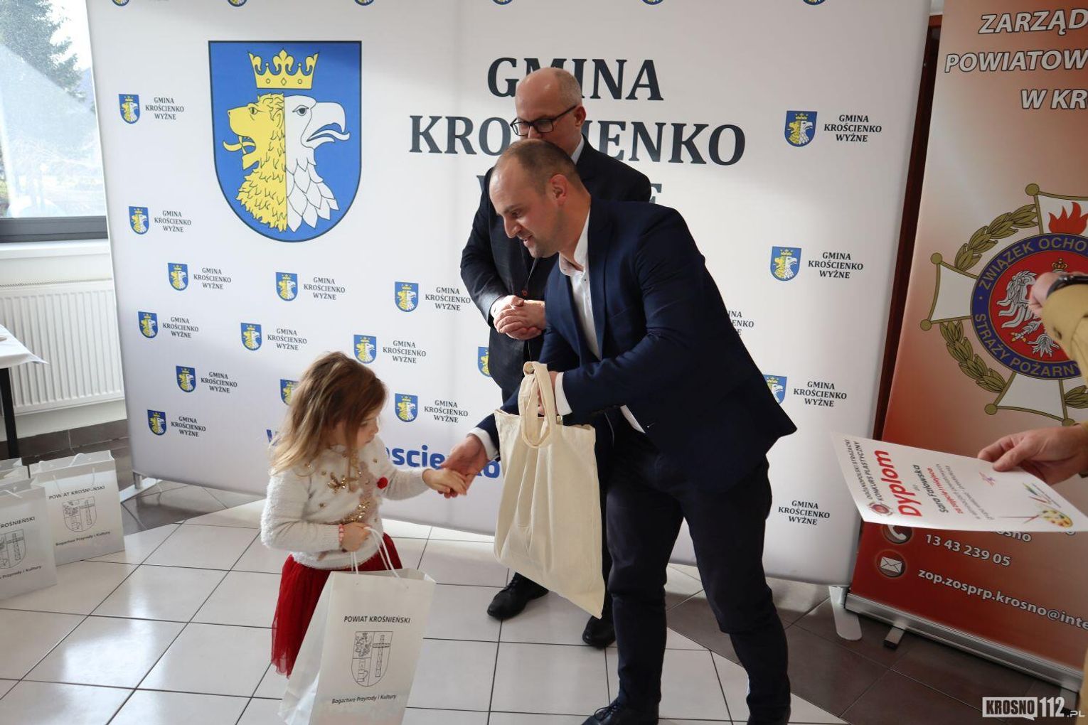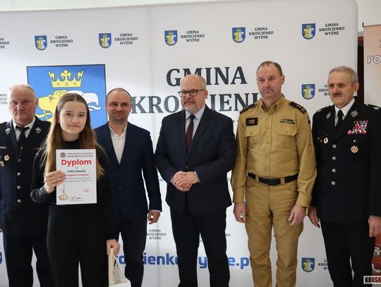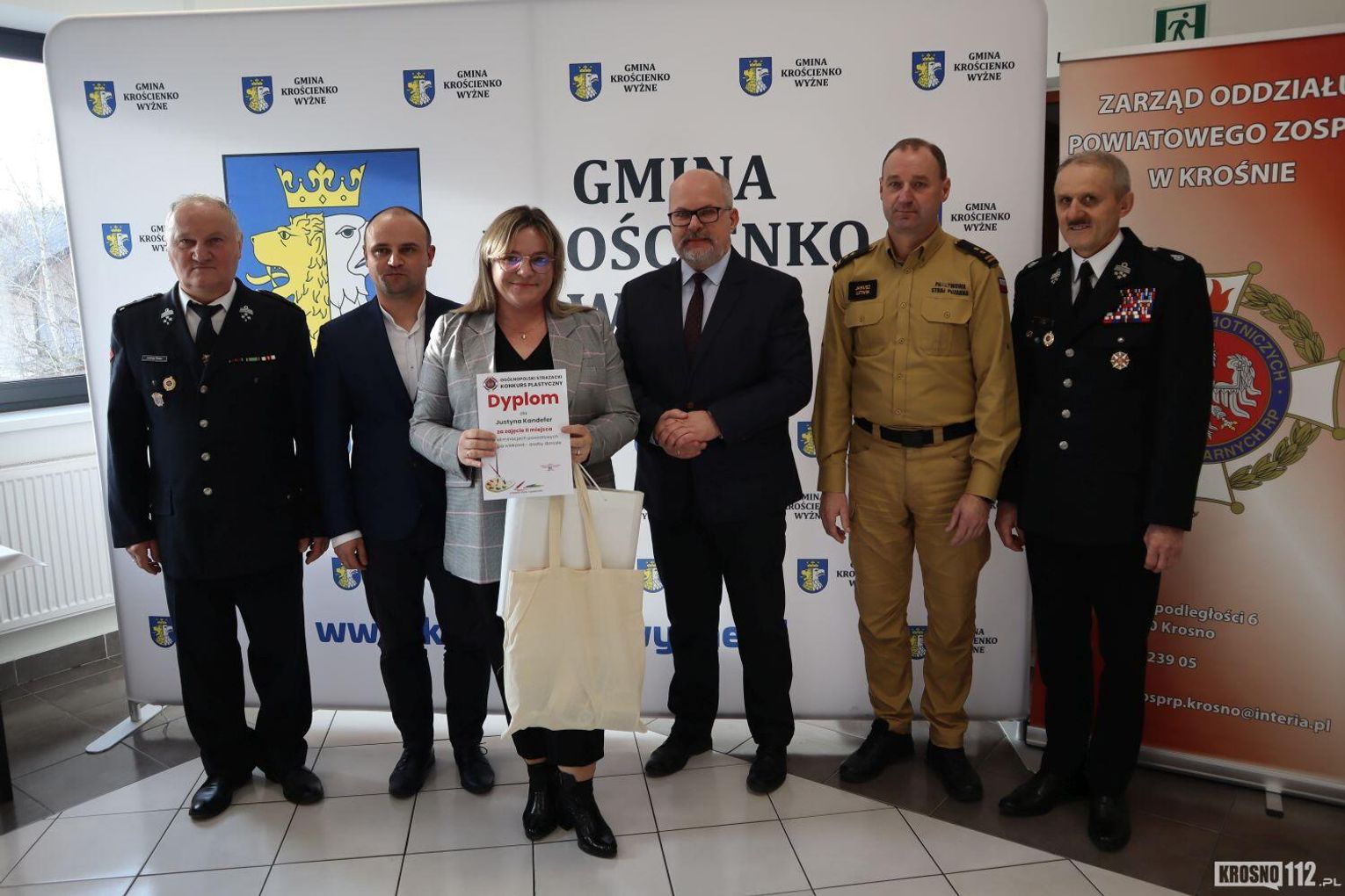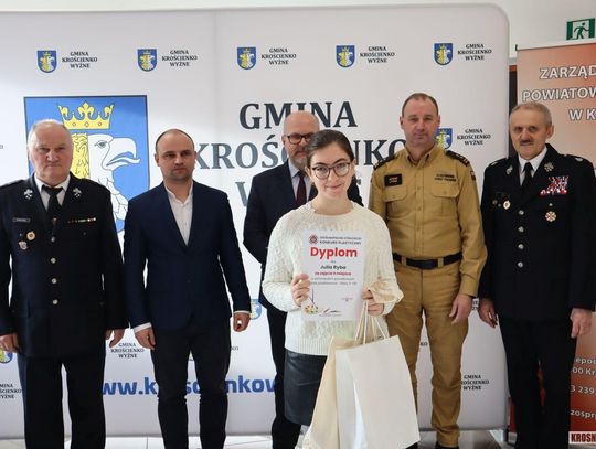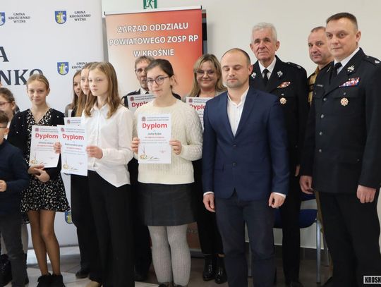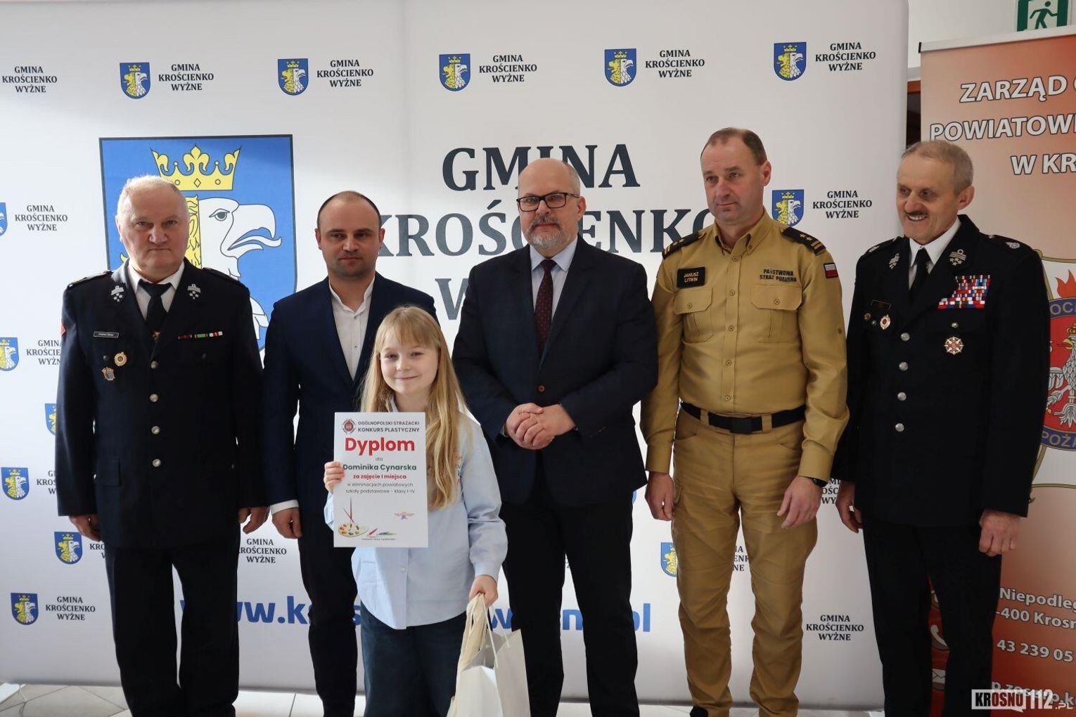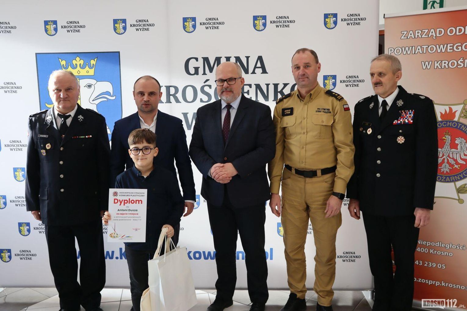 Autorzy prac finału powiatowego otrzymali nagrody ufundowane przez Starostwo Powiatowe w Krośnie oraz Urząd Gminy Krościenko Wyżne. Nagrody i dyplomy laureatom konkursu wręczyli: Andrzej Guzik - Wicestarosta Powiatu Krośnieńskiego, Łukasz Lorens - Zastępca Wójta Gminy Krościenko Wyżne, bryg. Janusz Litwin - Zastępca Komendanta Miejskiego PSP w Krośnie, dh Józef Tucki - Prezes Zarządu Oddziału Powiatowego ZOSP RP w Krośnie, dh Krzysztof Podkul - Sekretarz Zarządu Oddziału Powiatowego ZOSP RP w Krośnie, dh Andrzej Glazar - Prezes OSP KSRG Krościenko Wyżne.