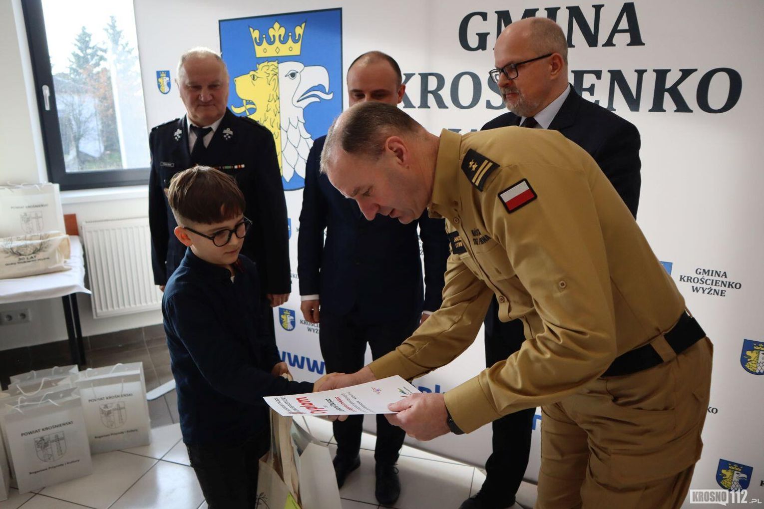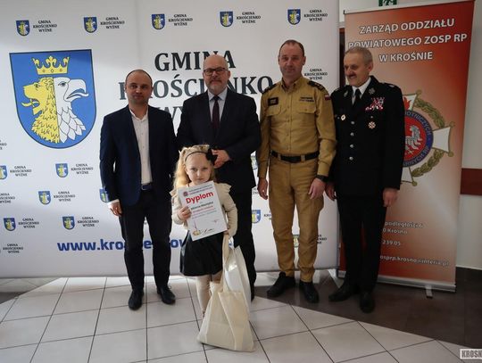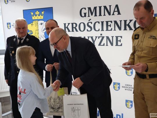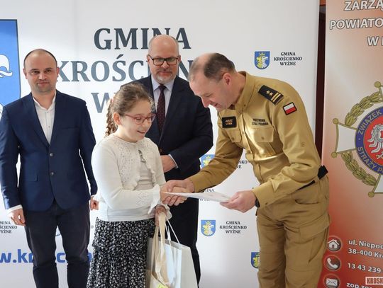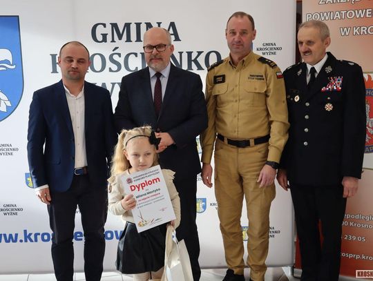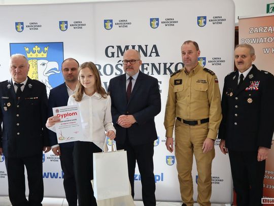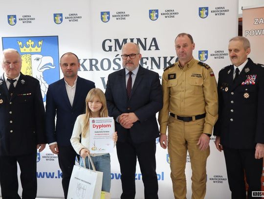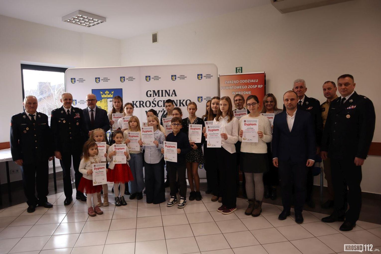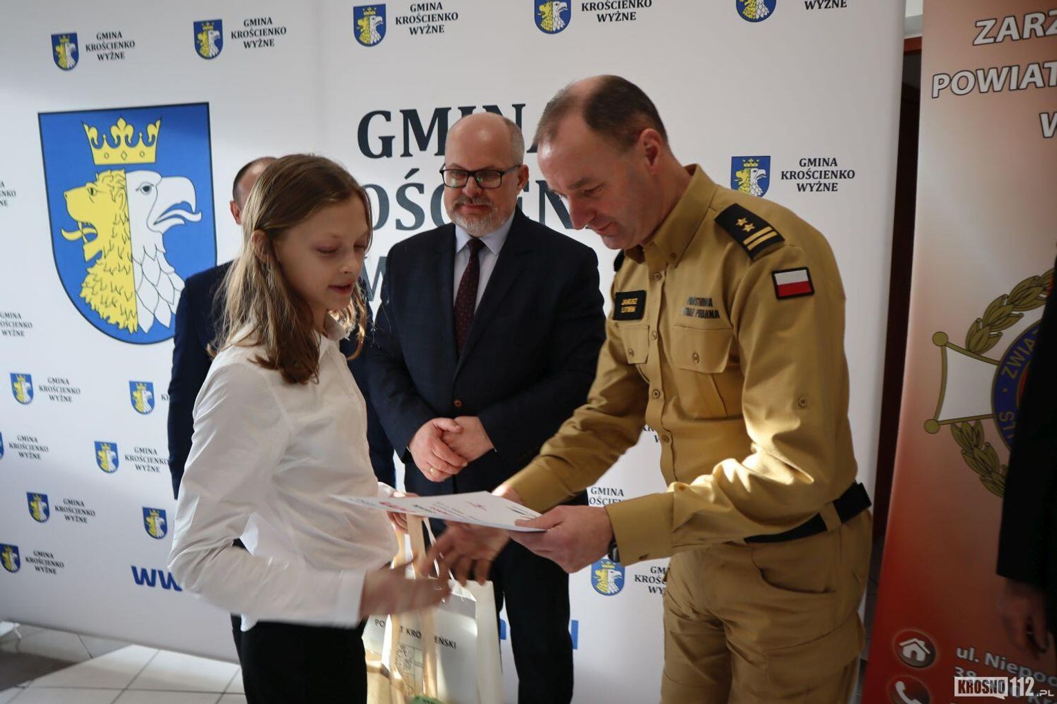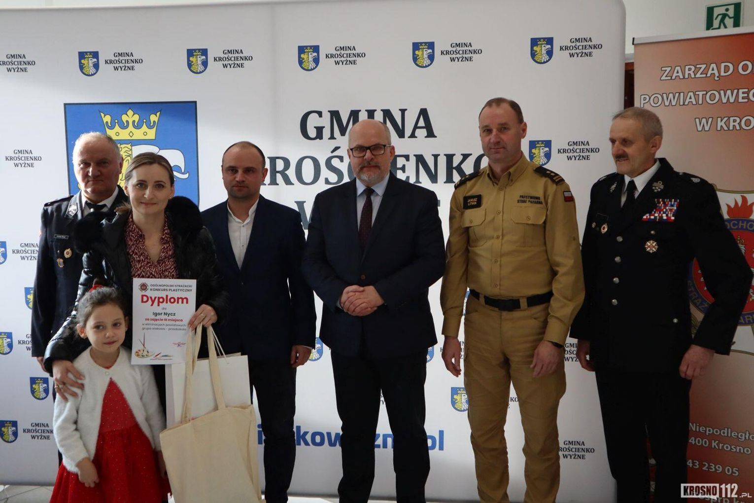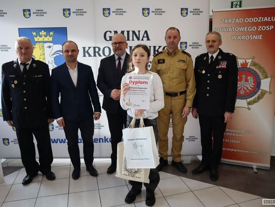 Autorzy prac finału powiatowego otrzymali nagrody ufundowane przez Starostwo Powiatowe w Krośnie oraz Urząd Gminy Krościenko Wyżne. Nagrody i dyplomy laureatom konkursu wręczyli: Andrzej Guzik - Wicestarosta Powiatu Krośnieńskiego, Łukasz Lorens - Zastępca Wójta Gminy Krościenko Wyżne, bryg. Janusz Litwin - Zastępca Komendanta Miejskiego PSP w Krośnie, dh Józef Tucki - Prezes Zarządu Oddziału Powiatowego ZOSP RP w Krośnie, dh Krzysztof Podkul - Sekretarz Zarządu Oddziału Powiatowego ZOSP RP w Krośnie, dh Andrzej Glazar - Prezes OSP KSRG Krościenko Wyżne.