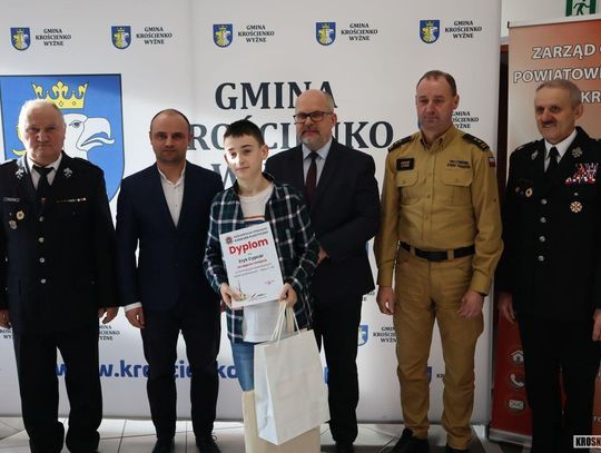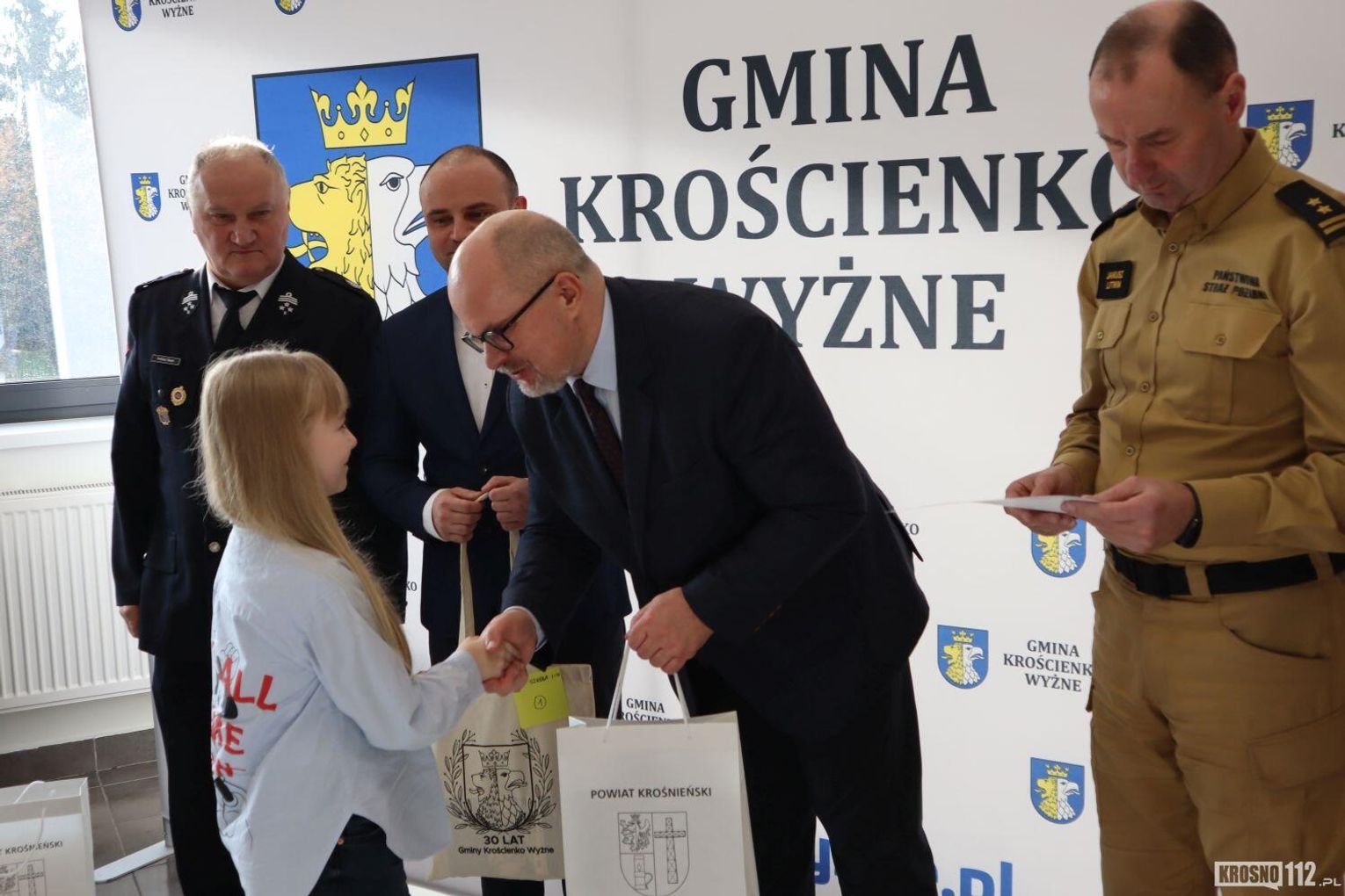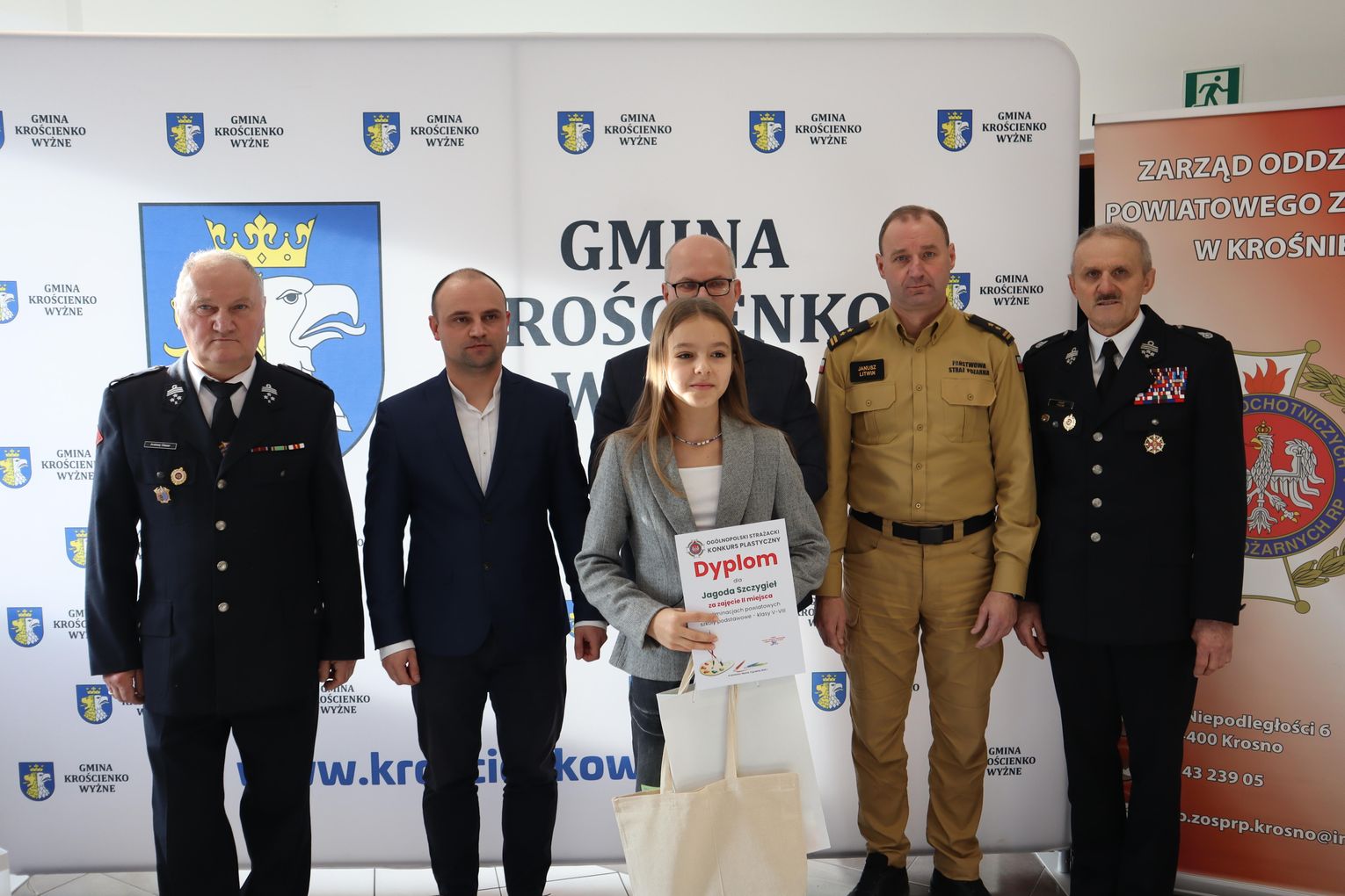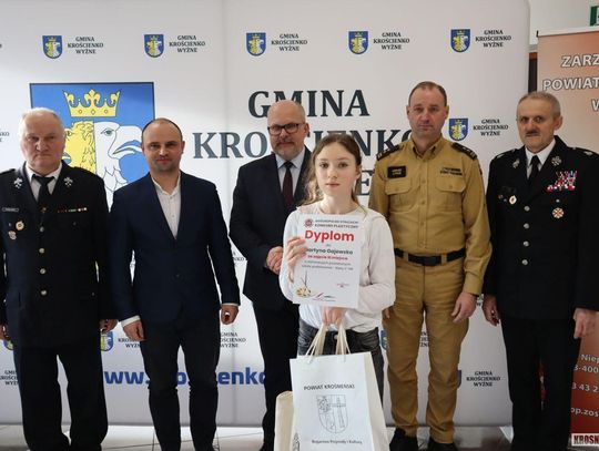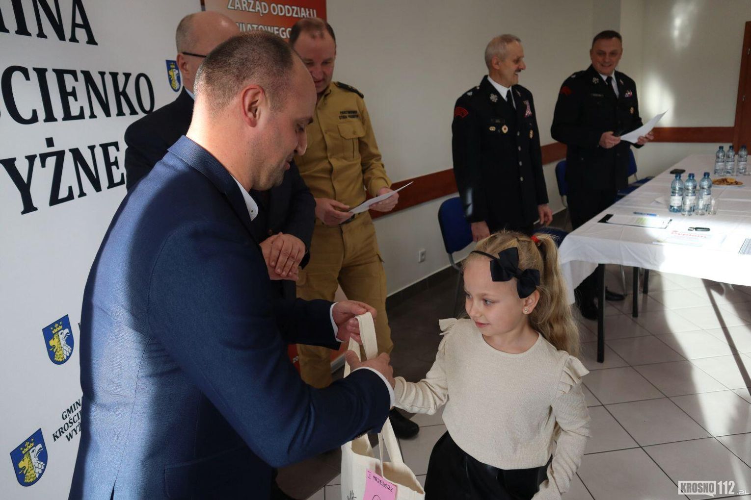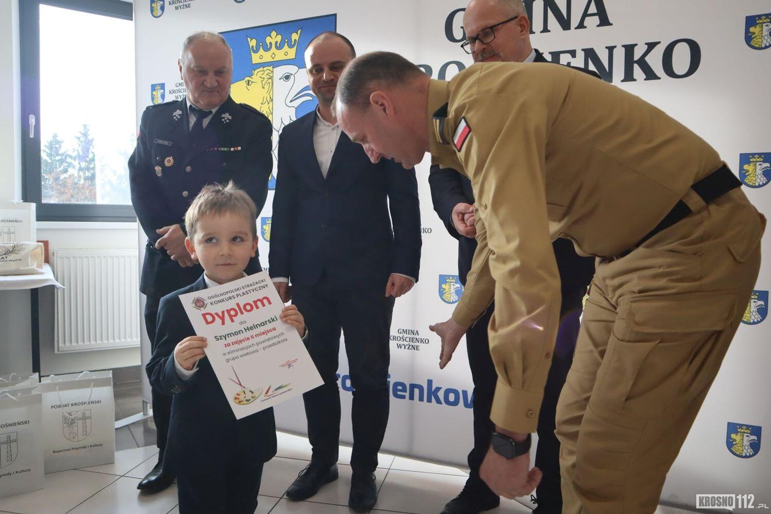 Autorzy prac finału powiatowego otrzymali nagrody ufundowane przez Starostwo Powiatowe w Krośnie oraz Urząd Gminy Krościenko Wyżne. Nagrody i dyplomy laureatom konkursu wręczyli: Andrzej Guzik - Wicestarosta Powiatu Krośnieńskiego, Łukasz Lorens - Zastępca Wójta Gminy Krościenko Wyżne, bryg. Janusz Litwin - Zastępca Komendanta Miejskiego PSP w Krośnie, dh Józef Tucki - Prezes Zarządu Oddziału Powiatowego ZOSP RP w Krośnie, dh Krzysztof Podkul - Sekretarz Zarządu Oddziału Powiatowego ZOSP RP w Krośnie, dh Andrzej Glazar - Prezes OSP KSRG Krościenko Wyżne.