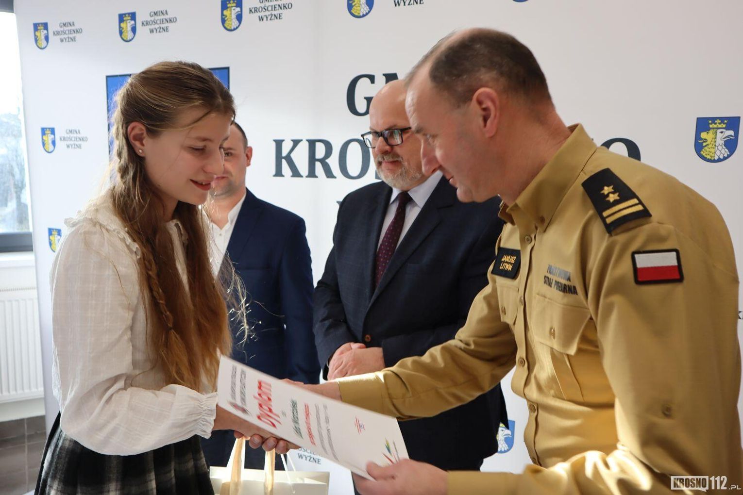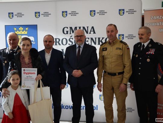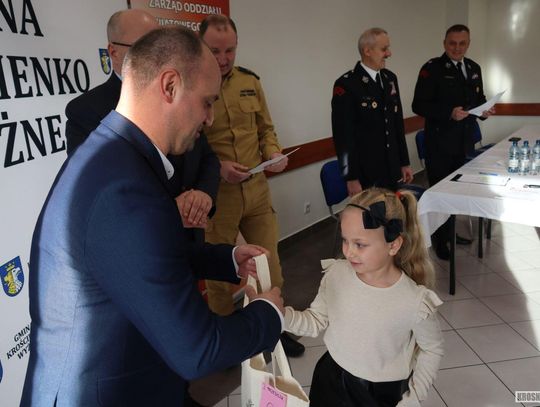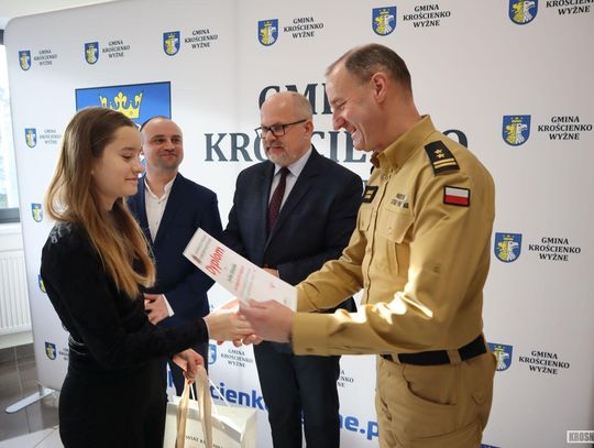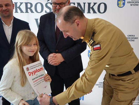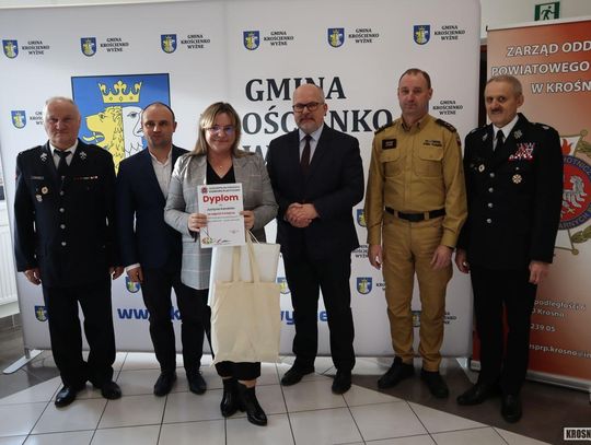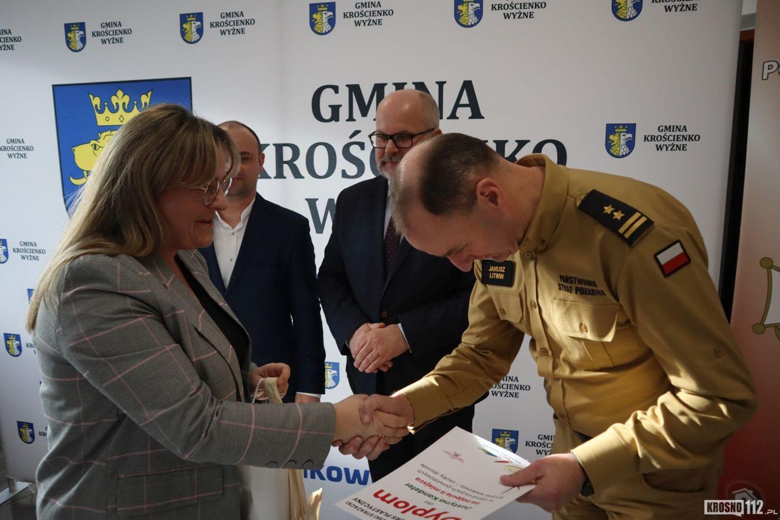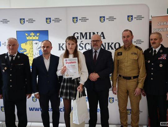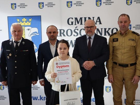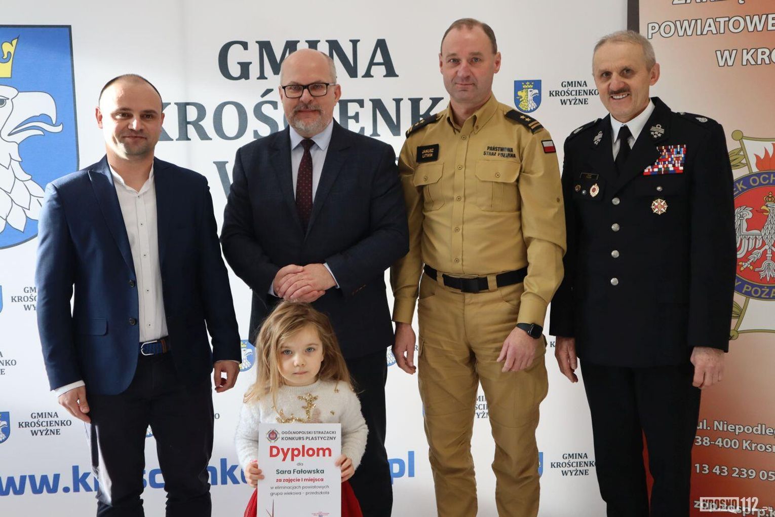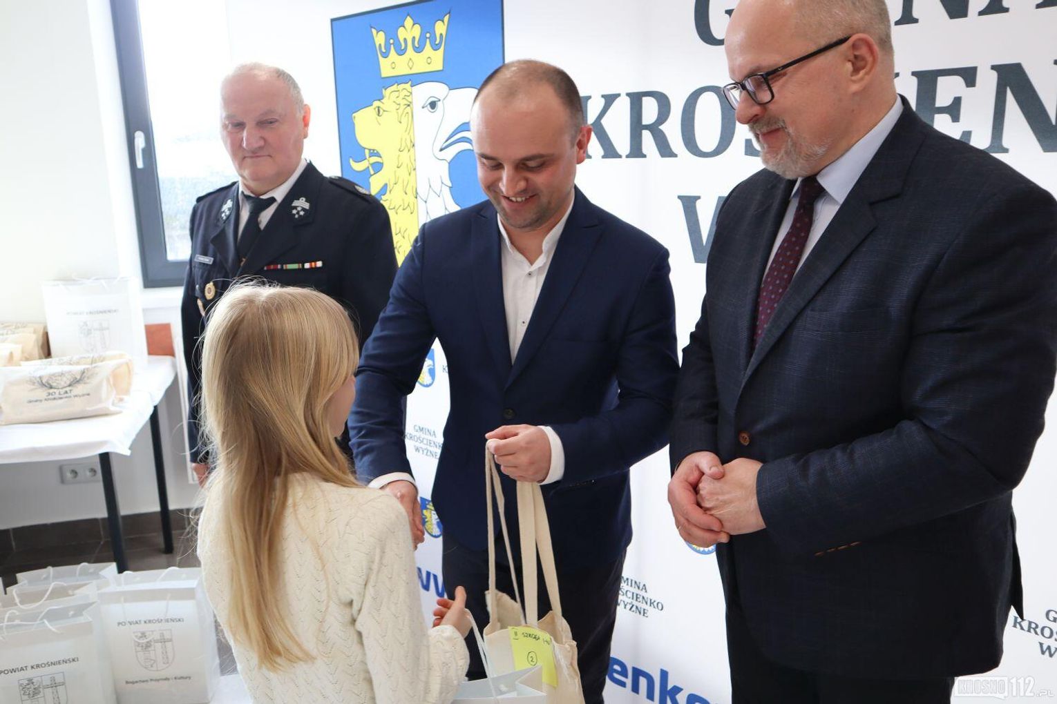 Autorzy prac finału powiatowego otrzymali nagrody ufundowane przez Starostwo Powiatowe w Krośnie oraz Urząd Gminy Krościenko Wyżne. Nagrody i dyplomy laureatom konkursu wręczyli: Andrzej Guzik - Wicestarosta Powiatu Krośnieńskiego, Łukasz Lorens - Zastępca Wójta Gminy Krościenko Wyżne, bryg. Janusz Litwin - Zastępca Komendanta Miejskiego PSP w Krośnie, dh Józef Tucki - Prezes Zarządu Oddziału Powiatowego ZOSP RP w Krośnie, dh Krzysztof Podkul - Sekretarz Zarządu Oddziału Powiatowego ZOSP RP w Krośnie, dh Andrzej Glazar - Prezes OSP KSRG Krościenko Wyżne.