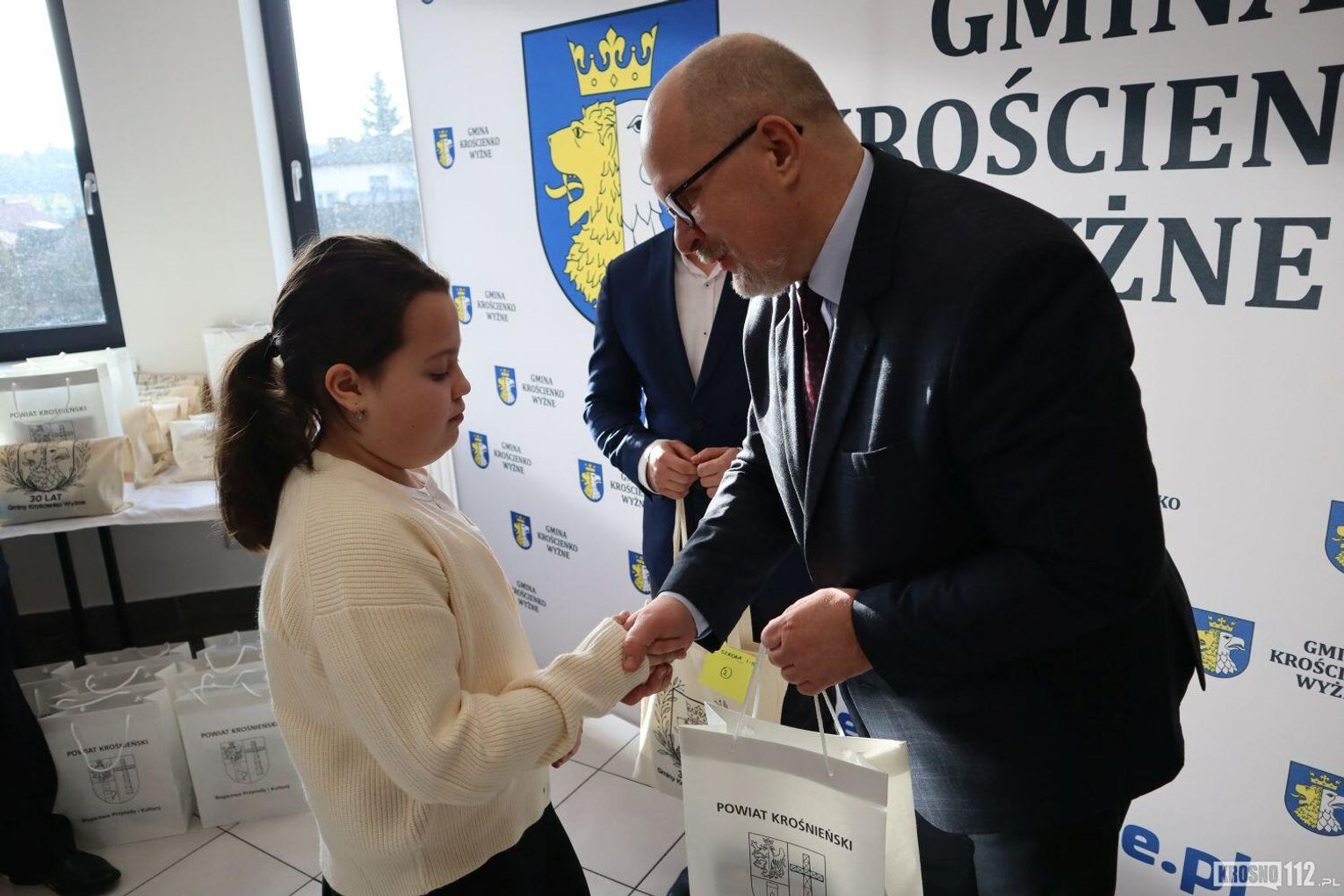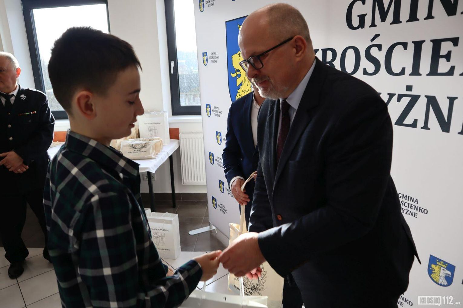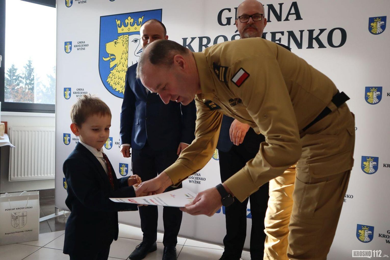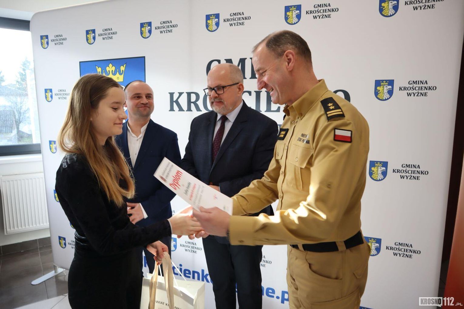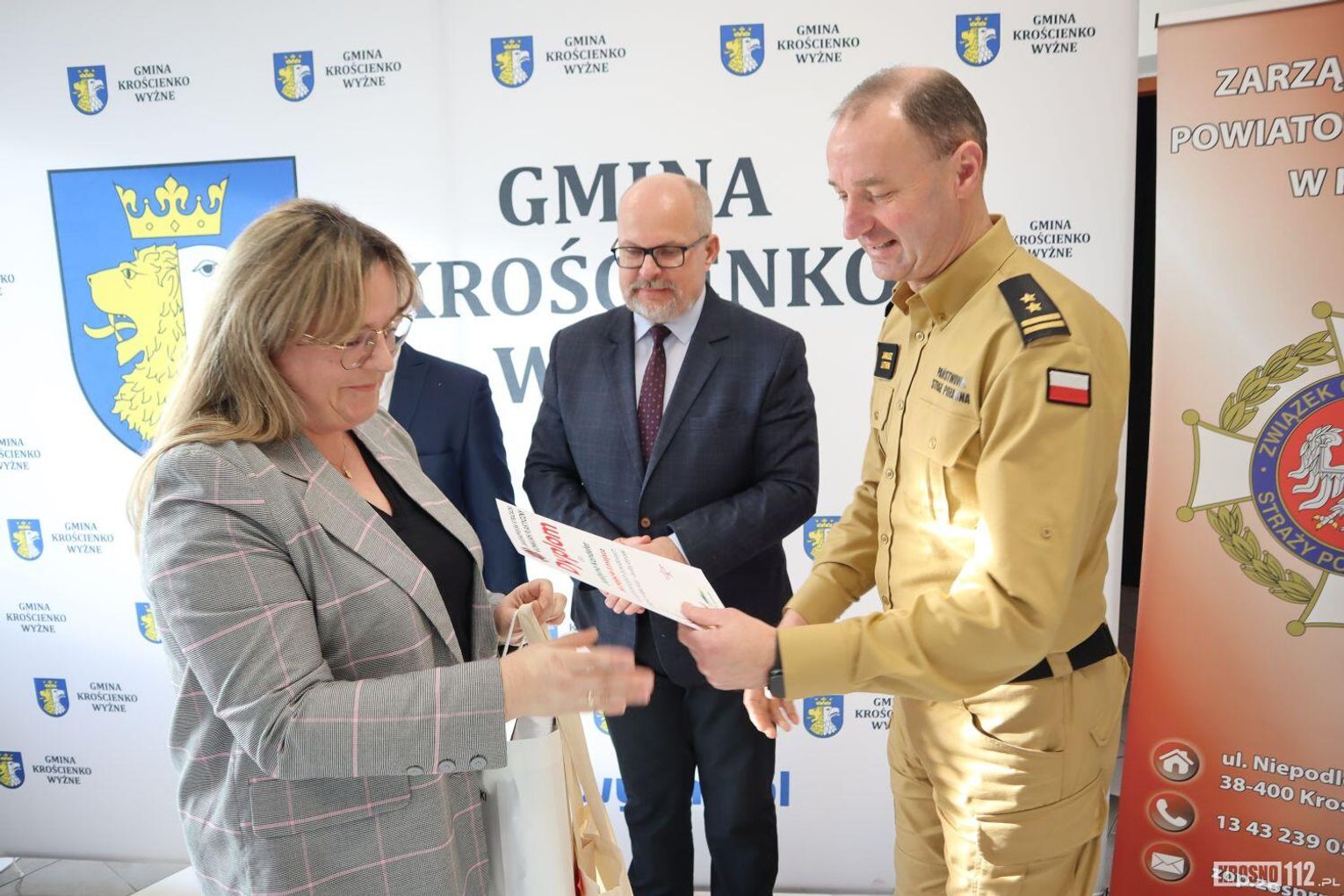 Autorzy prac finału powiatowego otrzymali nagrody ufundowane przez Starostwo Powiatowe w Krośnie oraz Urząd Gminy Krościenko Wyżne. Nagrody i dyplomy laureatom konkursu wręczyli: Andrzej Guzik - Wicestarosta Powiatu Krośnieńskiego, Łukasz Lorens - Zastępca Wójta Gminy Krościenko Wyżne, bryg. Janusz Litwin - Zastępca Komendanta Miejskiego PSP w Krośnie, dh Józef Tucki - Prezes Zarządu Oddziału Powiatowego ZOSP RP w Krośnie, dh Krzysztof Podkul - Sekretarz Zarządu Oddziału Powiatowego ZOSP RP w Krośnie, dh Andrzej Glazar - Prezes OSP KSRG Krościenko Wyżne.