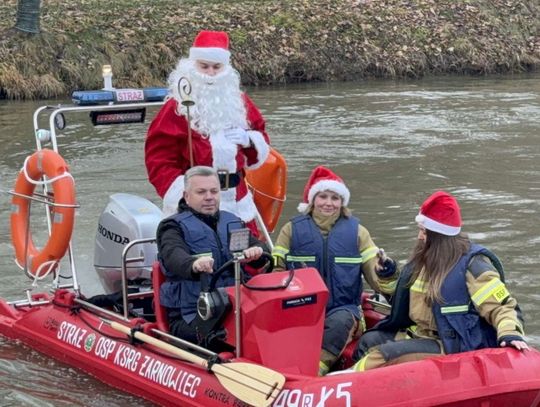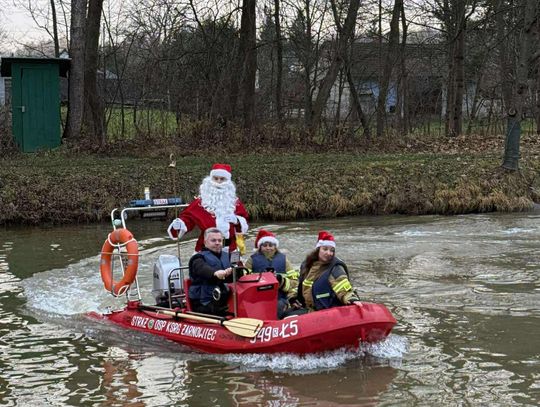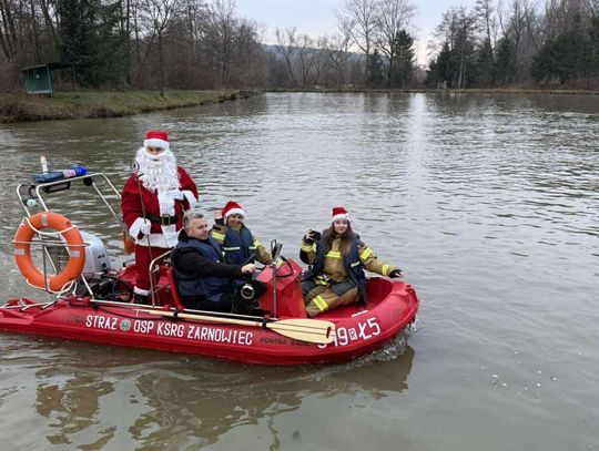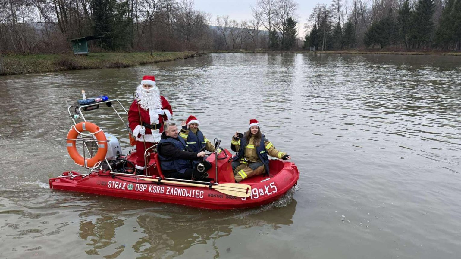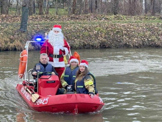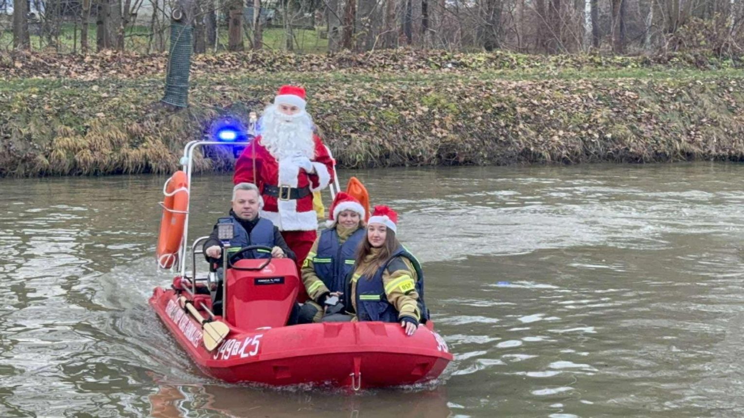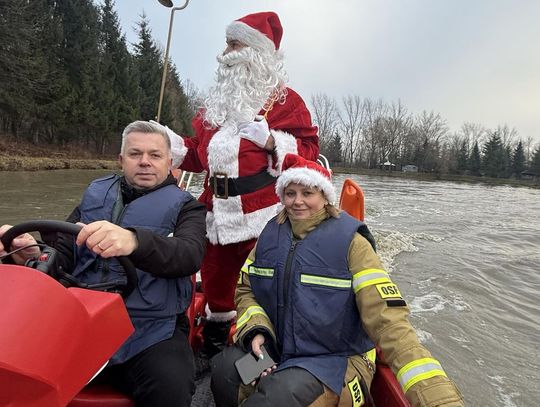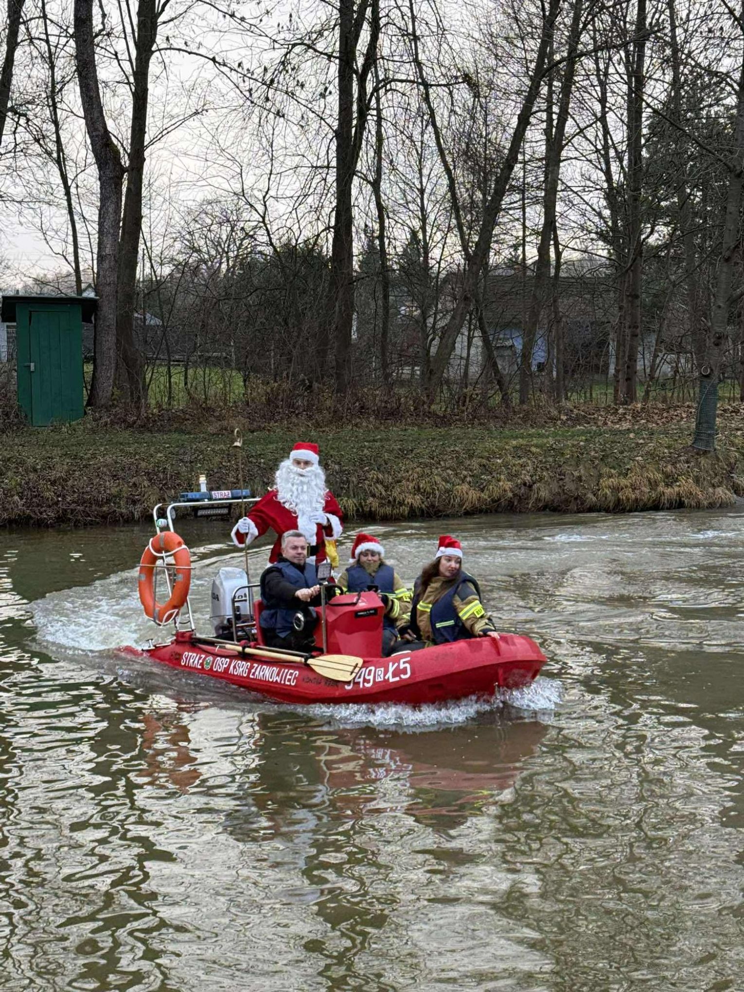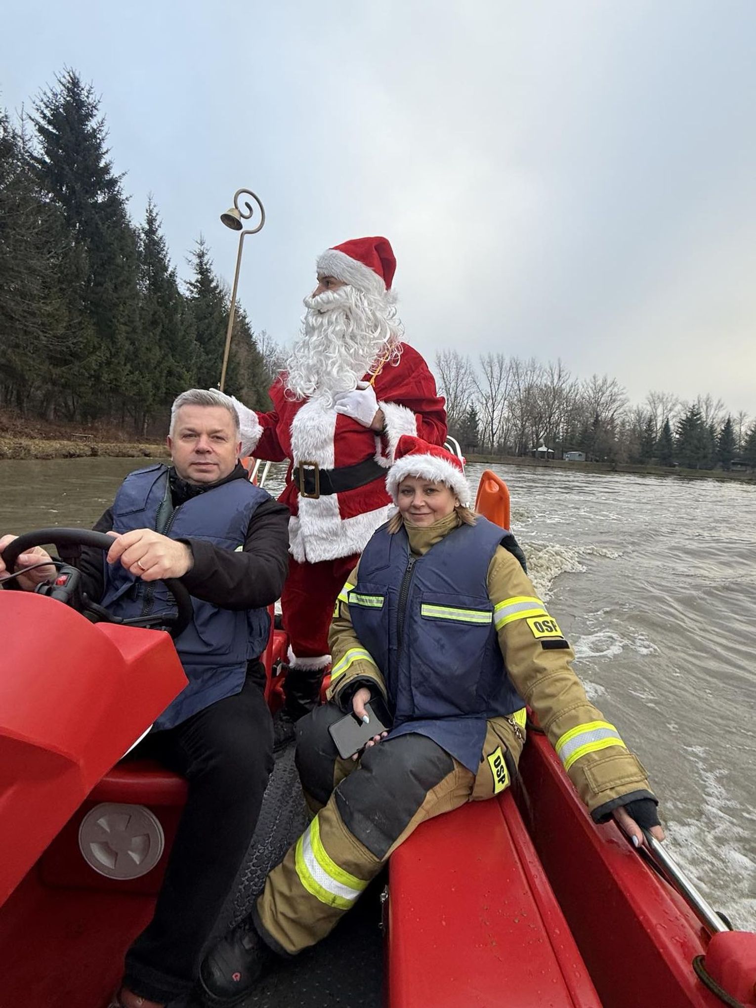 Po części szkoleniowej przyszedł czas na… świąteczną niespodziankę! Ponieważ śnieg w tym roku ustąpił miejsca wodzie, sanie i renifery musiały chwilowo przejść na emeryturę. Mikołaj – z pomocą strażaków i nowej łodzi ratowniczej – wyruszył więc w wyjątkowy rejs po gminie, by spotkać się z dziećmi i przekazać im radość nadchodzących Świąt.