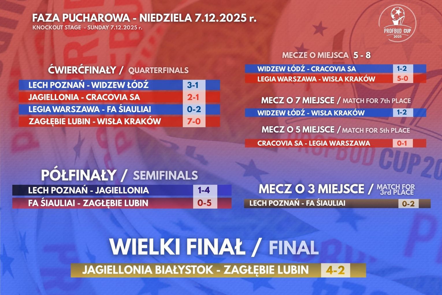 W meczu o trzecie miejsce młodzi piłkarze z FC Siauliai pokonali rówieśników z Lecha Poznań 0-2. W wielkim finale Profbud Cup zmierzyły się drużyny Jagiellonii Białystok i Zagłębia Lubin. W emocjonującym pojedynku zwyciężyli (4-2) reprezentanci Akademii Piłkarskiej Jagiellonii.