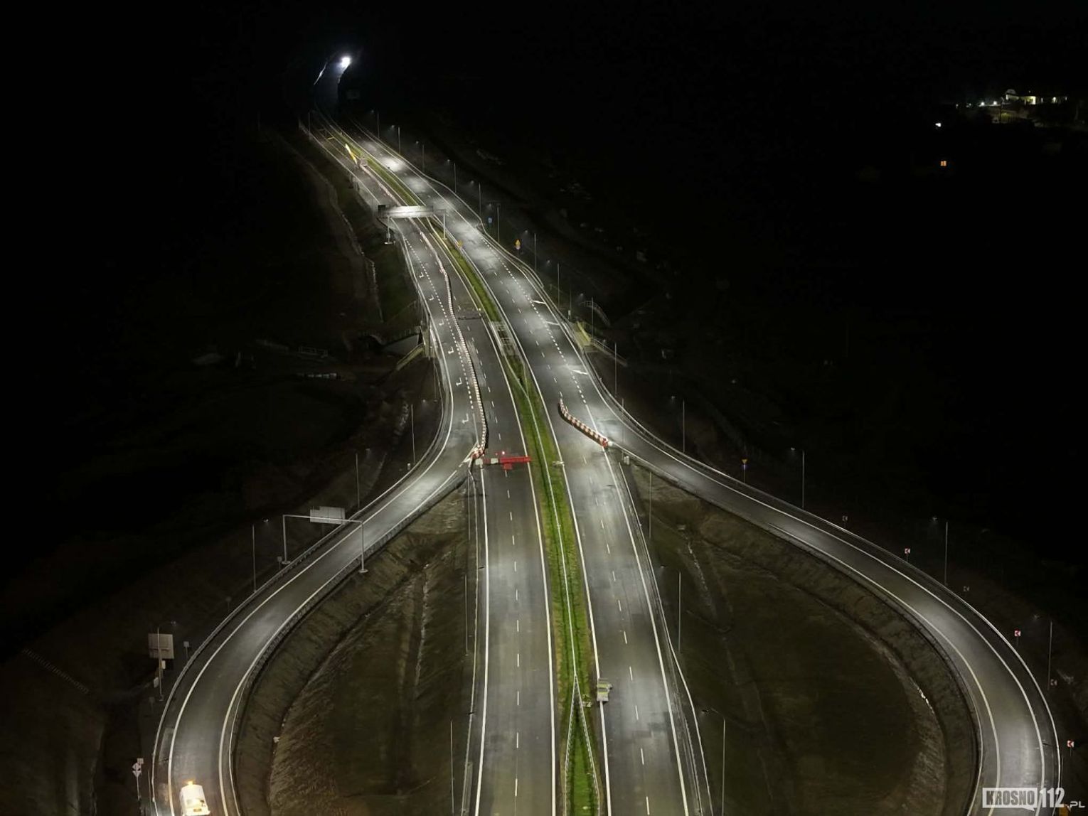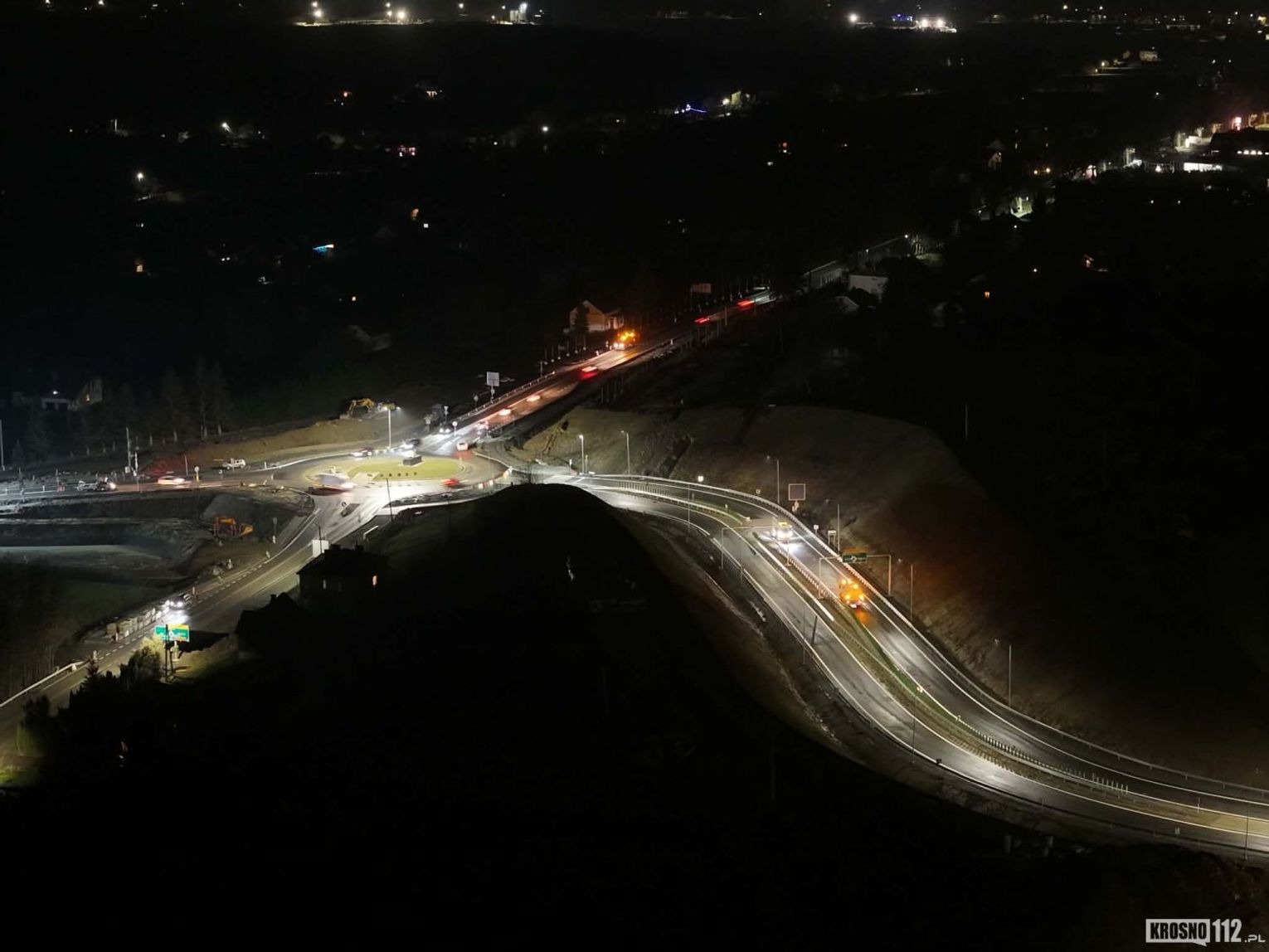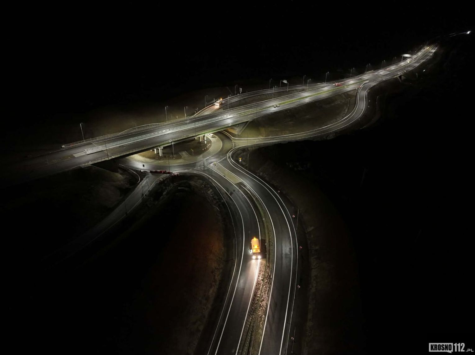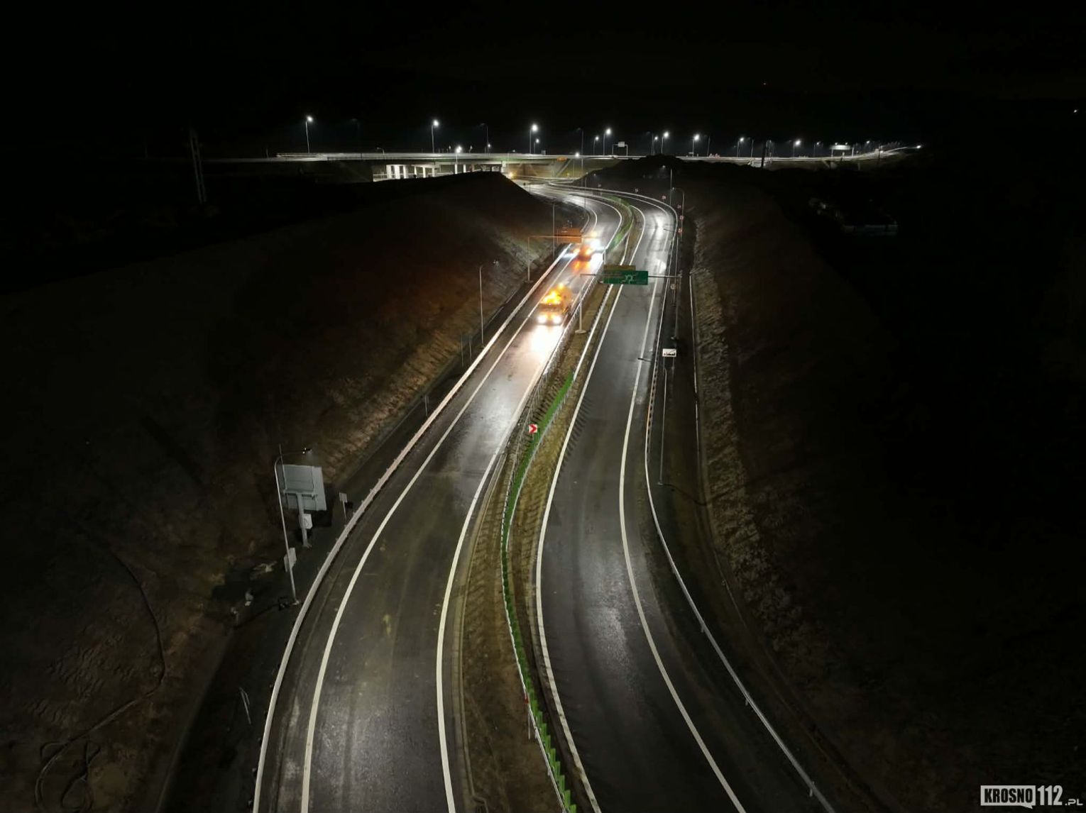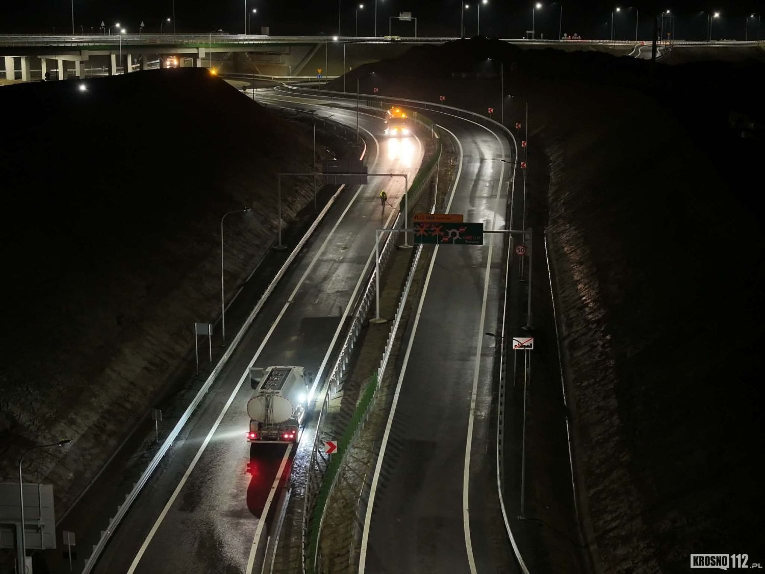 Dzisiaj prezentujemy węzeł "Dukla" nocą. Jak widać, oznakowanie pionowe i poziome jest już gotowe na przyjęcie ruchu pojazdów. Trwa czyszczenie nawierzchni.