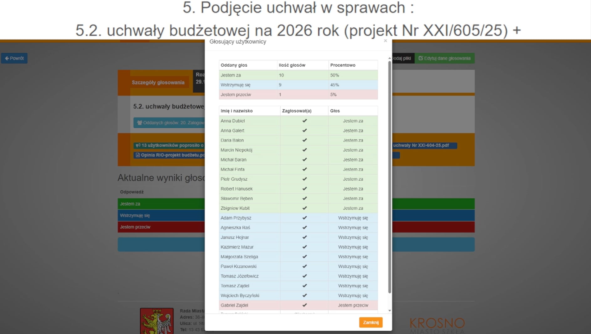 Projekt przyszłorocznego budżetu Krosna poparła tylko połowa obecnych na sesji radnych. Za przyjęciem uchwały budżetowej zagłosowali radni Klubu Samorządowego i radna Daria Balon (PO). Od głosu wstrzymali się radni PiS (8 osób) oraz radna Agnieszka Raś.
