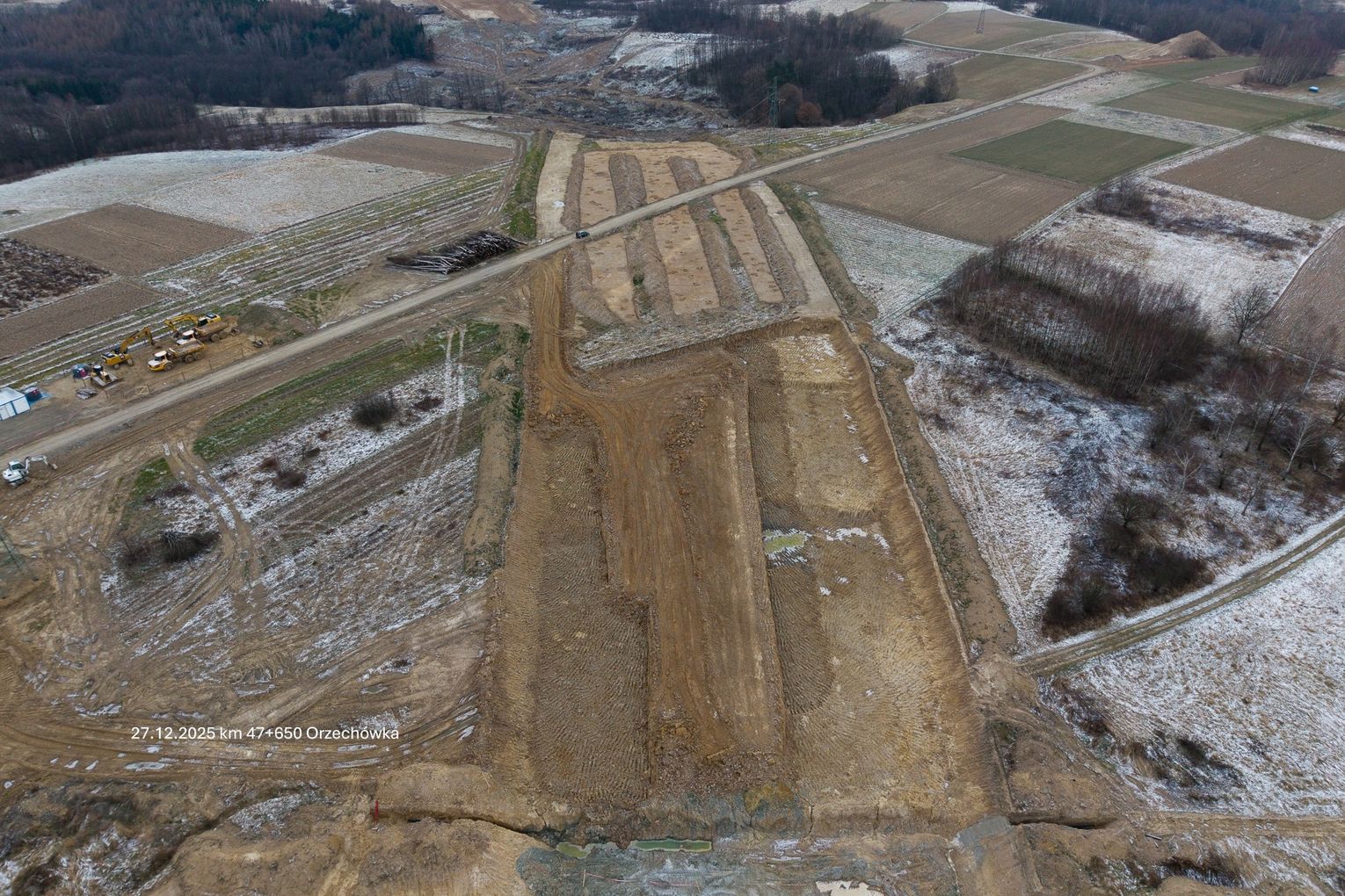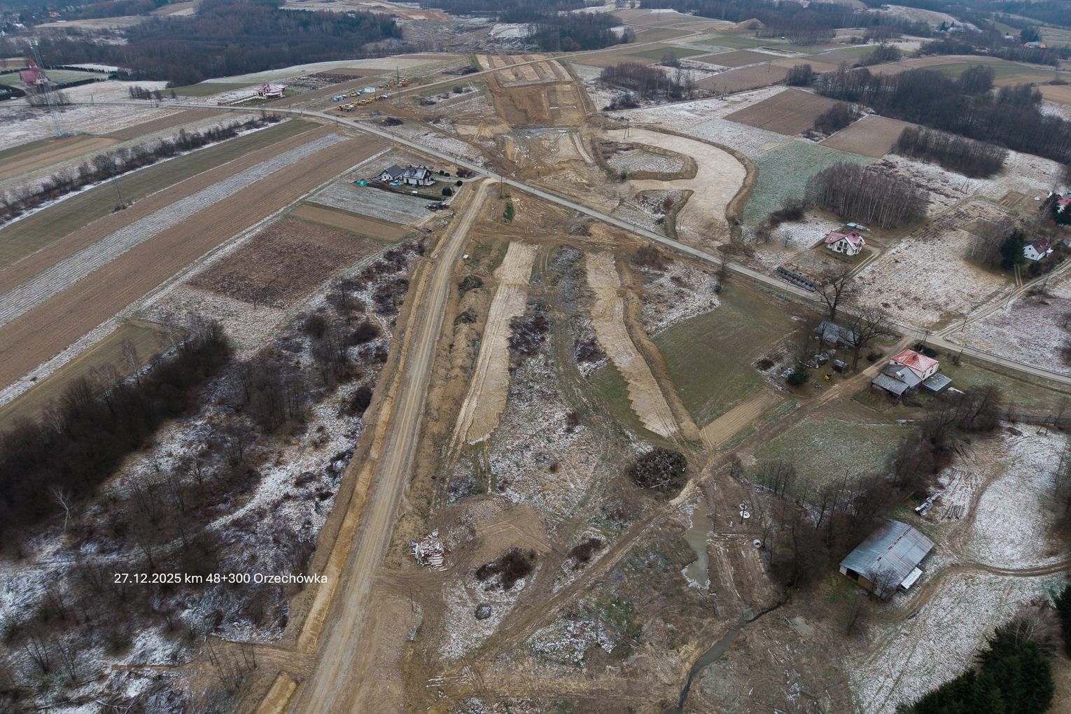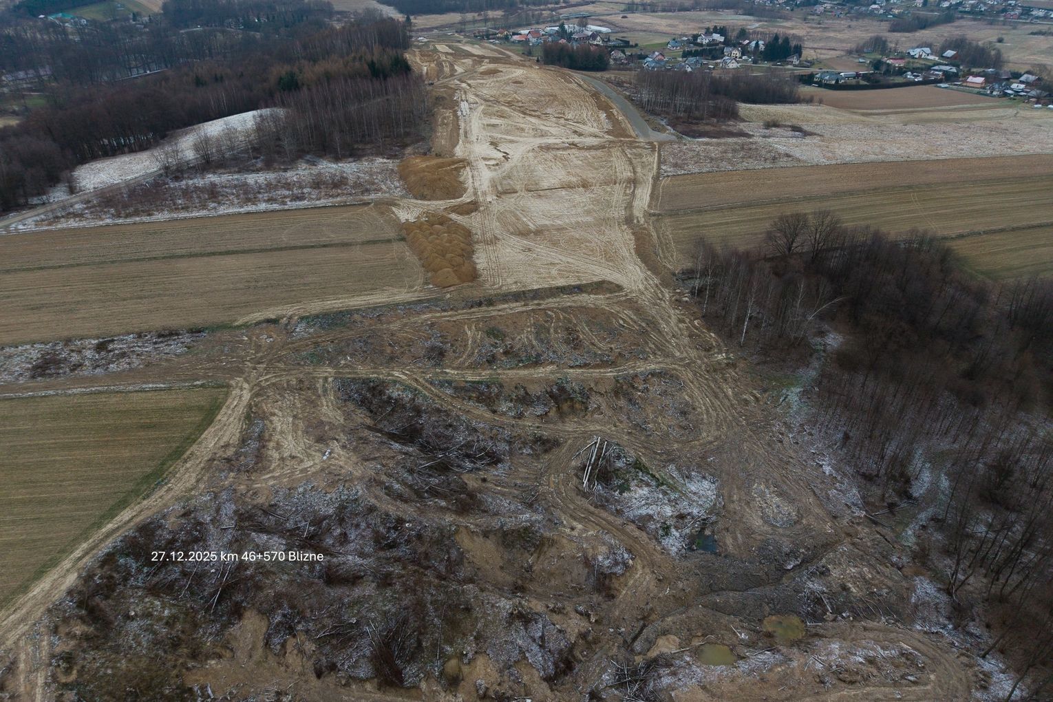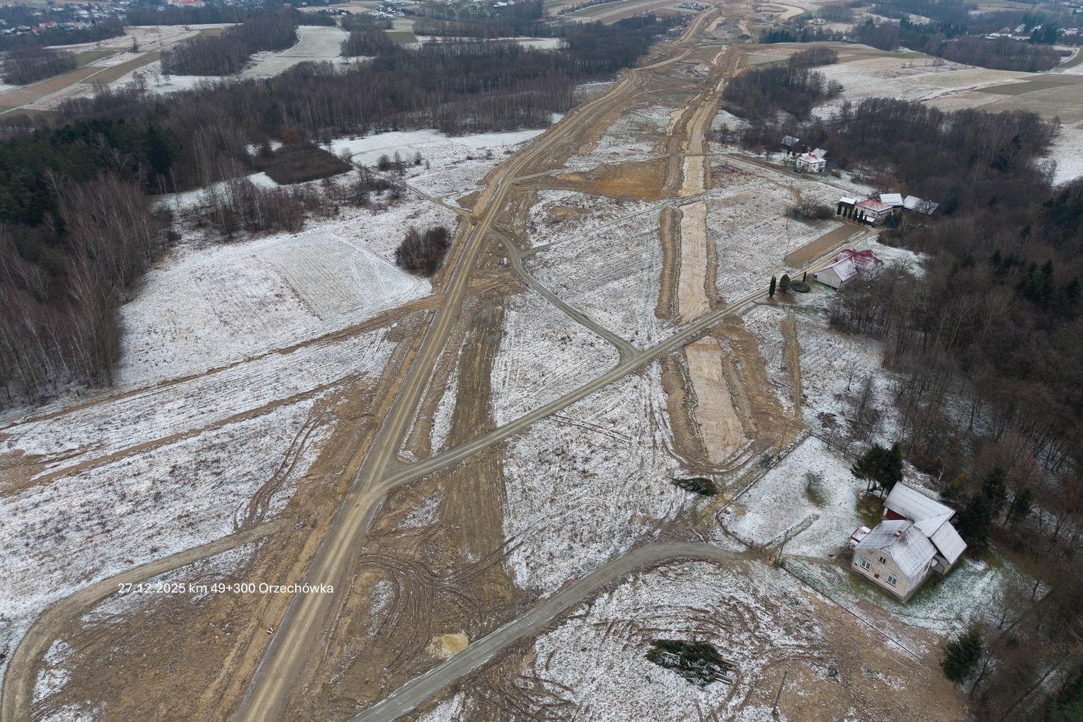 W tygodniu 8-14 grudnia 2025 r. prowadzono intensywną wycinkę drzew oraz usuwanie i mielenie karpin na terenach Lasów Państwowych, w Haczowie oraz na MOP-ie. Równolegle realizowano kolejne rozbiórki budynków w Orzechówce, Jasienicy Rosielnej i Bliznem. Postępowały roboty ziemne - odhumusowanie, wykopy i nasypy, a także prace przy obiektach mostowych i estakadach, w tym deskowanie, zbrojenie i betonowanie elementów konstrukcyjnych. Kontynuowano przebudowy sieci infrastruktury podziemnej.