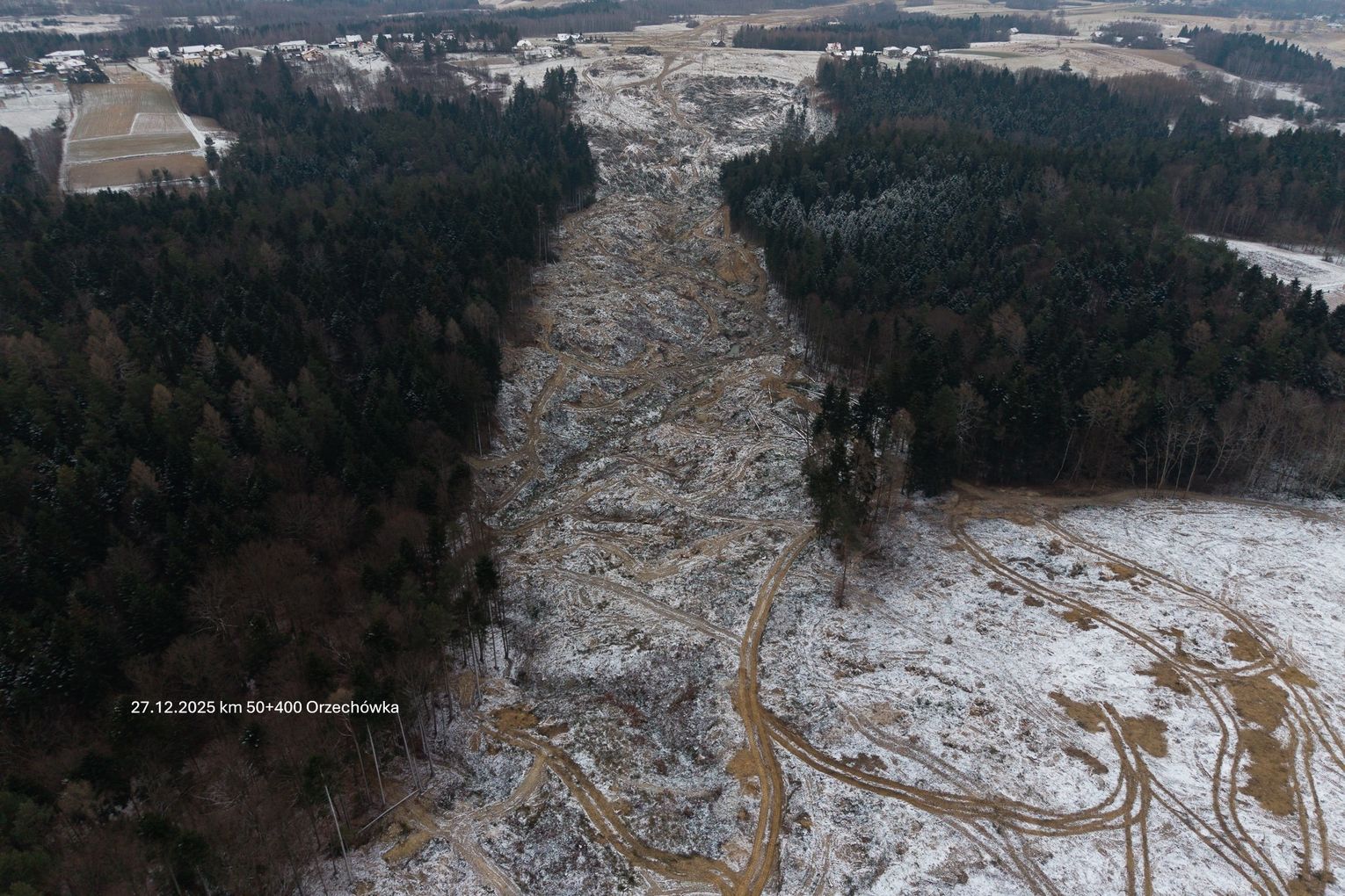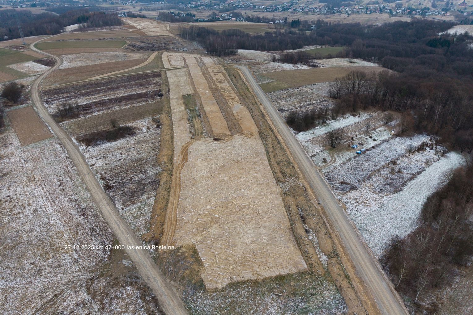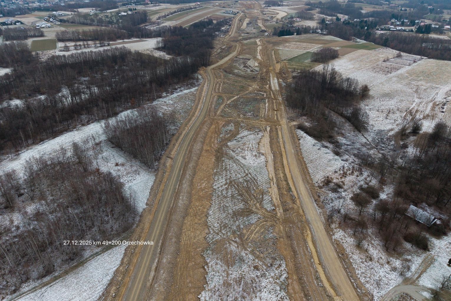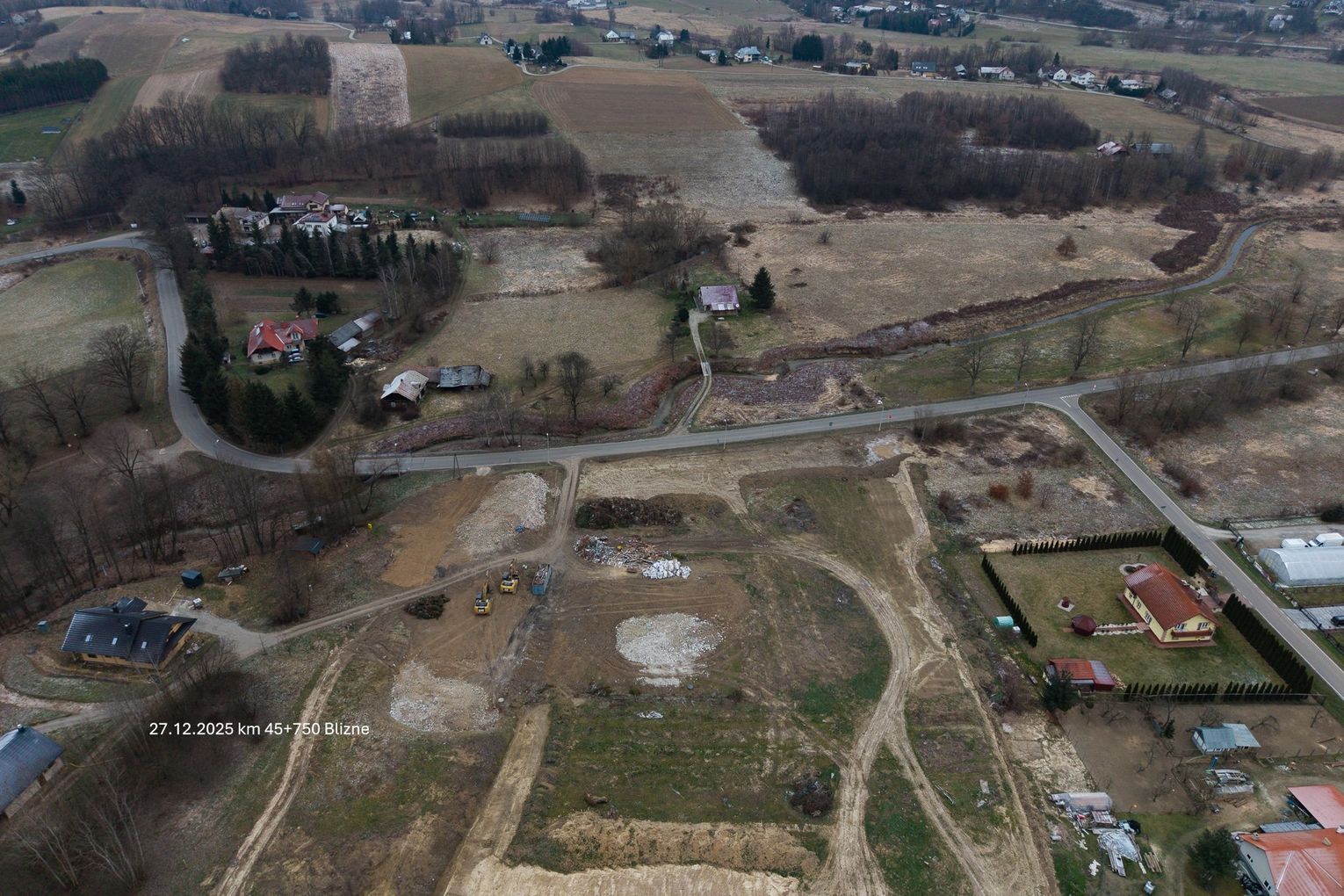 W tygodniu 8-14 grudnia 2025 r. prowadzono intensywną wycinkę drzew oraz usuwanie i mielenie karpin na terenach Lasów Państwowych, w Haczowie oraz na MOP-ie. Równolegle realizowano kolejne rozbiórki budynków w Orzechówce, Jasienicy Rosielnej i Bliznem. Postępowały roboty ziemne - odhumusowanie, wykopy i nasypy, a także prace przy obiektach mostowych i estakadach, w tym deskowanie, zbrojenie i betonowanie elementów konstrukcyjnych. Kontynuowano przebudowy sieci infrastruktury podziemnej.