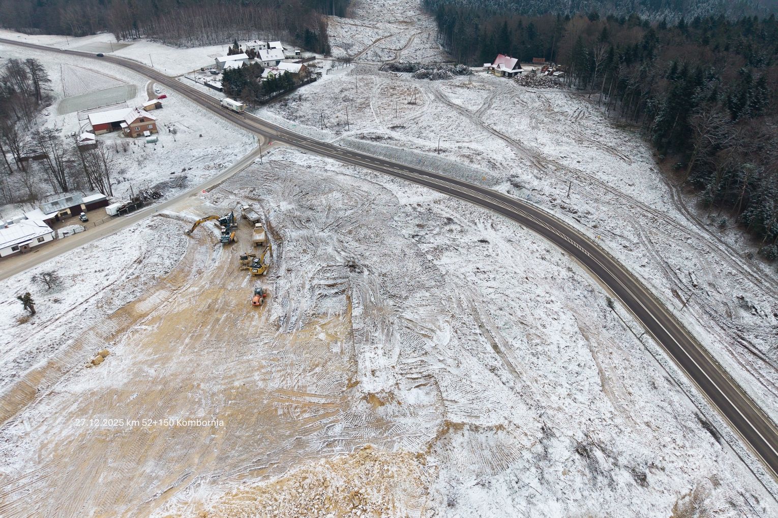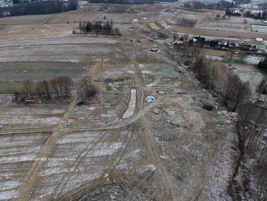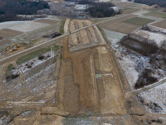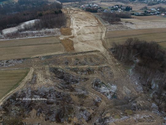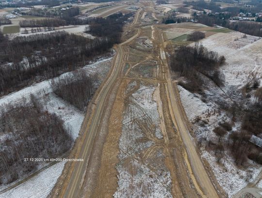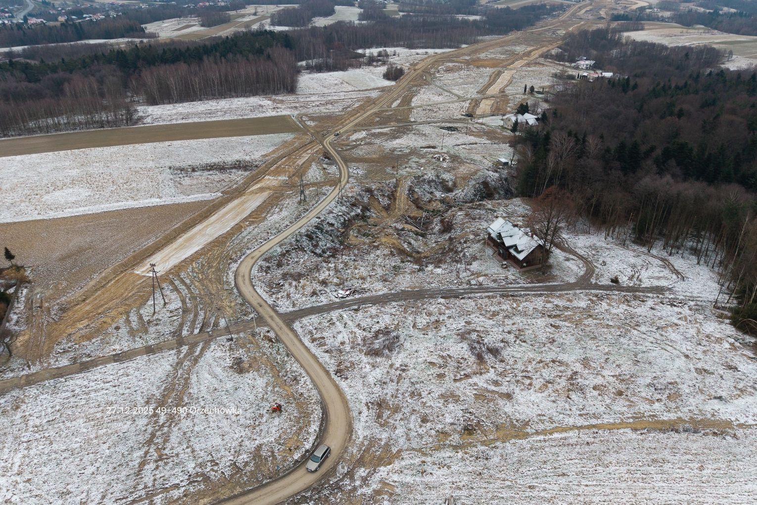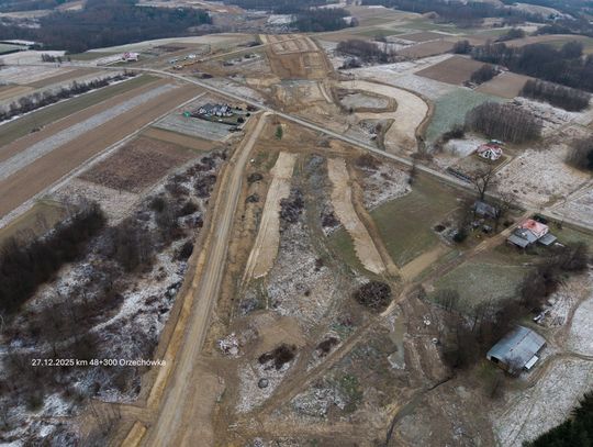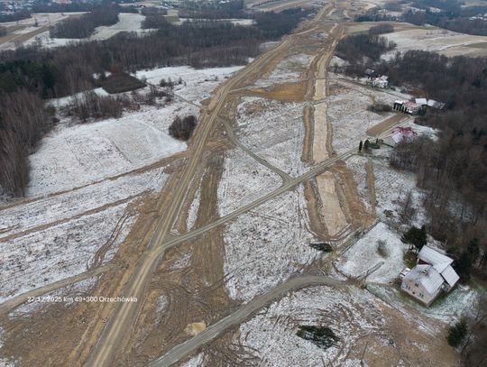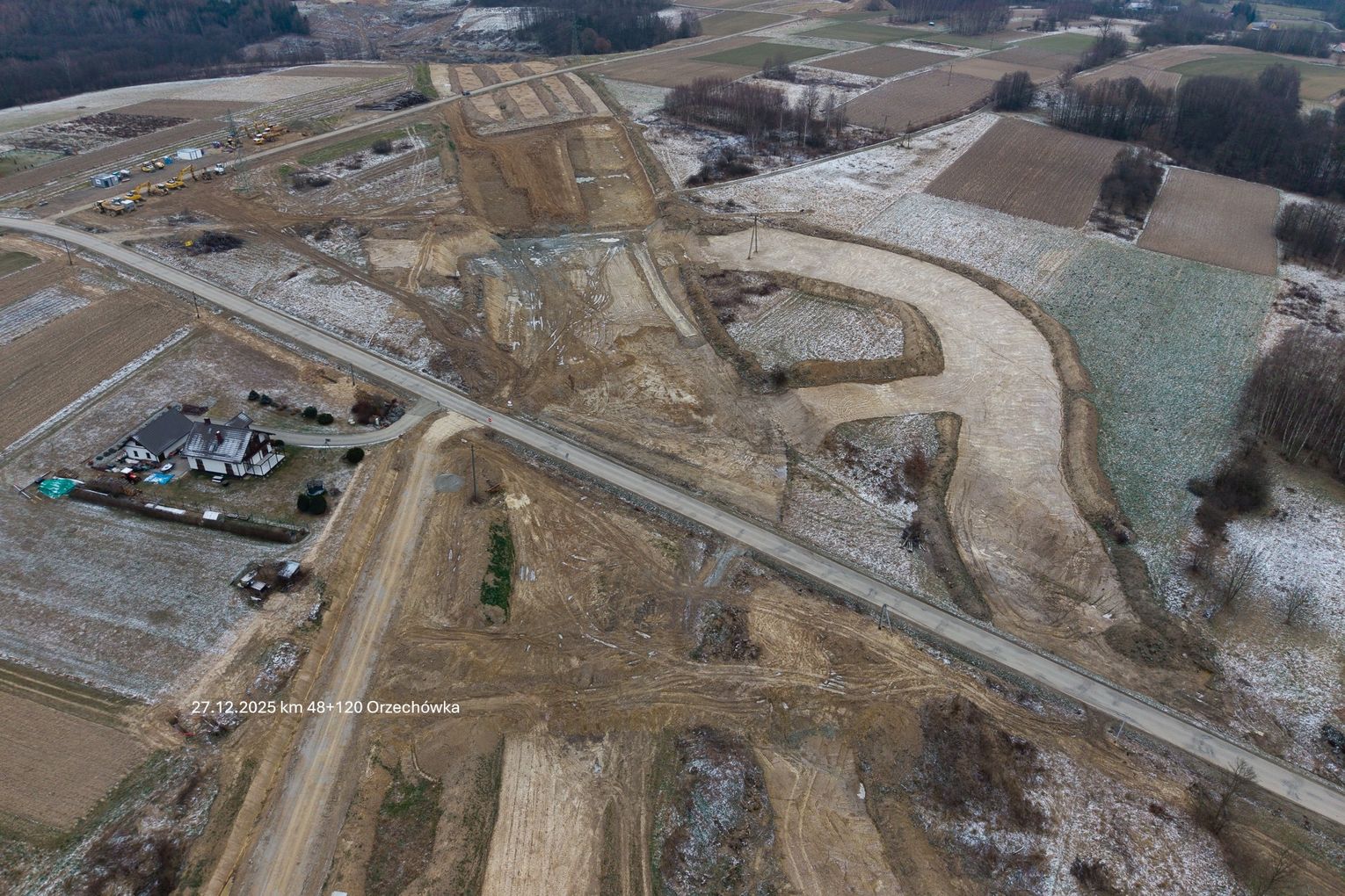 W tygodniu 8-14 grudnia 2025 r. prowadzono intensywną wycinkę drzew oraz usuwanie i mielenie karpin na terenach Lasów Państwowych, w Haczowie oraz na MOP-ie. Równolegle realizowano kolejne rozbiórki budynków w Orzechówce, Jasienicy Rosielnej i Bliznem. Postępowały roboty ziemne - odhumusowanie, wykopy i nasypy, a także prace przy obiektach mostowych i estakadach, w tym deskowanie, zbrojenie i betonowanie elementów konstrukcyjnych. Kontynuowano przebudowy sieci infrastruktury podziemnej.