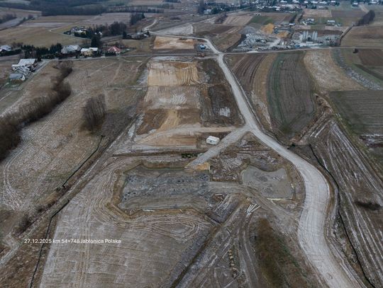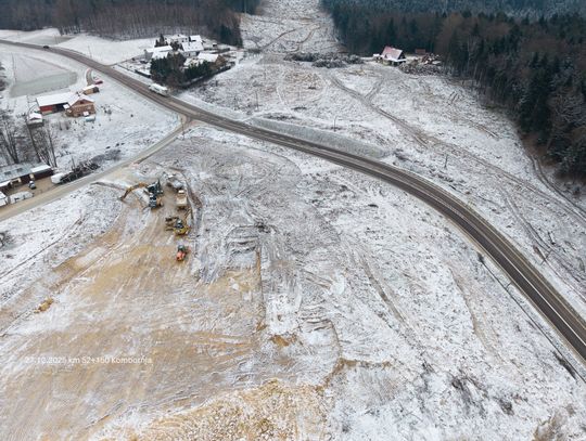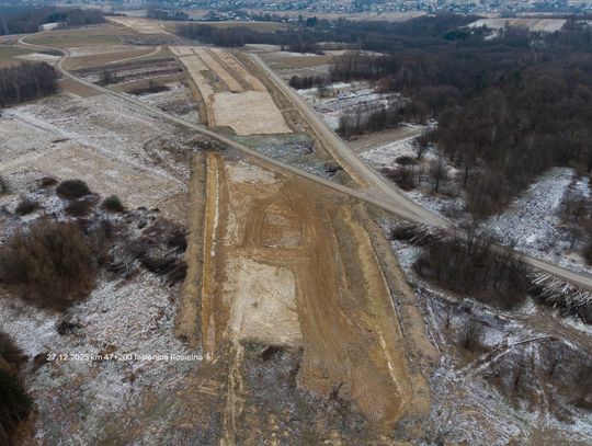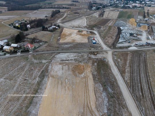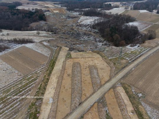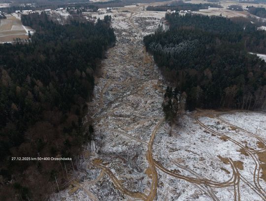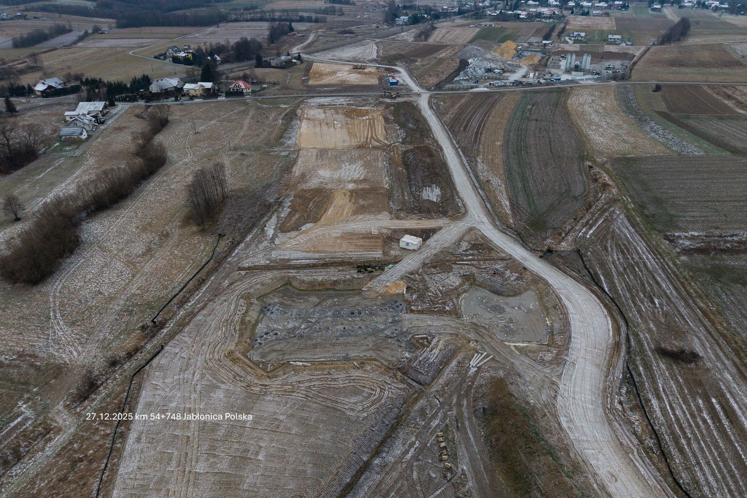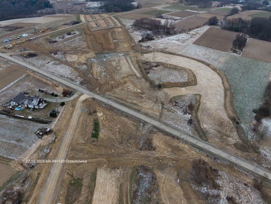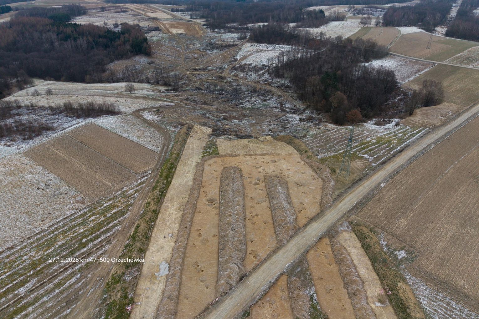 W dniach 1-7 grudnia 2025 r. prowadzono przede wszystkim transport i magazynowanie materiałów budowlanych, w tym kruszyw, piasku i pospółki. Równolegle realizowano rozbiórki budynków w Orzechówce oraz prace ziemne - odhumusowanie i wykopy na wybranych odcinkach trasy oraz na terenie MOP „Zagórze” (prawy). Intensywnie pracowano także przy obiektach inżynierskich, m.in. PS-1-5, MS-1-6 oraz ES-1-26. Całość robót odbywała się pod stałym nadzorem archeologicznym, saperskim i przyrodniczym. Kontynuowano również przebudowę licznych kolizji sanitarnych, wodociągowych, gazowych, elektroenergetycznych i teletechnicznych.