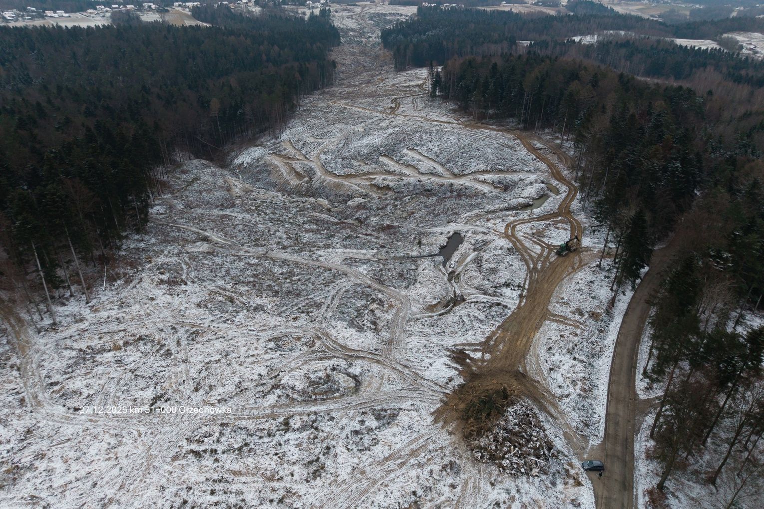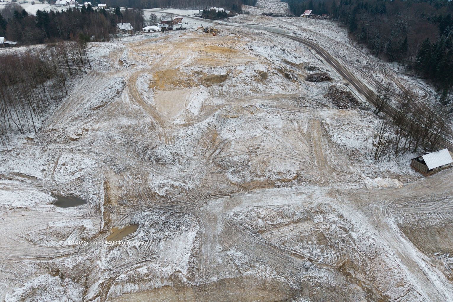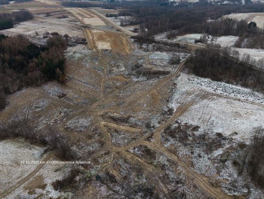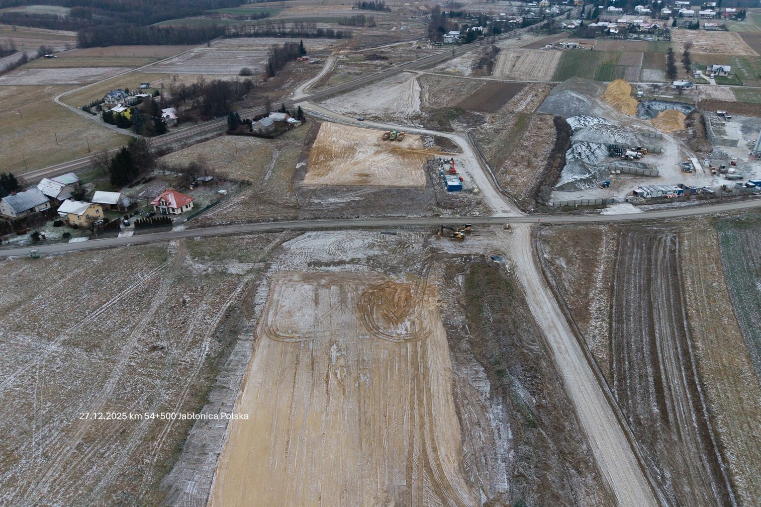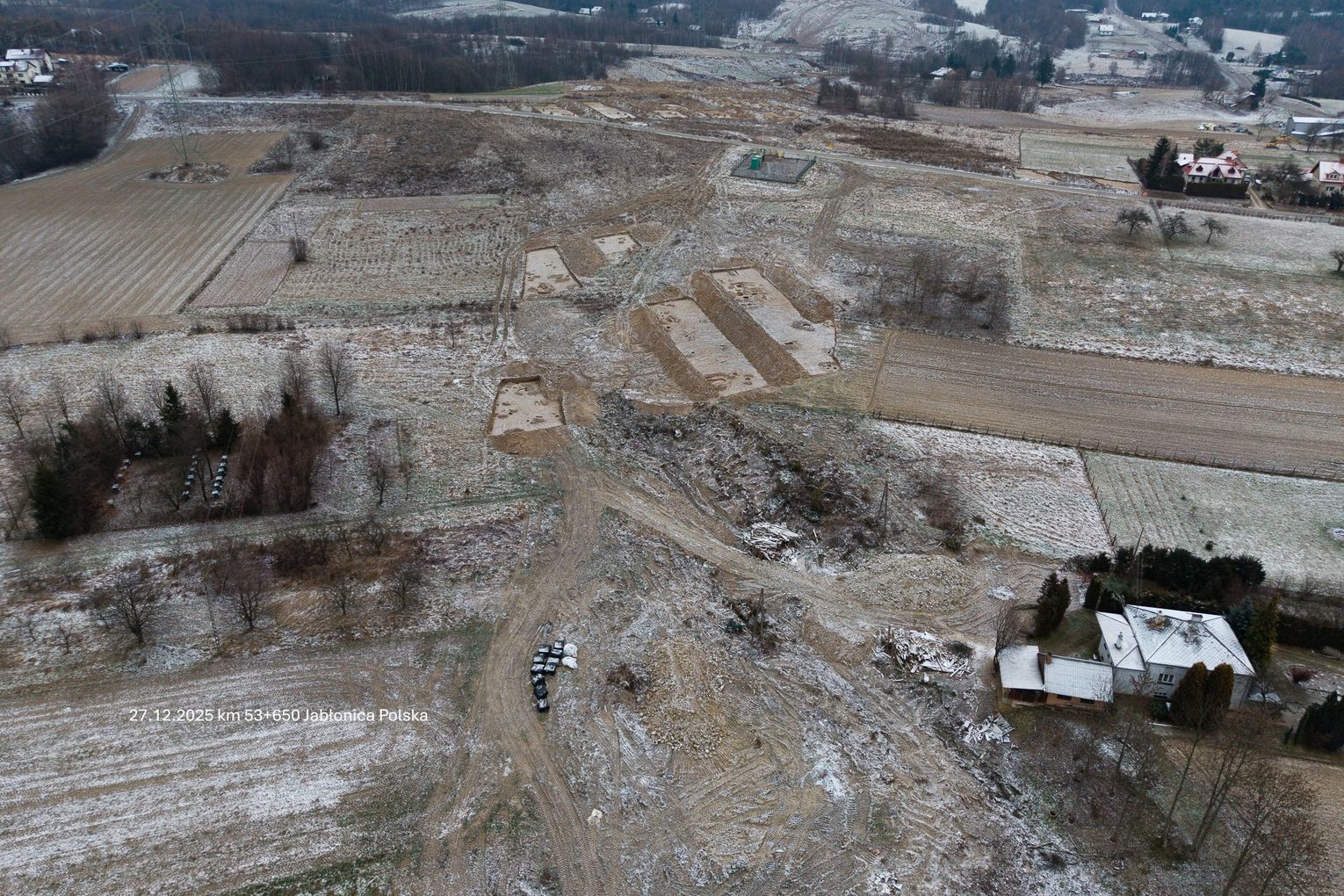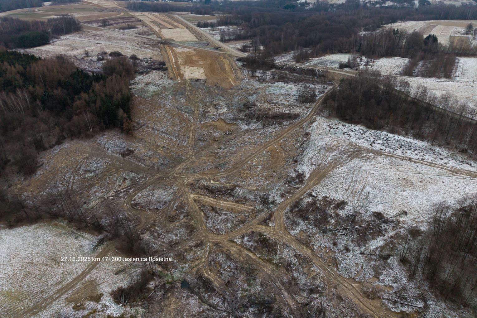 W ostatnim tygodniu przed końcem roku, 22-28 grudnia 2025 r., roboty miały charakter uzupełniający i zabezpieczający. Skupiono się na usuwaniu oraz składowaniu karpin na terenach Lasów Państwowych, a także na pracach porządkowych związanych z przerwą świąteczną. Jednocześnie kontynuowano wybrane prace konstrukcyjne, w tym zbrojenie elementów obiektu PS-1-5 oraz wykonywanie pali prefabrykowanych pod podpory tymczasowe na obiektach MS-1-8 i ES-1-26.