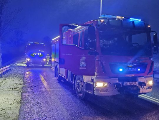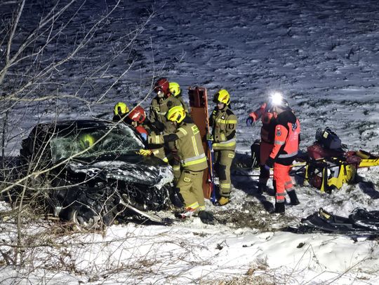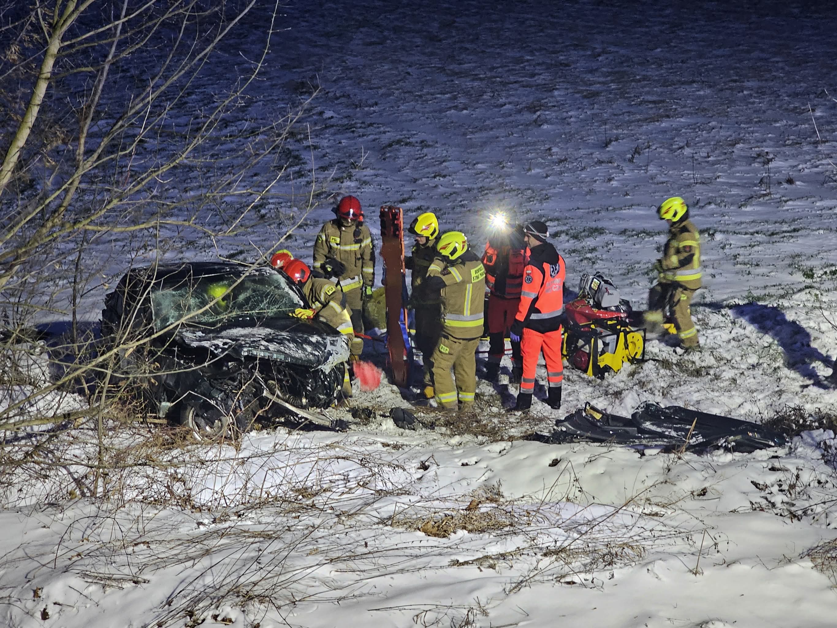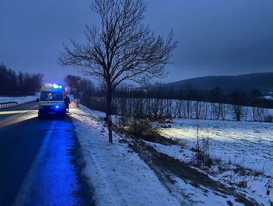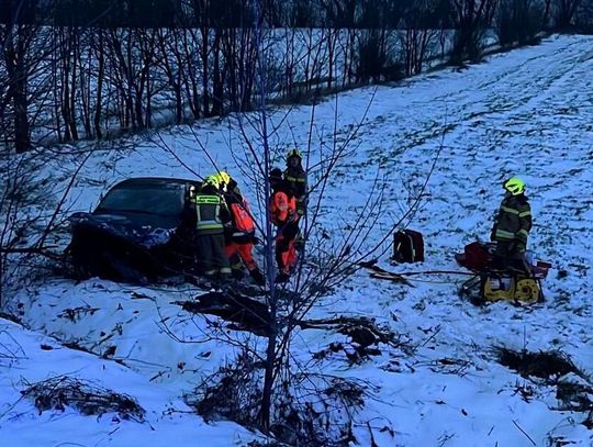 Wstępnie ustalono, że kierujący samochodem osobowym stracił panowanie nad pojazdem, uderzył w drzewo i wypadł z drogi kończąc jazdę na pobliskim polu uprawnym. Jedna osoba jest zakleszczona, strażacy uwalniają ją przy pomocy sprzętu hydraulicznego.