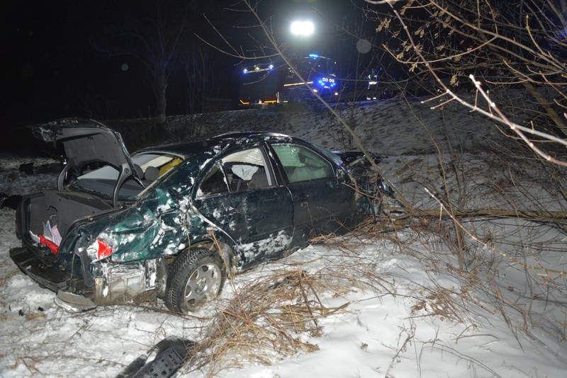 Wstępnie ustalono, że kierujący samochodem osobowym stracił panowanie nad pojazdem, uderzył w drzewo i wypadł z drogi kończąc jazdę na pobliskim polu uprawnym. Jedna osoba jest zakleszczona, strażacy uwalniają ją przy pomocy sprzętu hydraulicznego.
