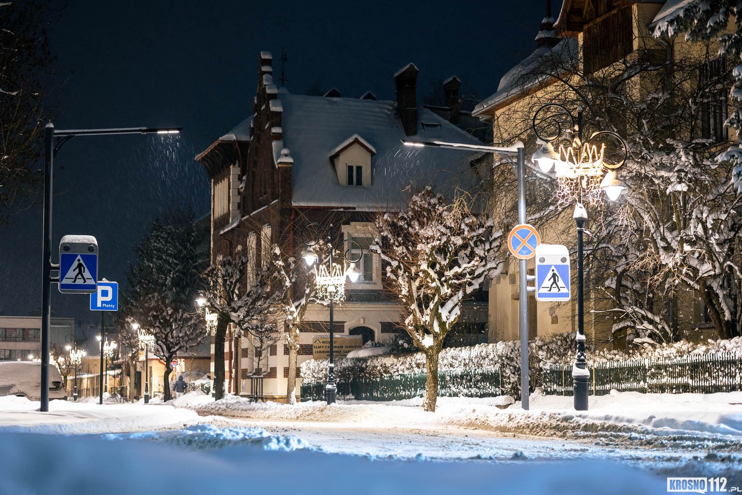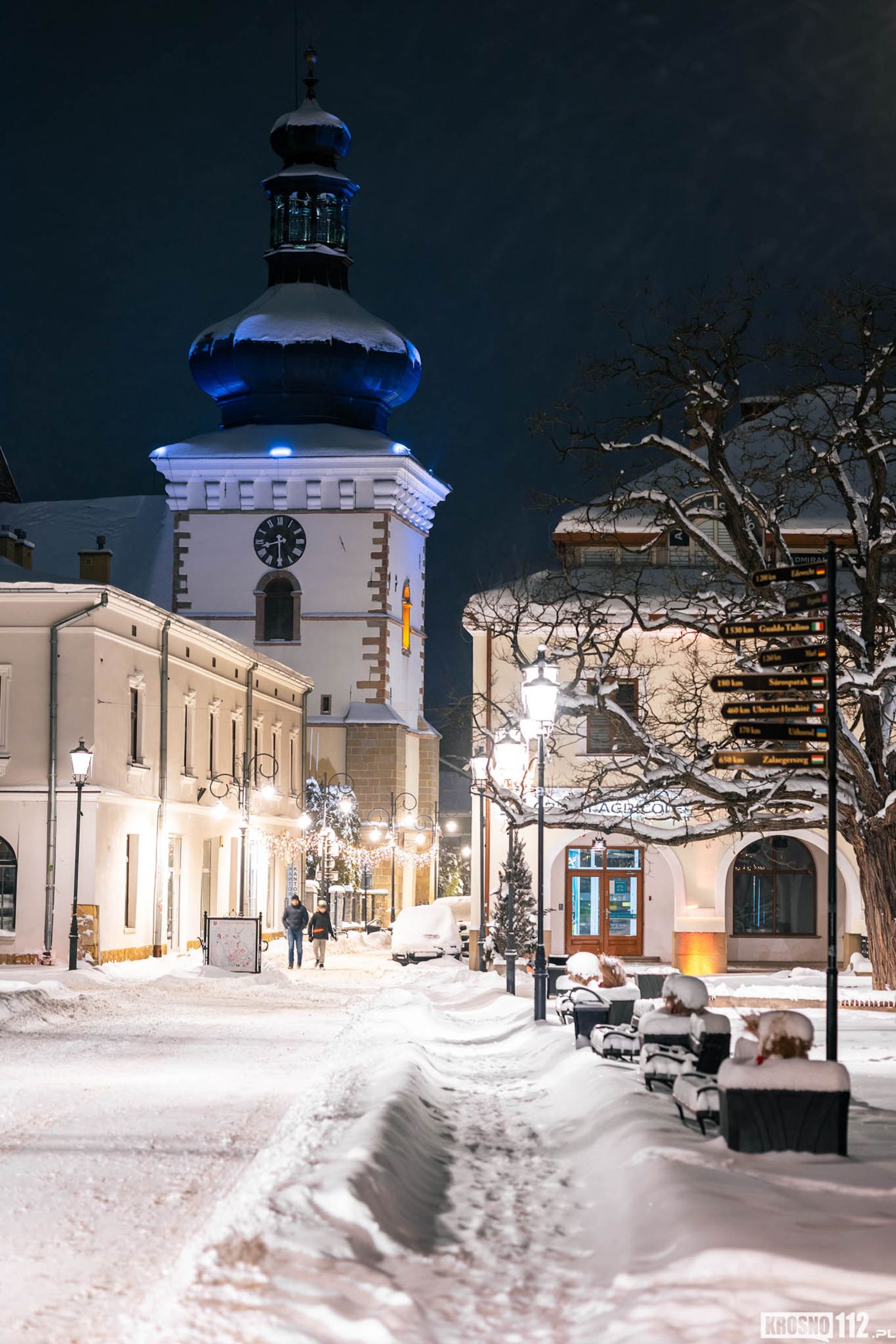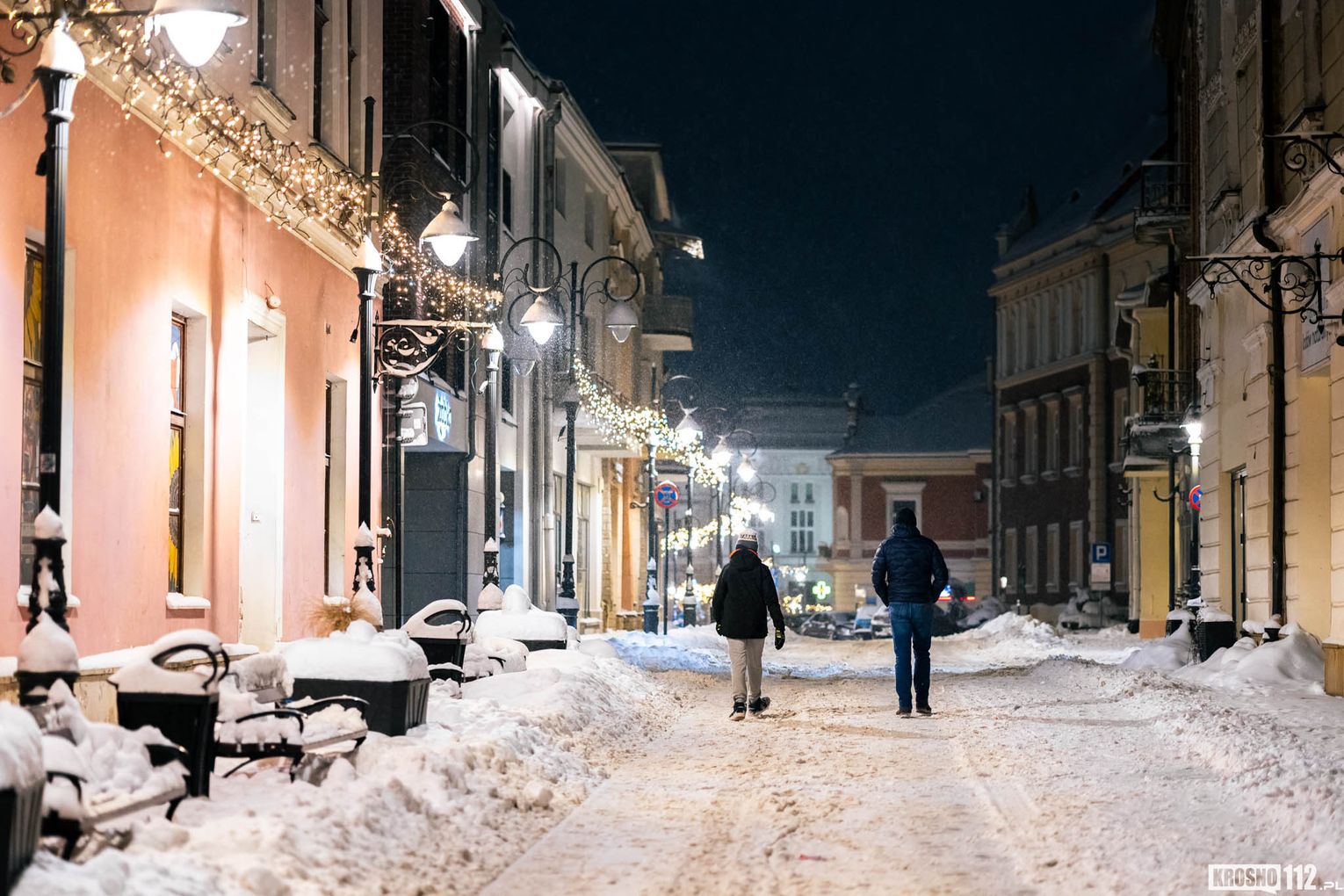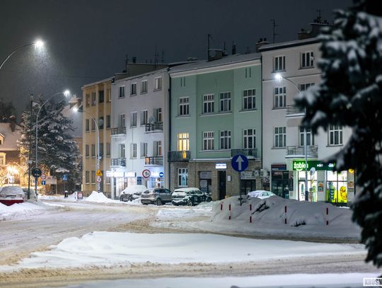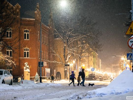 Fotografie pokazują Krosno z zupełnie innej perspektywy – ciche, spokojne ulice przykryte grubą warstwą śniegu, oszronione drzewa w parkach, rynek skąpany w zimowym półmroku oraz panoramy miasta widziane przez zimową mgłę. Kadry oddają zarówno surowość zimowej aury, jak i jej nieoczywiste piękno.