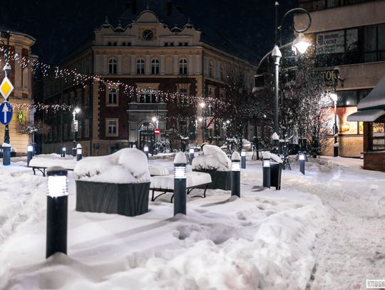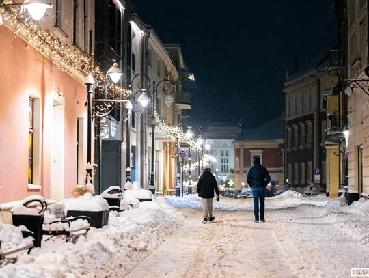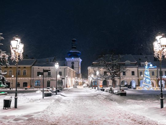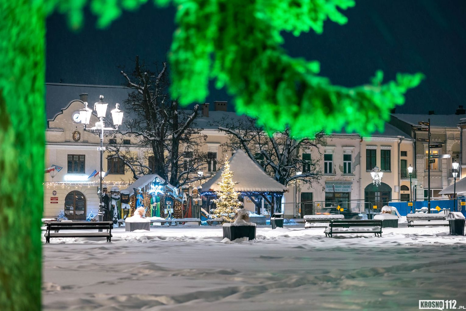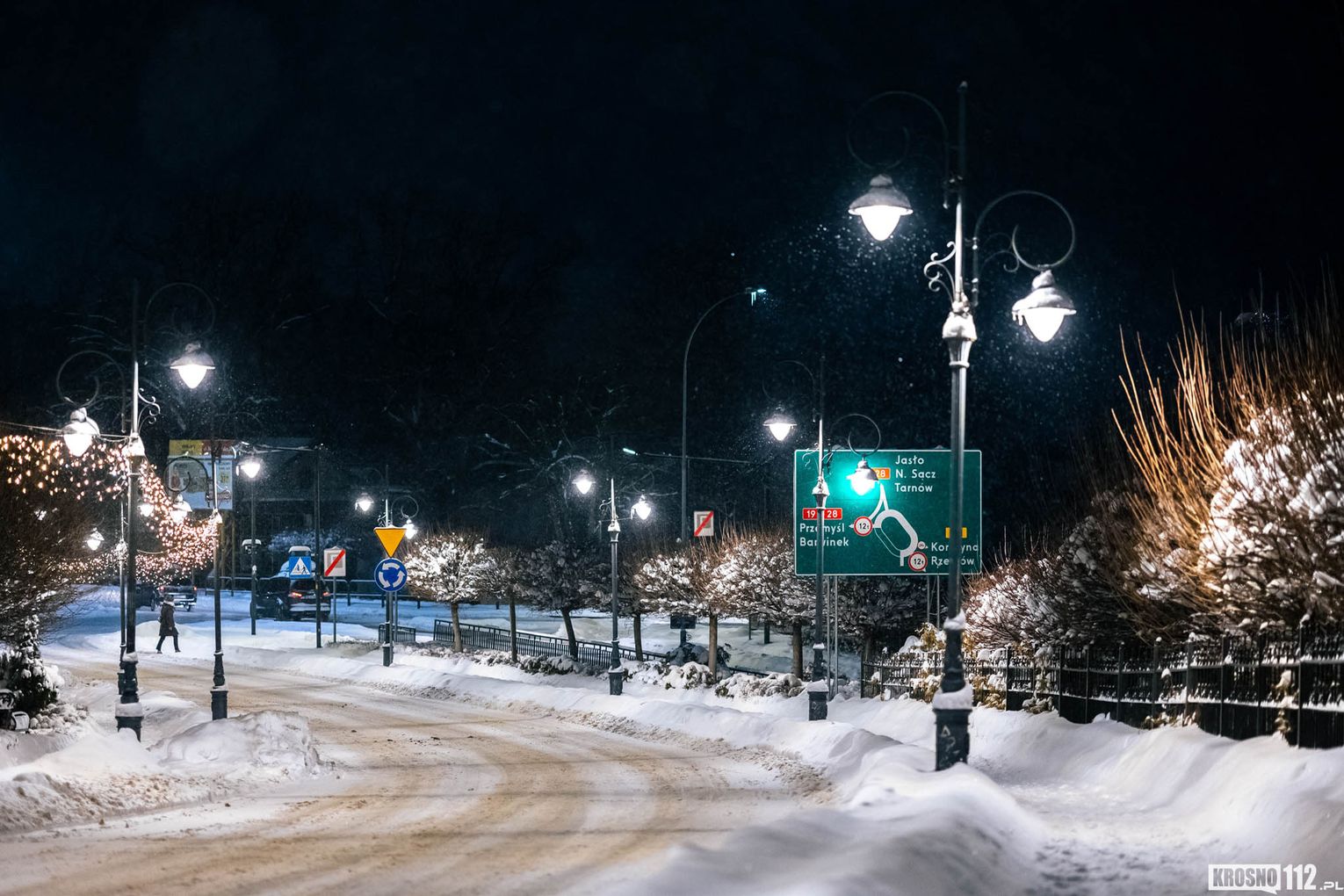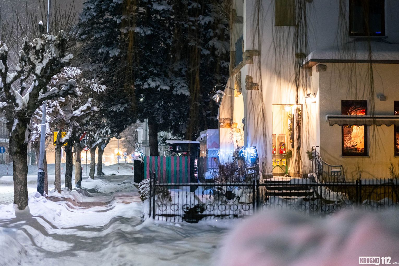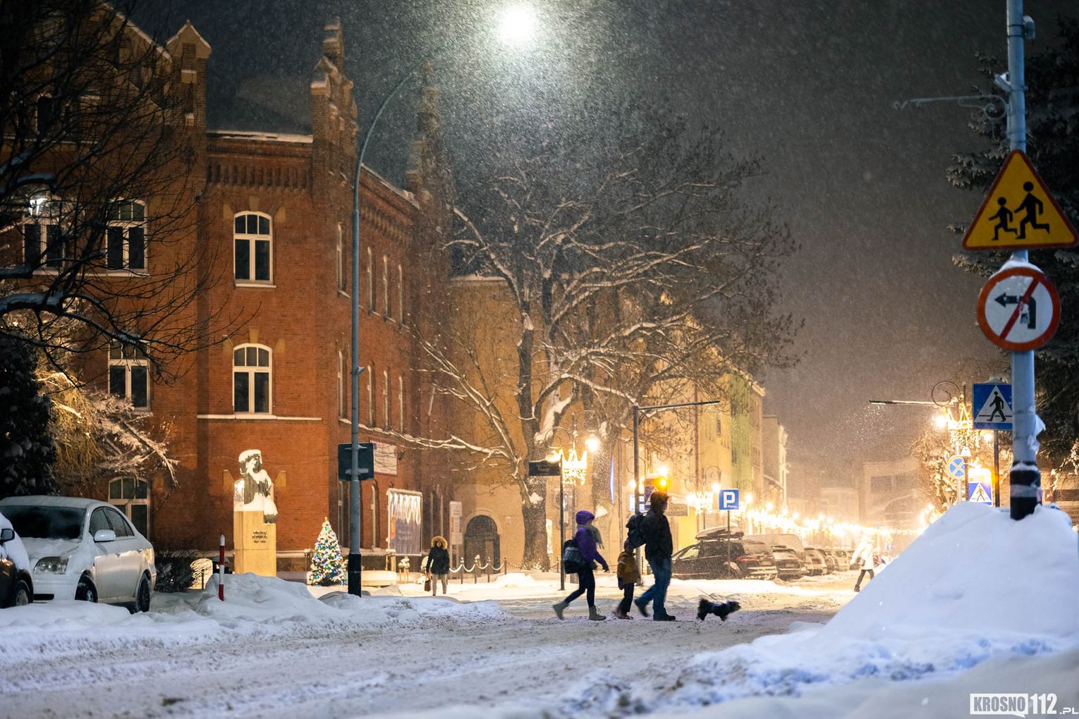 Fotografie pokazują Krosno z zupełnie innej perspektywy – ciche, spokojne ulice przykryte grubą warstwą śniegu, oszronione drzewa w parkach, rynek skąpany w zimowym półmroku oraz panoramy miasta widziane przez zimową mgłę. Kadry oddają zarówno surowość zimowej aury, jak i jej nieoczywiste piękno.