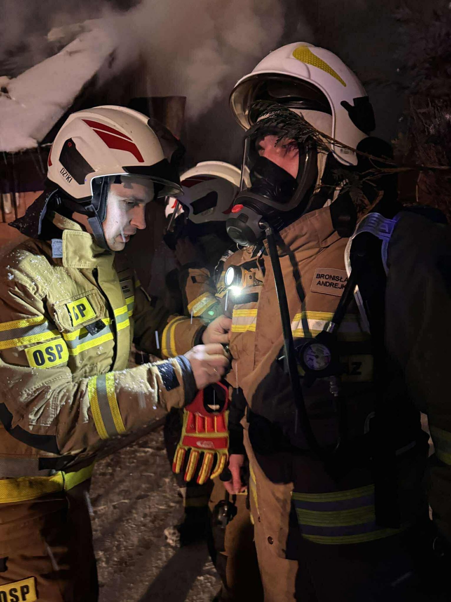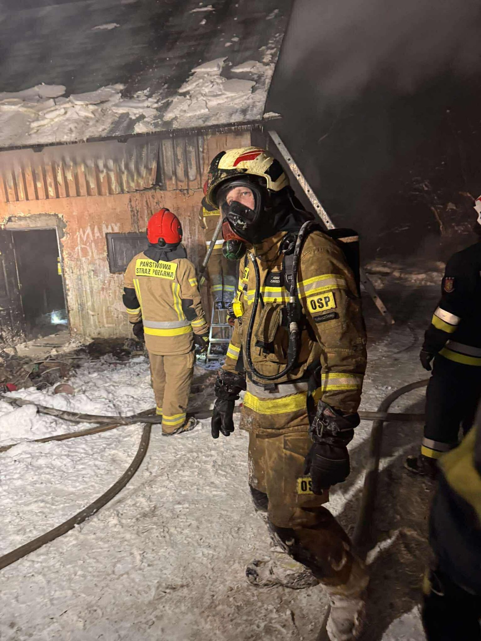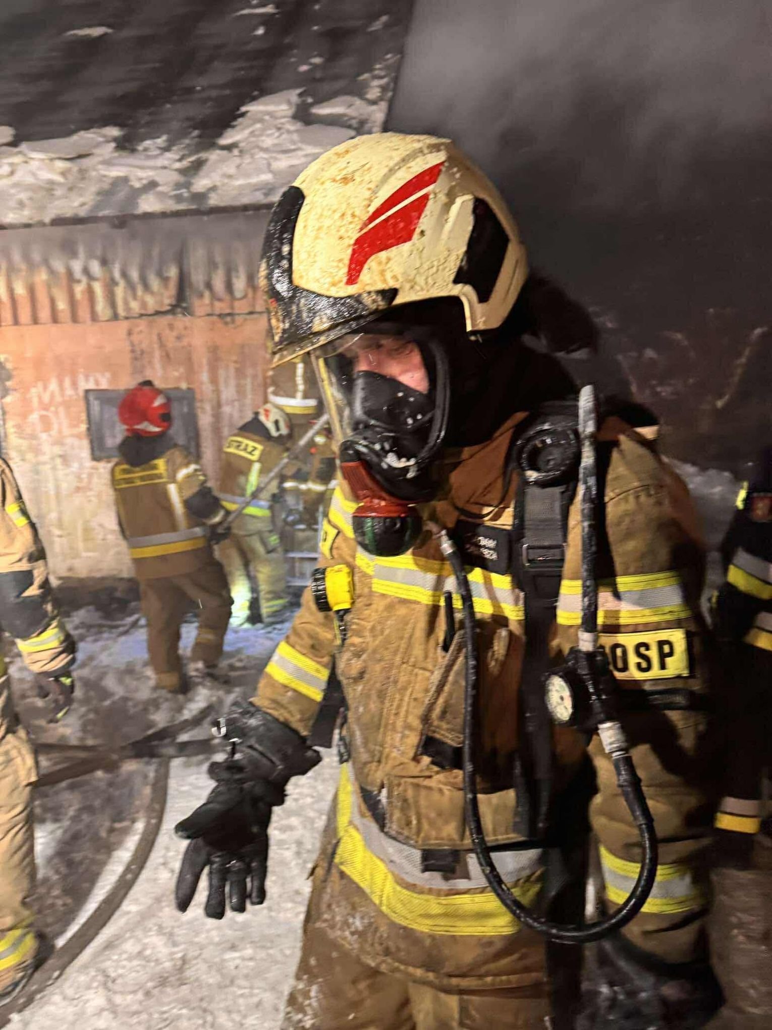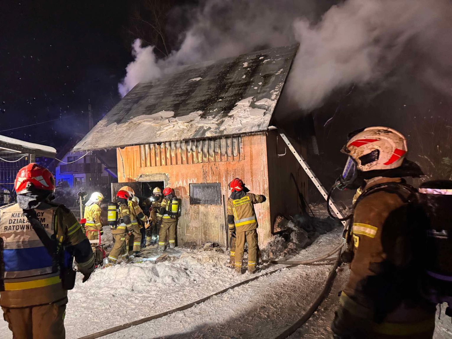 🔴 Po dotarciu na miejsce utworzone zostaje zasilanie z naszych samochodów do jednostek pracujących na miejscu. Pierwsza rota w aparatach OUO przystępuje do pomocy w gaszeniu budynku z zewnątrz a następnie wewnątrz. Podczas próby ugaszenia budynku wewnątrz dochodzi do niekontrolowanych wybuchów środków znajdujących się w środku. Wszyscy ratownicy zostają wycofani. Po szybkiej rozmowie z KDR wykonujemy 2 otwory w jednej ze ścian zewnętrznych a następnie wprowadzamy prąd wody przy pomocy lancy przebijającej.