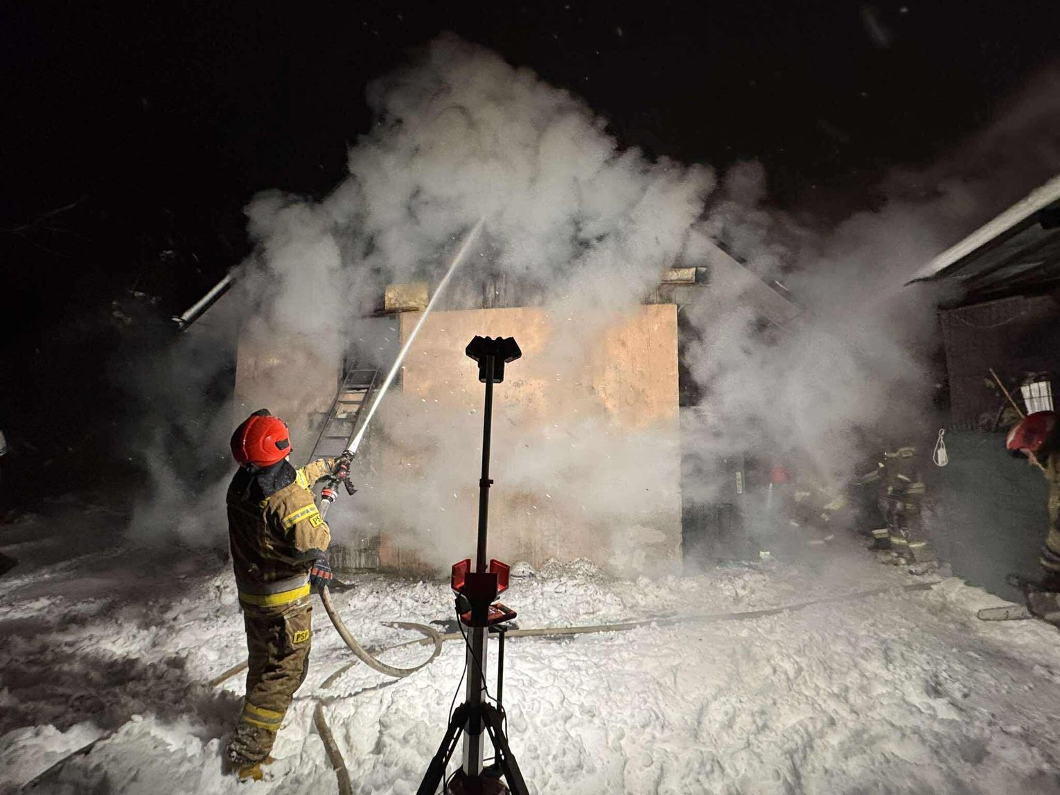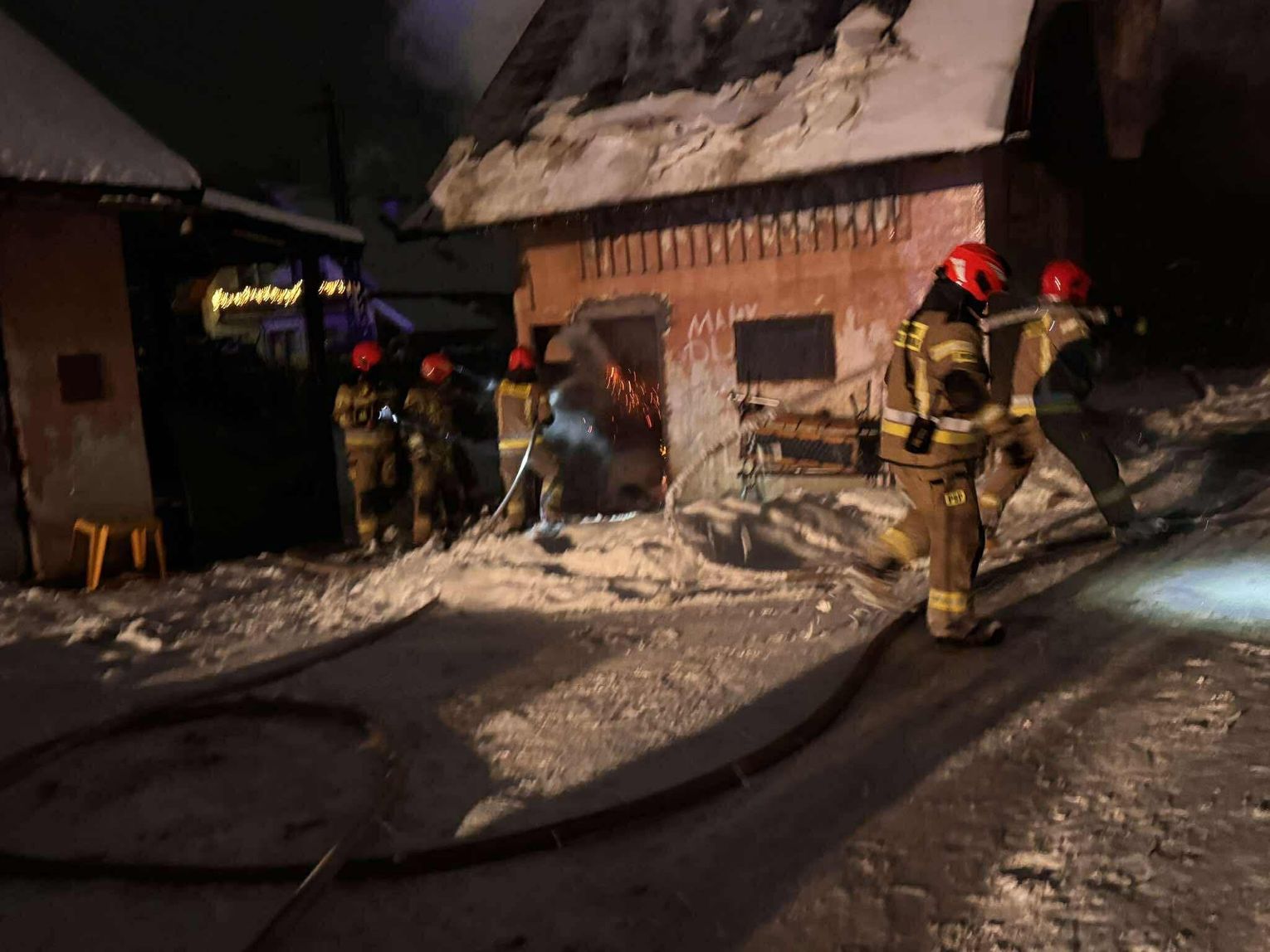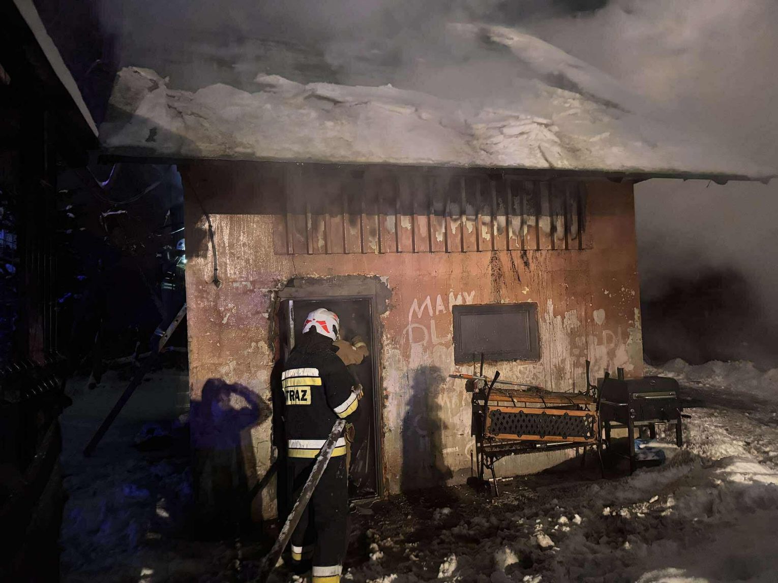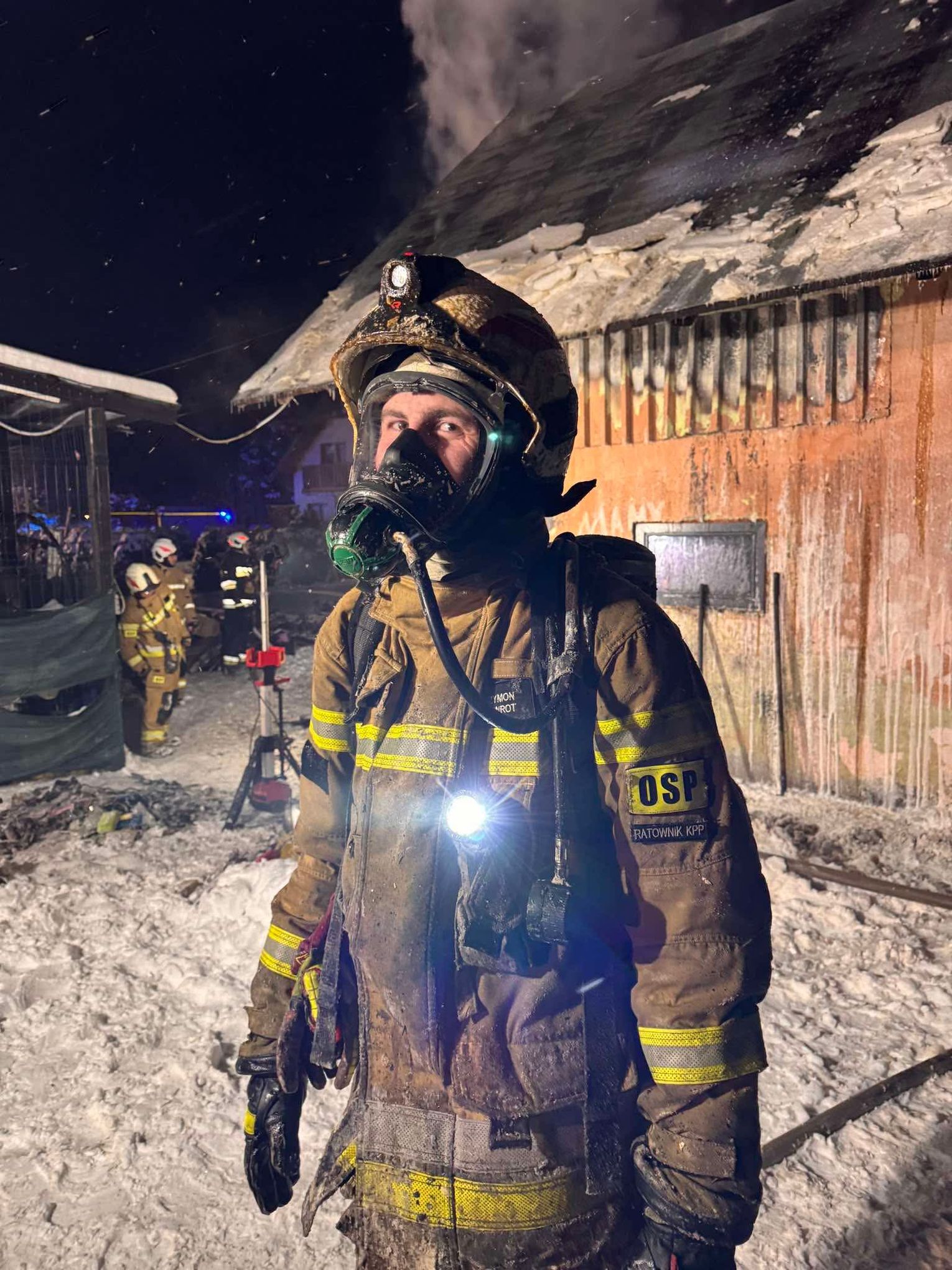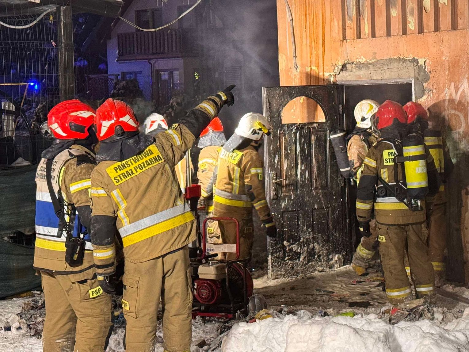 🔴 Po dotarciu na miejsce utworzone zostaje zasilanie z naszych samochodów do jednostek pracujących na miejscu. Pierwsza rota w aparatach OUO przystępuje do pomocy w gaszeniu budynku z zewnątrz a następnie wewnątrz. Podczas próby ugaszenia budynku wewnątrz dochodzi do niekontrolowanych wybuchów środków znajdujących się w środku. Wszyscy ratownicy zostają wycofani. Po szybkiej rozmowie z KDR wykonujemy 2 otwory w jednej ze ścian zewnętrznych a następnie wprowadzamy prąd wody przy pomocy lancy przebijającej.