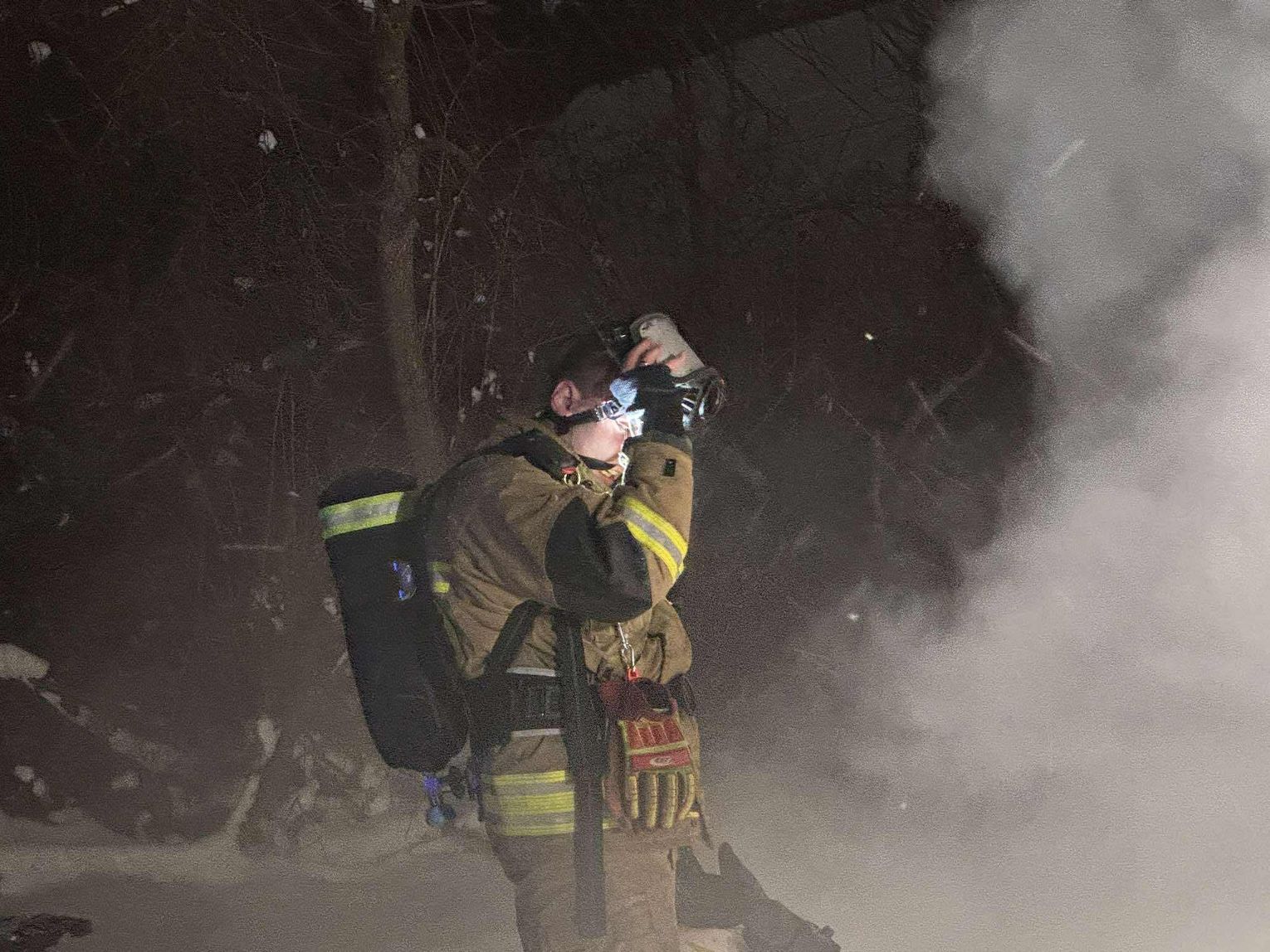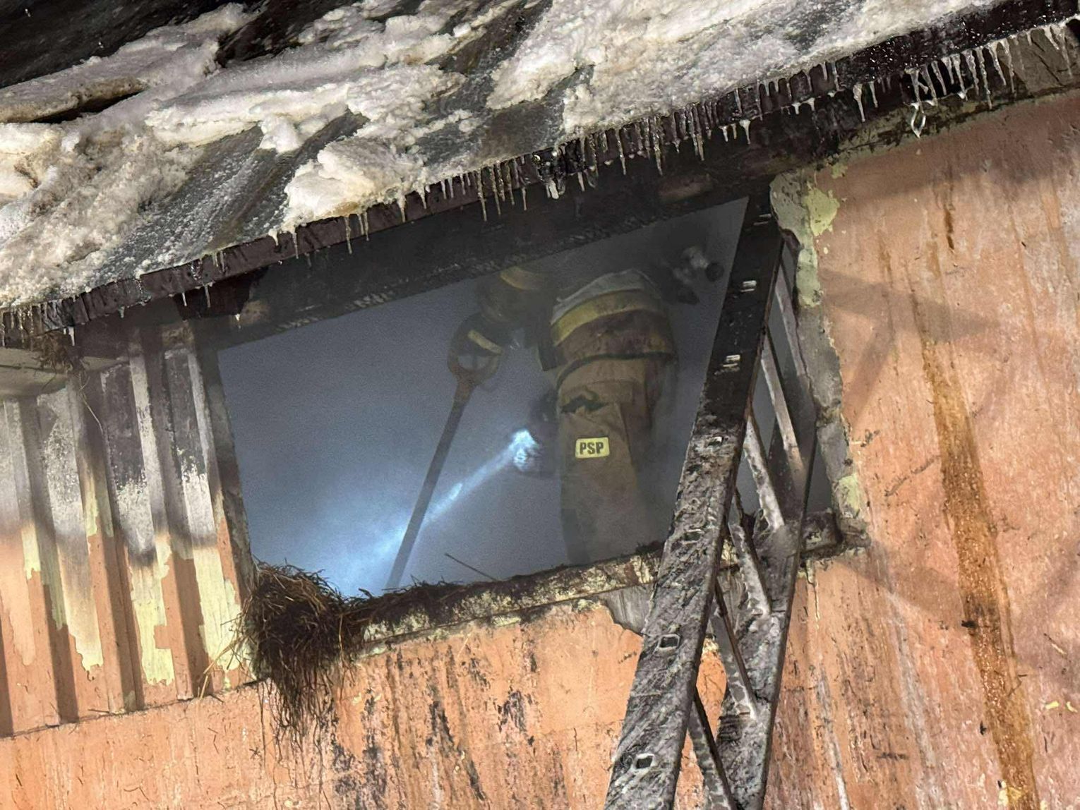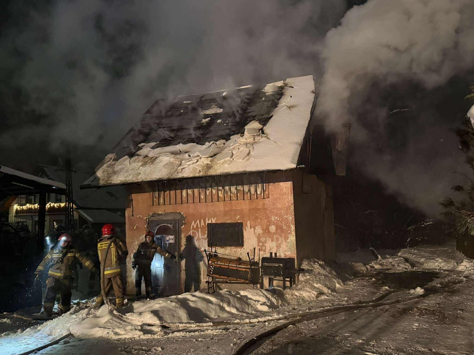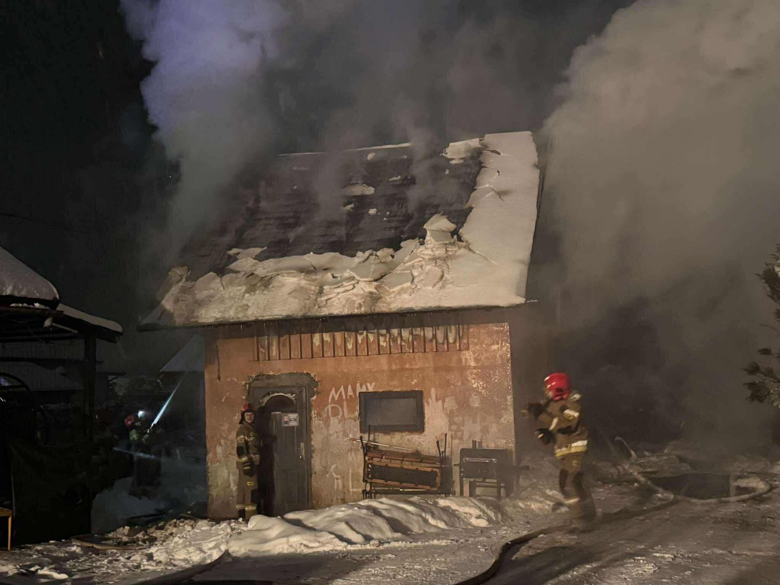 🔴 Po dotarciu na miejsce utworzone zostaje zasilanie z naszych samochodów do jednostek pracujących na miejscu. Pierwsza rota w aparatach OUO przystępuje do pomocy w gaszeniu budynku z zewnątrz a następnie wewnątrz. Podczas próby ugaszenia budynku wewnątrz dochodzi do niekontrolowanych wybuchów środków znajdujących się w środku. Wszyscy ratownicy zostają wycofani. Po szybkiej rozmowie z KDR wykonujemy 2 otwory w jednej ze ścian zewnętrznych a następnie wprowadzamy prąd wody przy pomocy lancy przebijającej.