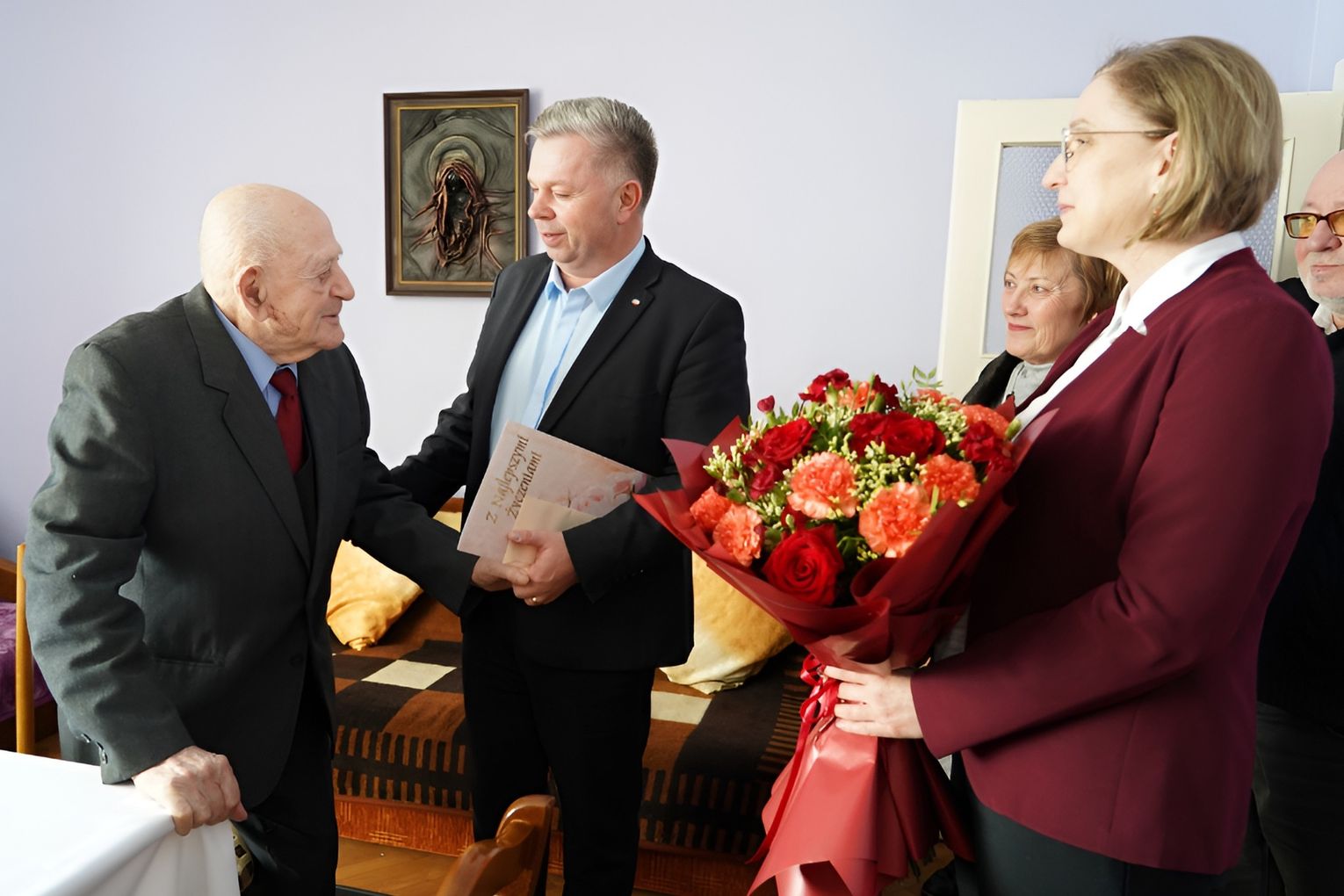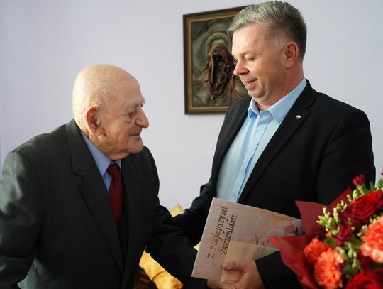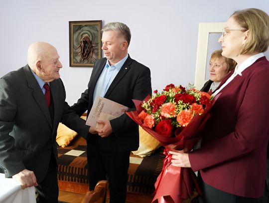 Podczas wizyty burmistrz nie tylko przekazał słowa uznania i życzliwości, ale również z uśmiechem umówił się z Panem Rudolfem na kolejne spotkanie za rok. Okazały bukiet kwiatów trafił natomiast do rąk żony jubilata – Pani Czesławy, z którą Pan Rudolf tworzy zgodne i pełne ciepła małżeństwo już od ponad siedmiu dekad.