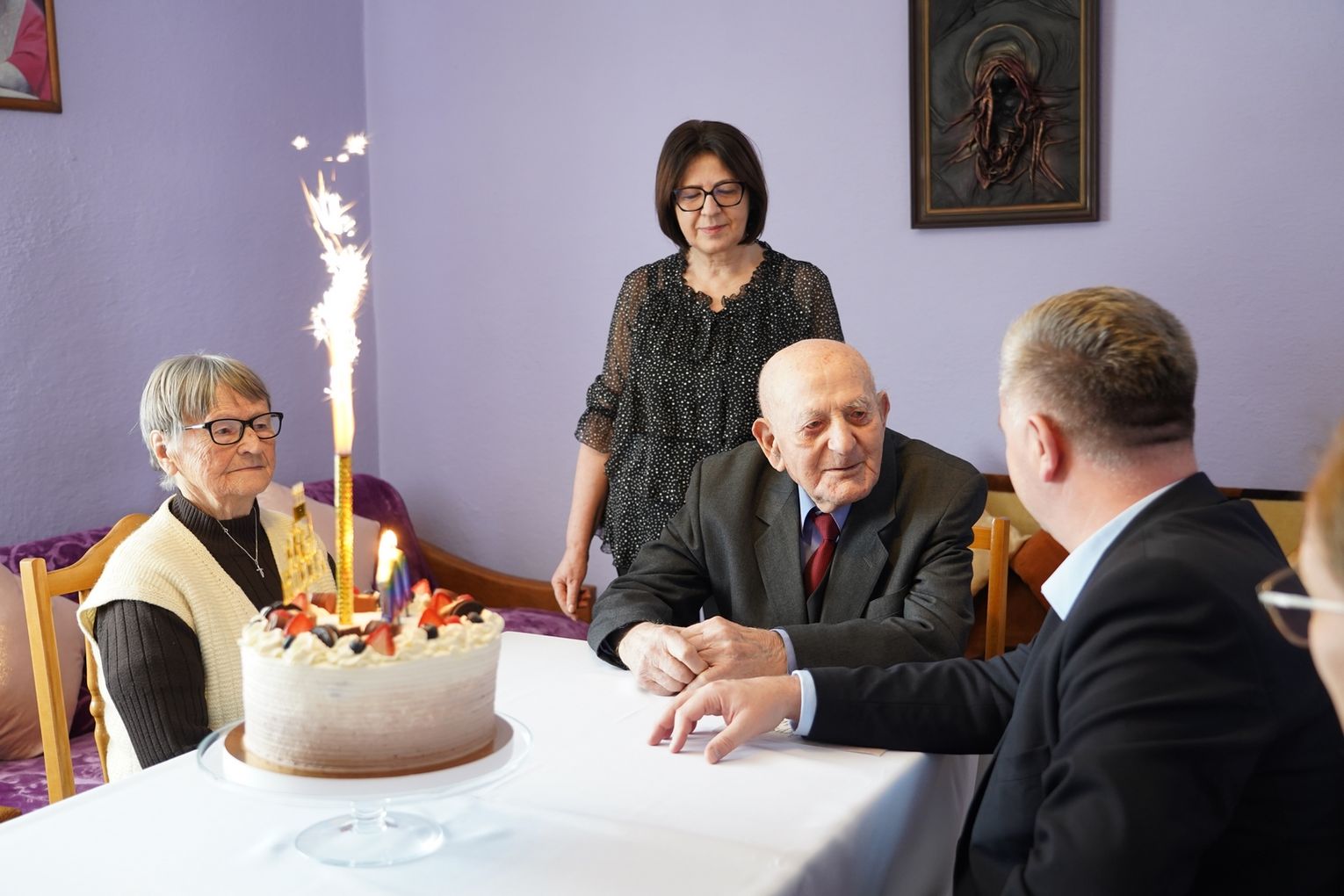 Spotkanie przebiegało w serdecznej, rodzinnej atmosferze. Najbliżsi jubilata zadbali również o pyszny tort, który dopełnił tę piękną uroczystość. Setne urodziny Pana Rudolfa Fala były czasem pełnym wzruszeń, wspomnień i radości – godnym tak wspaniałego jubileuszu.