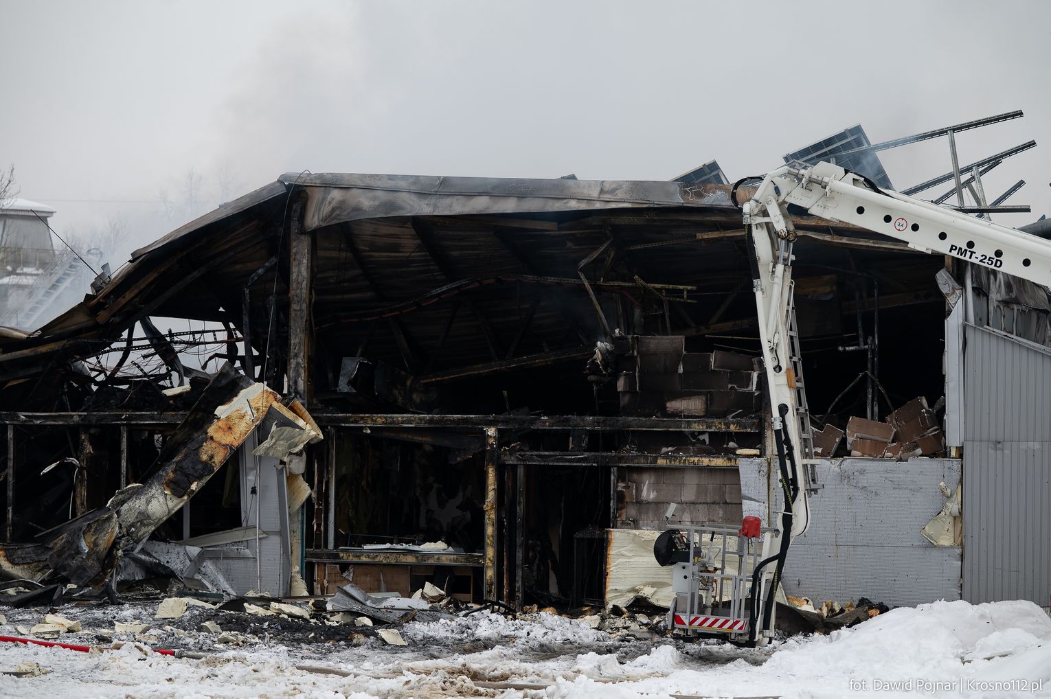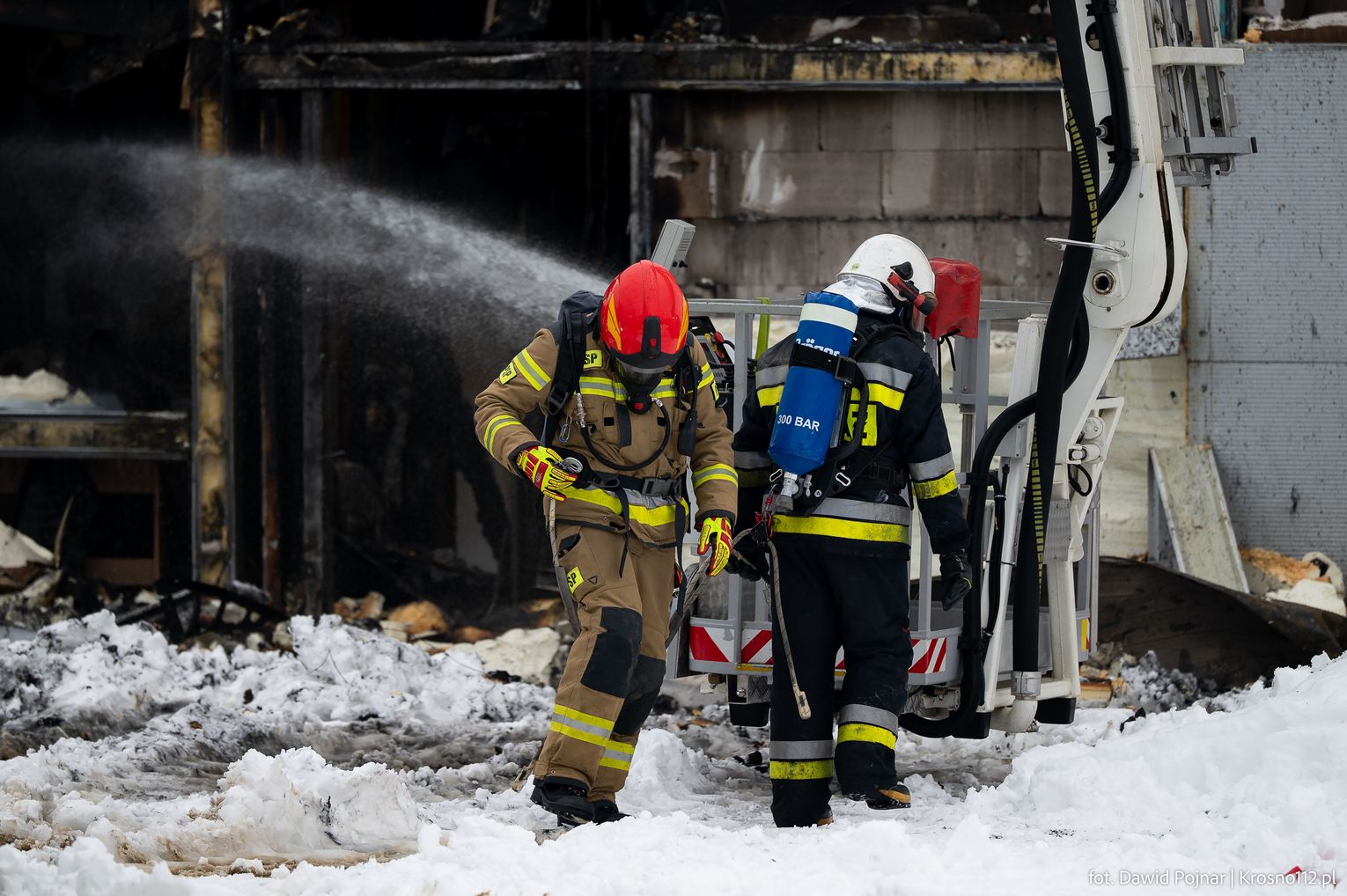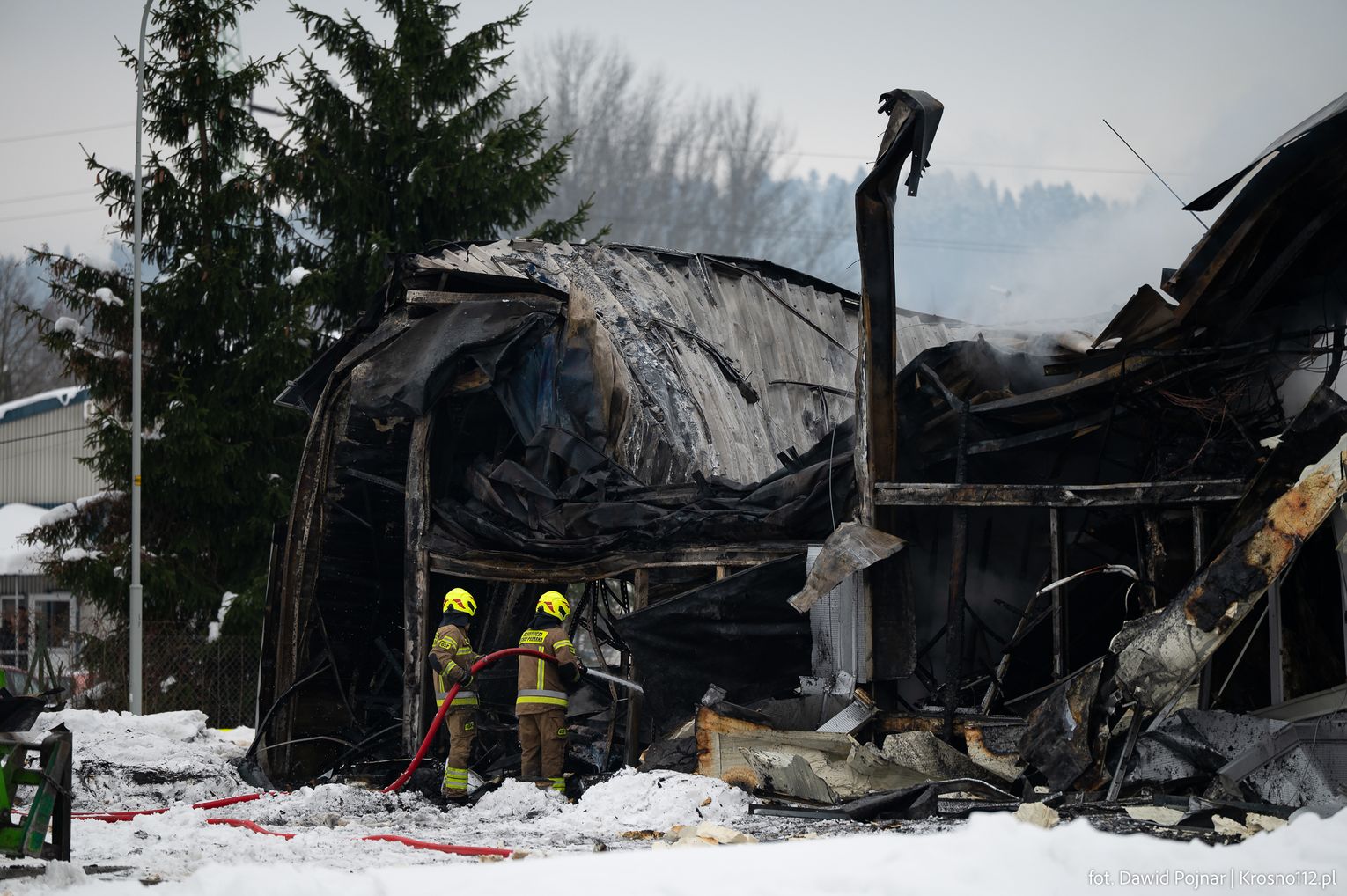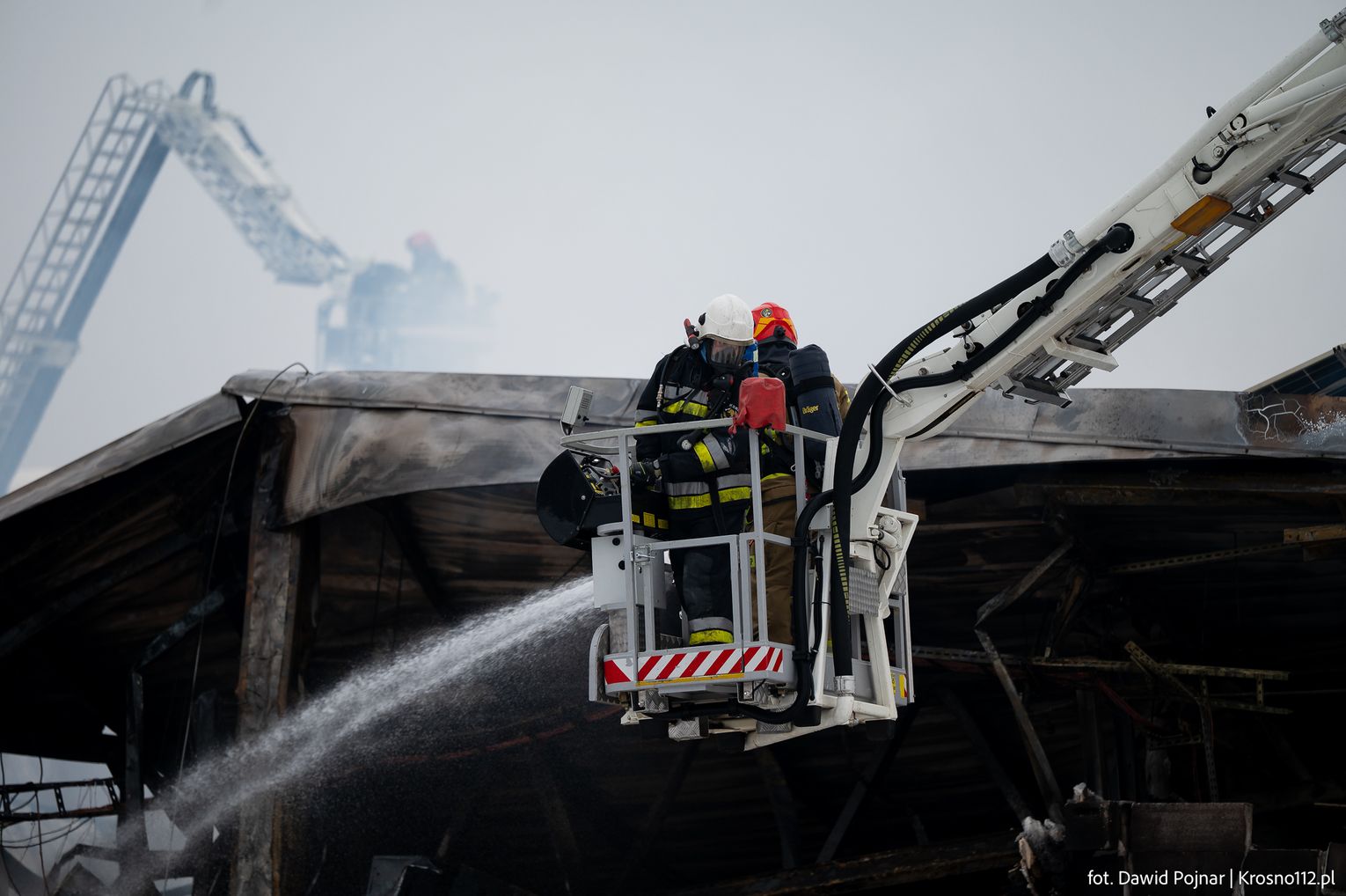 Działania gaśnicze prowadzone były głównie z zewnątrz budynku, poprzez podawanie kilku prądów wody bezpośrednio na źródło ognia. Wkrótce po rozpoczęciu akcji doszło do zawalenia się dachu hali, co dodatkowo utrudniło prowadzenie działań ratowniczo-gaśniczych i wymusiło zachowanie szczególnych środków bezpieczeństwa.